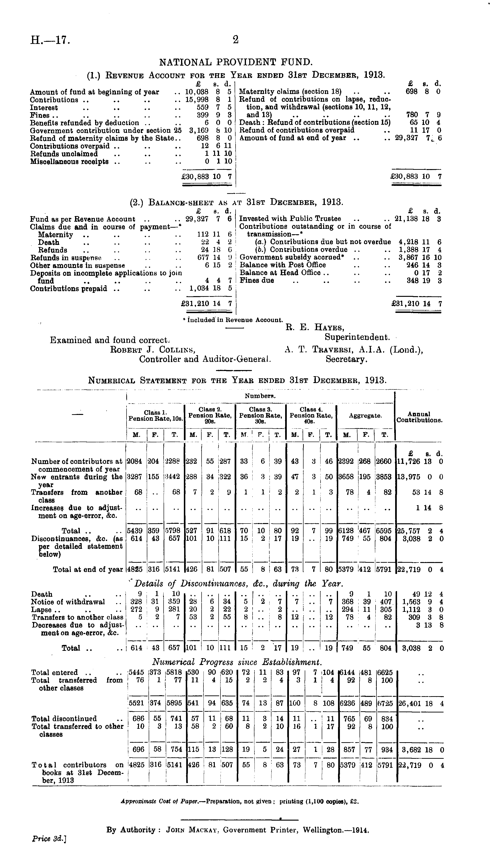 NATIONAL PROVIDENT FUND. (1.) Revenue Account for the Year ended 31st December, 1913. £ s. d. £ b. d. Amount of fund at beginning of year .. 10,038 8 5 Maternity claims (section 18) .. .. 698 8 0 Contributions .. .. .. .. 15,998 8 1 Refund of contributions on lapse, reduoInterest .. .. .. .. 559 7 5 tion, and withdrawal (sections 10, 11, 12, Fines .. .. .. .. .. 399 9 3 and 13) .. .. .. .. 780 7 9 Benefits refunded by deduction .. .. 6 0 0 Death : Refund of contributions (section 15) 65 10 4 Government contribution under section 25 3,169 8 10 Refund of contributions overpaid .. 11 17 0 Refund of maternity claims by the State.. 698 8 0 Amount of fund at end of year .. .. 29,327 7 L 6 Contributions overpaid .. .. .. 12 6 11 Refunds unclaimed .. .. .. 111 10 Miscellaneous receipts .. .. .. 0 1 10 £30,883 10 7 £30,883 10 7 (2.) Balance-sheet ah at 31st December, 1913. £ s. d. I £ s. d. Fund as per Revenue Account .. .. 29,327 7 6 Invested with Public Trustee .. .. 21,138 18 3 Claims due and in course of payment —* | Contributions outstanding or in course of Maternity .. .. .. .. 112 11 6 I transmission— * Death .. .. .. .. 22 4 2 (a.) Contributions due but not overdue 4,218 11 6 Refunds .. .. .. .. 24 18 6 (6.) Contributions overdue .. .. 1,388 17 4 Refunds in suspense .. .. 677 14 9 Government subsidy accrued* .. .. 3,867 16 10 Other amounts in suspense .. .. 615 2 Balance with Post Office .. .. 246 14 3 Deposits on incomplete applications to join Balance at Head Office .. .. .. 017 2 fund .. .. .. .. 447 Fines due .. .. .. .. 348 19 3 Contributions prepaid .. .. .. 1,034 18 5 £31,210 14 7 £31,210 14 7 * included in Revenue Account. R. E. Hayes, Examined and found correct. Superintendent. Robert J. Collins, A. T. Traversi, A.I.A. (Lond.), Controller and Auditor-General. Secretary.