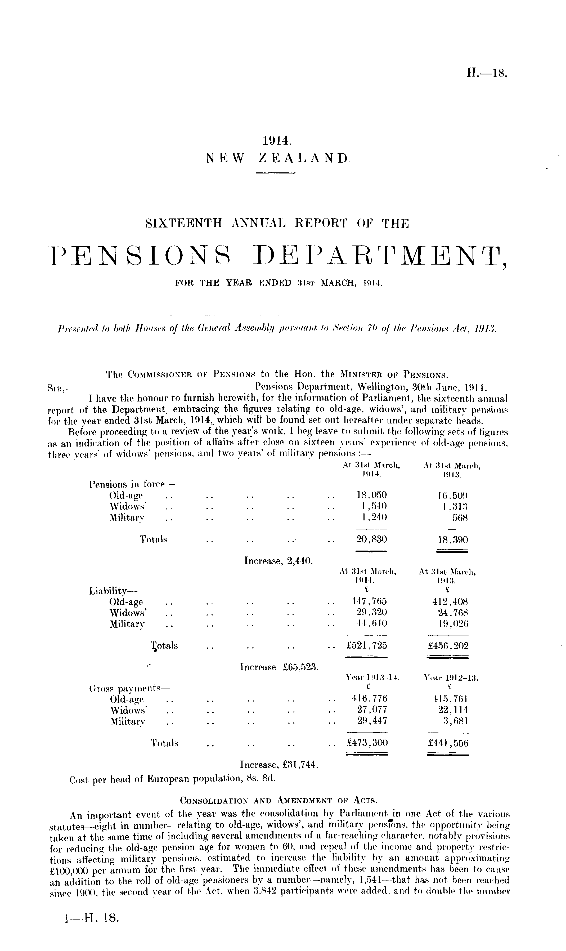 Tin 1 Commissioner of Pensions to the Hon. the Ministeb of Pensions. Sin, — Pensions Department, Wellington. 30th June, 1914. I have the honour to furnish herewith, for the information of Parliament, the sixteenth annual report of the Department embracing the figures relating to old-age, widows', and military pensions for the year ended 31st March. 1914, which will be found set out hereafter under separate heads. Before proceeding to a review of the year's work. I beg leave to submit the following sets of figures as an indication of the position of affairs after close on sixteen years' experience of old-age pensions. three years' of widows' pensions, and two years' of military pensions: At :)lsl Much. At :tlst March, 1914. 1913. Pensions in force— Old-age .. .. .. .. .. 18,060 111.509 Widows' .. .. .. .. .. I. oil) 1.31:; Military .. .. .. .. .. 1,240 568 Totals .. .. ..■ .. 20,830 18,390 Increase. 2,1 10. At :slst March, At :;lst March, 1(114. 1913. Liability — c £ Old-age .. .. .. .. .. 447.7(15 412,408 Widows' .. .. .. .. .. 29,320 24,768 Military .. .. .. .. .. 44,640 19,026 Totals .. .. .. .. £521,725 £456,202 Increase £65,523. Year 1913-14. Year 1912-13. (rross payments — E £ Old-age .. .. .. •• ■• IKi.77(i US,7jBJ Widows' .. .. .. .. .. 27,077 22.111 Military 29,447 3,681 Totals .. .. .. .. £473.3(H) £441,556 Increase, £31,744. Cost per head of European population, Bs. Bd. Consolidation and Amendment of Acts. An important event of the year was the consolidation by Parliament in one Act of the various statutes-eight in number—relating to old-age, widows', and military pensions, the opportunity being taken at the same time of including several amendments of a far-reaching character, notably provisions for reducing the old-age pension age for women to (id. and repeal of the income and property restrictions affecting military pensions, estimated to increase the liability by an amount approximating £100.(XX) per annum for the first year. The immediate effect of these amendments has been to cause ah addition to the roll of old-age pensioners by a Dumber namely, 1,541 that has not been reached since I9()0. the second year of the Act. when 3,842 participants were added, and to double the number