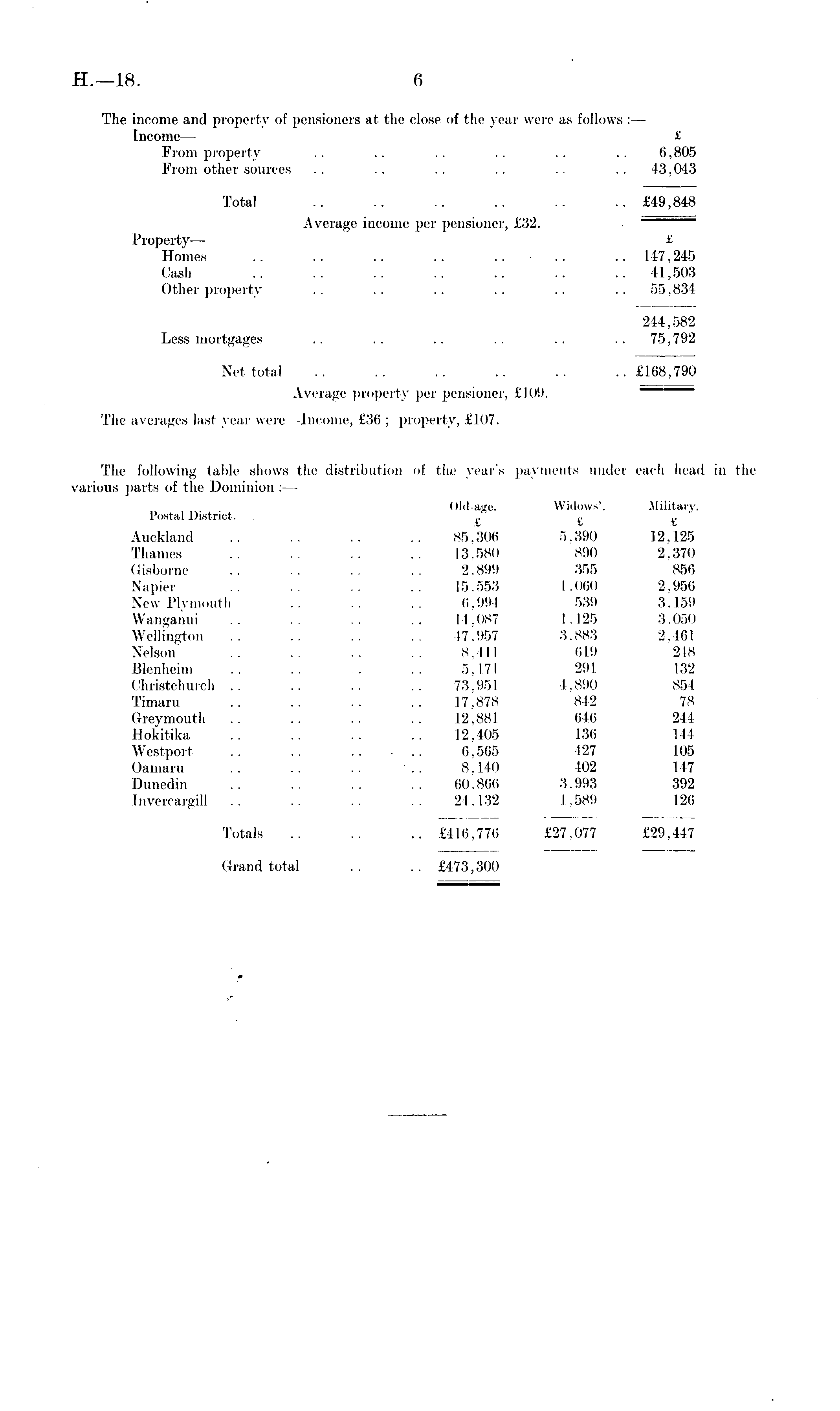 The income and property of pensioners at the close of the year were as follows : — Income— £ From property .. .. .. .. .. .. 6,805 From other sources .. .. .. .. .. .. 43,043 Total .. .. .. .. .. .. £49,848 Average income per pensioner, £32. . Property — £ Homes .. .. .. .. ..... .. 147,245 Cash .. .. .. .. .. .. .. 41,503 Other property .. .. .. .. .. .. 55,834 211,582 Less mortgages .. .. .. .. .. .. 75,792 Net total .. .. .. .. .. .. £168,790 Average property per pensioner, £109. The averages last year were -Income, £36; property, £107. The following table shows the distribution of the year's payments under each head in the various parts of the Dominion : — Old-age. Widows'. Military. Postal District. c £ £ Auckland .. .. .. .. 85,306 5,390 12.125 Thames .. .. .. .. 13,580 890 2.370 Gisborne .. .. .. .. 2.899 355 856 Napier .. .. .. .. 15,553 1,060 2,956 New Plymouth .. .. .. 6,994 539 3.159 Wanganui .. .. .. .. 11.087 1,125 3.050 Wellington .. .. .. .. 17,957 3.88:; 2,461 Nelson .. .. .. .. 8,411 619 248 Blenheim .. .. . .. 5.171 291 132 Christchurch .. .. .. .. 73.951 1,890 854 Timaru .. .. .. .. 17.878 812 78 Greymouth .. .. .. .. 12,881 646 211 llokitika .. .. .. .. 12,405 136 111 West pori .. .. .. ... 6,565 427 105 Oamaru .. .. .. .. 8,140 K)2 117 Dunedin .. .. .. .. 60,866 3,993 392 Invercargill .. .. .. .. 21.132 1.589 126 Totals .. .. .. £416,776 £27.077 £29,447 Grand total .. .. £473,300