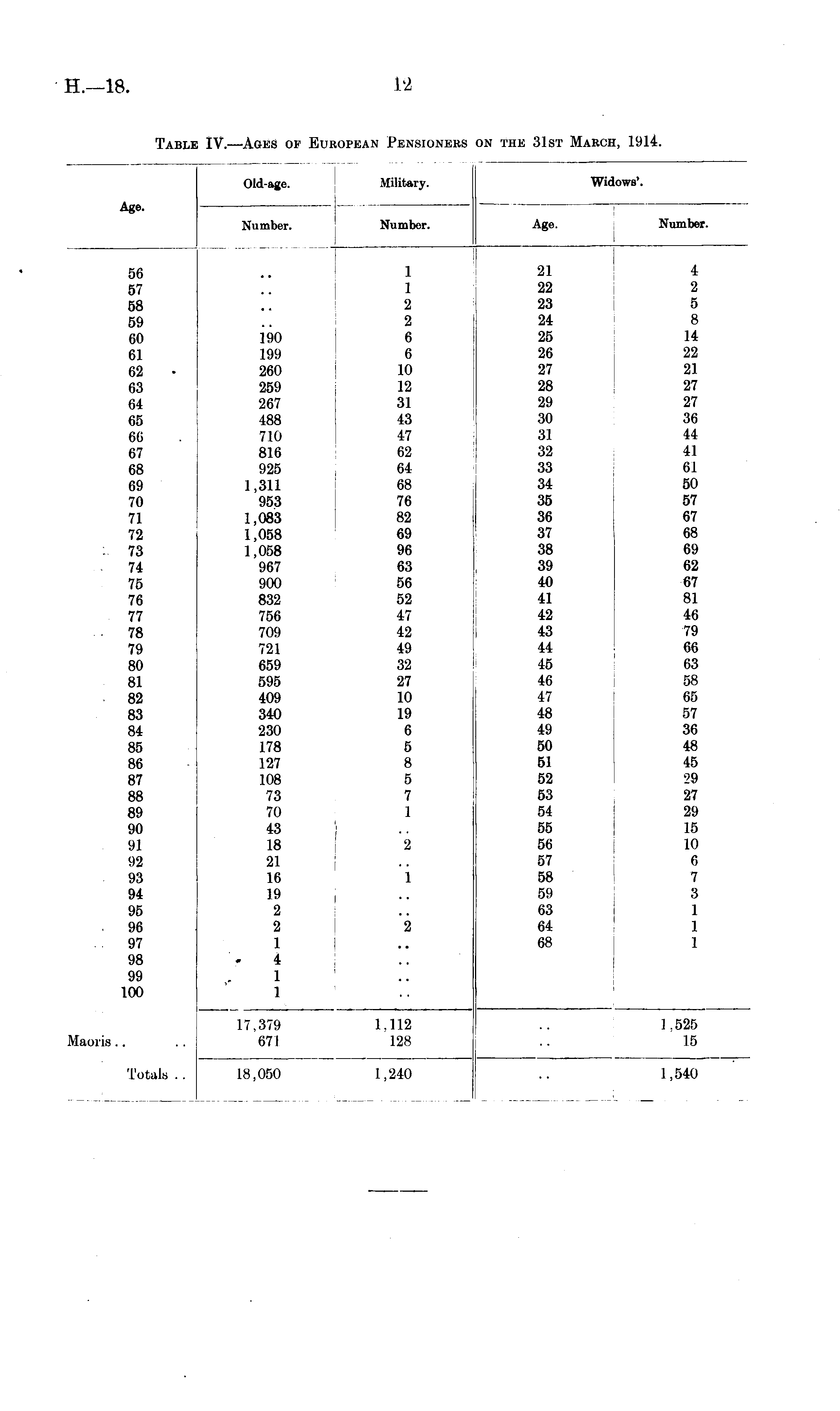 Old-age. Military. Widows'. Age. Number. Number. Age. Number. 56 57 58 59 60 61 62 63 64 65 66 67 68 69 70 71 72 73 74 75 76 77 78 79 80 81 82 83 84 85 86 87 88 89 90 91 92 93 94 95 96 97 98 99 100 190 199 260 259 267 488 710 816 925 1,311 953 1,083 1,058 1,058 967 900 832 756 709 721 659 595 409 340 230 178 127 108 73 70 43 18 21 16 19 2 2 1 4 1 1 1 1 2 2 6 6 10 12 31 43 47 62 64 68 76 82 69 96 63 56 52 47 42 49 32 27 10 19 6 5 8 5 7 1 2 1 2 21 22 23 24 25 26 27 28 29 30 31 32 33 34 35 36 37 38 39 40 41 42 43 44 45 46 47 48 49 50 51 52 53 54 55 56 57 58 59 63 64 68 4 2 5 8 14 22 21 27 27 36 44 41 61 50 57 67 68 69 62 67 81 46 79 66 63 58 65 57 36 48 45 29 27 29 15 10 6 7 3 1 1 1 Maoris 17.379 671 1.112 128 1.525 16 Totals .. 1,540 18,050 1,240