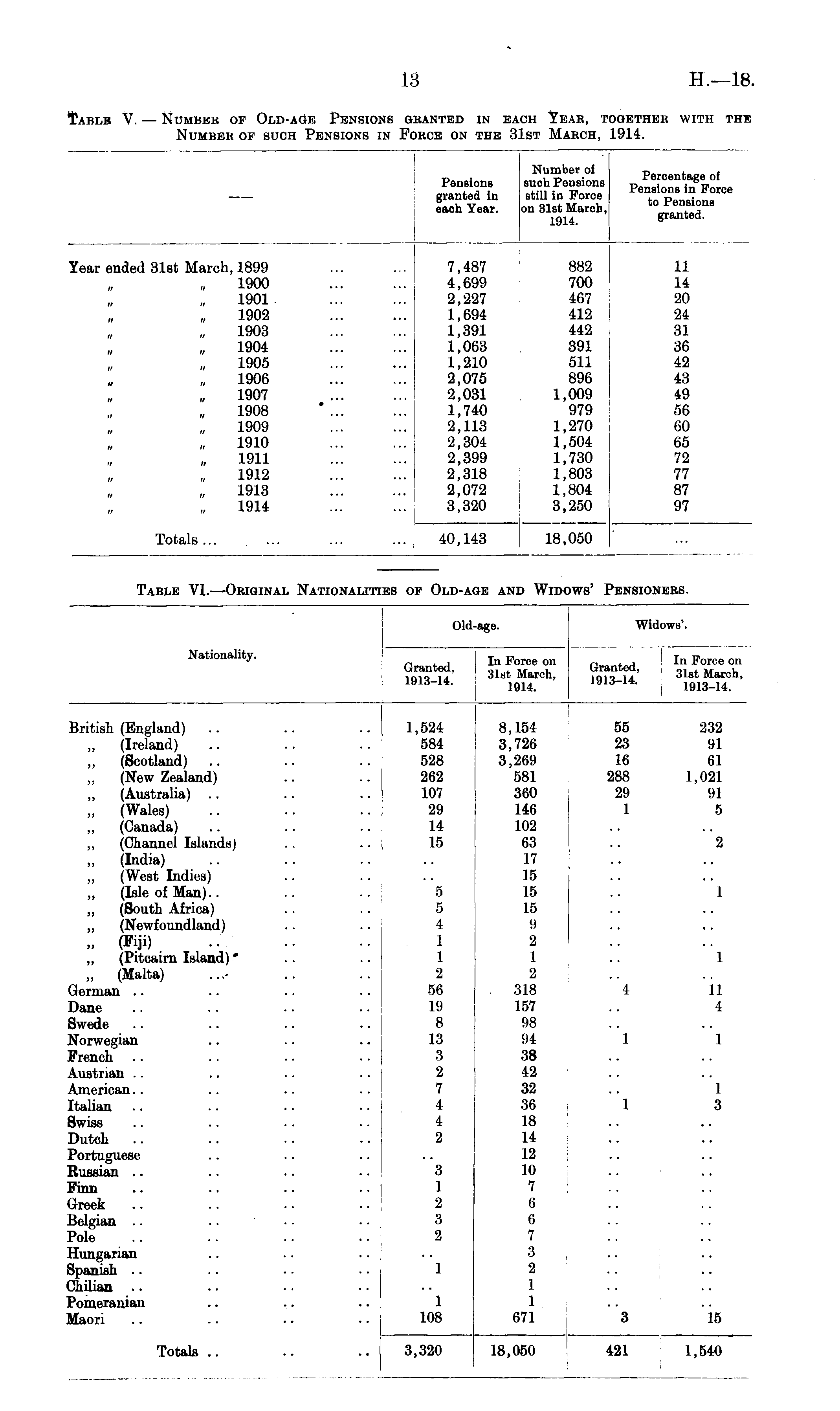 Old-age. Widows'. Nationality. Granted, 1913-14. In Force on 31st March, 1914. Granted. 1913-14. In Force on 31st March, 1913-14. British (England) ,, (Ireland) (Scotland) .. „ (New Zealand) ,, (Australia) „ (Wales) ,, (Canada) ,, (Channel Islands) „ (India) ,, (West Indies) „ (Isle of Man).. ,, (South Africa) ,, (Newfoundland) „ (Fiji) „ (Pitcairn Island)" „ (Malta) German Dane Swede 1,524 584 528 262 107 29 14 15 8,154 3,726 3,269 581 360 146 102 63 17 15 15 15 9 2 1 2 318 157 98 94 38 42 32 36 18 14 12 10 7 6 6 7 3 2 1 1 671 55 23 16 288 29 1 4 1 1 3 232 91 61 1,021 91 5 2 1 1 11 4 1 1 3 15 5 5 4 1 1 2 56 19 8 13 3 2 7 4 4 2 Norwegian French Austrian American Italian Swiss Dutch Portuguese Russian .. Klnn Greek Belgian Pole 3 1 2 3 2 Hungarian Spanish Chilian Pomeranian Maori 1 1 108 Totals .. 3,320 18,050 421 1,540