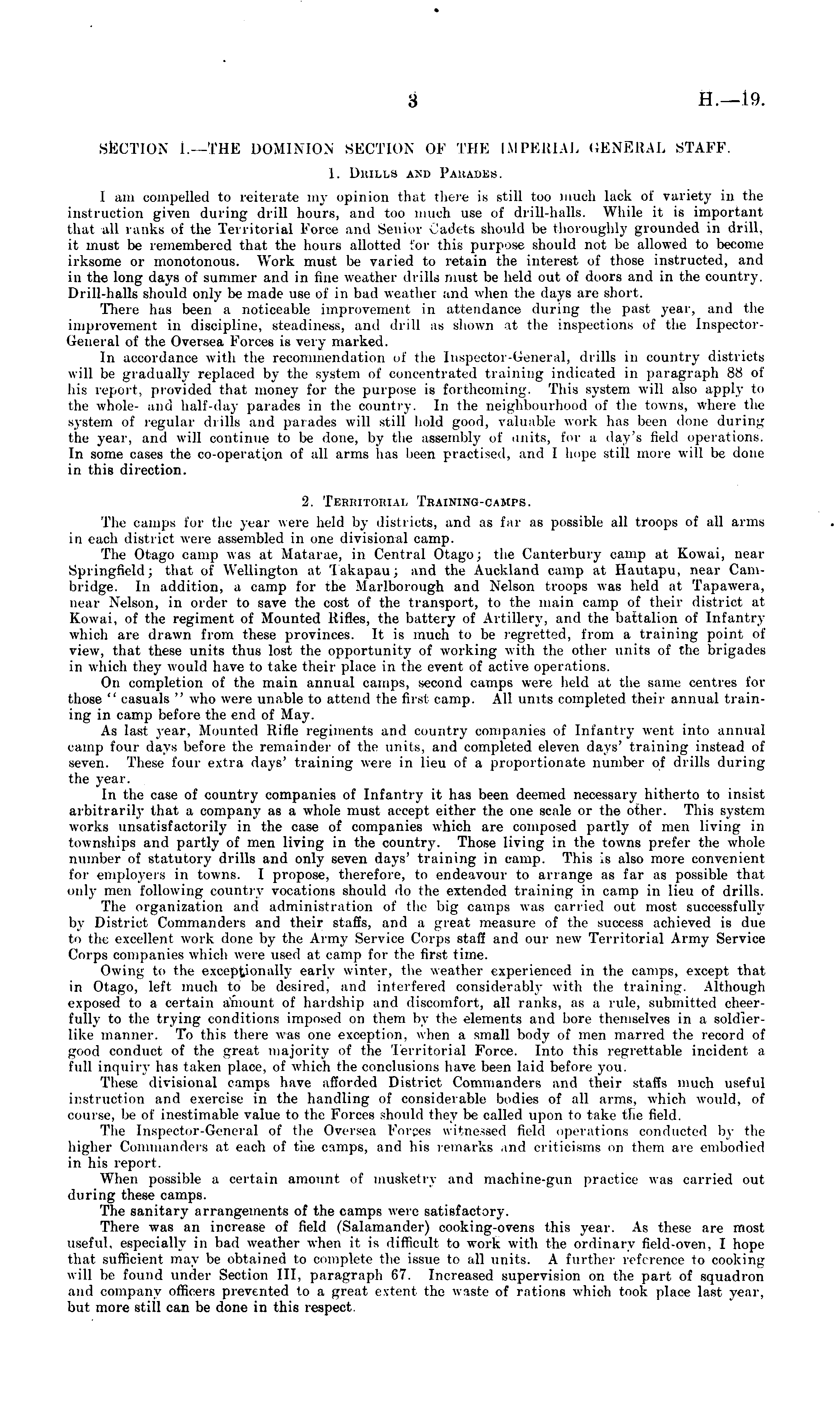 SECTION I.—THE DOMINION SECTION OF THE IMPERIAL GENERAL STAFF. 1. DItILLS AND PaHADES. I am compelled to reiterate htj opinion thai there is still too much lack of variety in the instruction given during drill hours, and too much use of drill-halls. While it is important that all ranks of the Territorial Force and Senior Cadets should be thoroughly grounded in drill, it must be remembered that the hours allotted for this purpose should not be allowed to become irksome or monotonous. Work must be varied to retain the interest of those instructed, and in the long days of summer and in fine weather drills must be held out of doors and in the country. Drill-halls should only be made use of in bad weather and when the days are short. There has been a noticeable improvement in attendance during the past year, and the improvement in discipline, steadiness, and drill as shown at the inspections of the InspeotortJeneral of the Oversea Forces is very marked. In accordance with the recommendation of the Inspector-General, drills in country districts will be gradually replaced by the system of concentrated training indicated in paragraph 88 of his report, provided that money for the purpose is forthcoming. This system will also apply to the whole- and half-day parades in the country. In the neighbourhood 'if the towns, where the system of regular drills and parades will still hold good, valuable work has been done during the year, and will continue to be done, by the assembly of units, tor a day's Held operations. In some cases the co-operation of all arms has been practised, and I hope still more will be done in this direction. 2. Territorial Training-camps. The camps for the year were held by districts, and as far as possible all troops of all arms in each district were assembled in one divisional camp. The Otago camp was at Matarae, in Central Otago; the Canterbury camp at Kowai, near Springfield; that of Wellington at Takapau; and the Auckland camp at Sautapu, near Cambridge. In addition, a camp for the Marlborough and Nelson troops was held at Tapawera, near Nelson, in order to save the cost of the transport, to the main camp of their district at Kowai, of the regiment of Mounted Rifles, the battery of Artillery, and the battalion of Infantry which are drawn from these provinces. It is much to be regretted, from a training point of view, that these units thus lost the opportunity of working with the other units of the brigades in which they would have to take their place in the event of active operations. On completion of the main annual camps, second camps were held at the same centres for those " casuals " who were unable to attend the first camp. All units completed their annual training in camp before the end of May. As last j'ear, Mounted Rifle regiments and country companies of Infantry went into annual camp four days before the remainder of the units, and completed eleven days' training instead of seven. These four extra days' training were in lieu of a proportionate number of drills during the year. In the case of country companies of Infantry it has been deemed necessary hitherto to insist arbitrarily that a company as a whole must accept either the one scale or the other. This system works unsatisfactorily in the case of companies which are composed partly of men living in townships and partly of men living in the country. Those living in the towns prefer the whole number of statutory drills and only seven days' training in camp. This is also more convenient for employers in towns. I propose, therefore, to endeavour to arrange as far as possible that only men following country vocations should do the extended training in camp in lieu of drills. The organization and administration of the big camps was carried out most successfully by District Commanders and their staffs, and a great measure of the success achieved is due to the excellent work done by the Army Service Corps staff and our new Territorial Army Service Corps companies which were used at camp for the first time. Owing to the exceptionally early winter, the weather experienced in the camps, except that in Otago, left much to be desired, and interfered considerably with the training. Although exposed to a certain amount of hardship and discomfort, all ranks, as a rule, submitted cheerfully to the trying conditions imposed on them by the elements and bore themselves in a soldierlike manner. To this there was one exception, when a small body of men marred the record of good conduct of the great majority of the Territorial Force. Into this regrettable incident a full inquiry has taken place, of which the conclusions have been laid before you. These divisional camps have afforded District Commanders and their staffs much useful instruction and exercise in the handling of considerable bodies of all arms, which would, of course, be of inestimable value to the Forces should they be called upon to take the field. The Inspector-General of the Oversea Foroes witnessed field operations conducted by the higher Commanders at each of the camps, and his remarks and criticisms on them are embodied in his report. When possible a certain amount of musketry and machine-gun practice was carried out during these camps. The sanitary arrangements of the camps were satisfactory. There was an increase of field (Salamander) cooking-ovens this year. As these are most useful, especially in bad weather when it is difficult to work with the ordinary field-oven, I hope that sufficient may be obtained to complete the issue to all units. A further reference to cooking will be found under Section 111, paragraph 67. Increased supervision on the part of squadron and company officers prevented to a great extent the waste of rations which took place last year, but more still can be done in this respect.