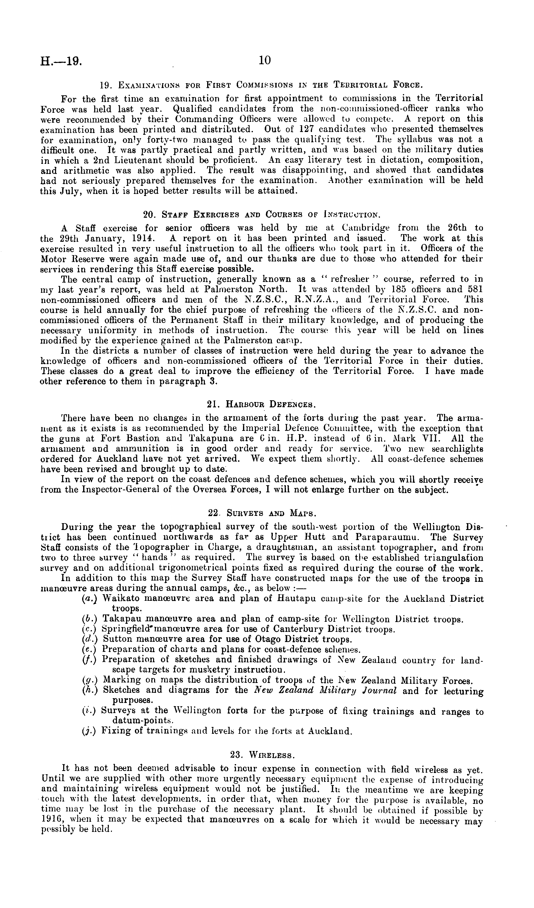 19. Examinations for First Commissions in the Tehritorial Force. For the first time an examination for first appointment to commissions in the Territorial Force was held last year. Qualified candidates from the non-commissioned-officer ranks who were recommended by their Commanding Officers were allowed to compete. A report on this examination has been printed and distributed. Out of 127 candidates who presented themselves for examination, only forty-two managed to pass the qualifying test. The syllabus was not a difficult one. It was partly practical and partly written, and was based on the military duties in which a 2nd Lieutenant should be proficient. An easy literary test in dictation, composition, and arithmetic was also applied. The result was disappointing, and showed that candidates had not seriously prepared themselves for the examination. Another examination will be held this July, when it is hoped better results will be attained. 20. Staff Exercises and Courses of Instruction. A Staff exercise for senior officers was held by me at Cambridge from the 26th to the 29th January, 1914. A report on it has been printed and issued. The work at this exercise resulted in very useful instruction to all the officers who took part in it. Officers of the Motor lteserve were again made use of, and our thanks are due to those who attended for their services in rendering this Staff exercise possible. The central camp of instruction, generally known as a " refresher " course, referred to in my last year's report, was held at Palmerston North. It was attended by 185 officers and 581 non-commissioned officers and men of the N.Z.S.C., H.N.Z.A., and Territorial Force. This course is held annually for the chief purpose of refreshing the officers of the N.Z.S.C. and noncommissioned officers of the Permanent Staff in their military knowledge, and of producing the necessary uniformity in methods of instruction. The course this year will be held on lines modified by the experience gained at the Palmerston camp. In the districts a number of classes of instruction were held during the year to advance the knowledge of officers and non-commissioned officers of the Territorial Force in their duties. These classes do a great deal to improve the efficiency of the Territorial Force. I have made other reference to them in paragraph 3. 21. Harbour Defences. There have been no changes in the armament of the forts during the past year. The armament as it exists is as recommended by the Imperial Defence Committee, with the exception that the guns at Fort Bastion and Takapuna are G in. H.P. instead of 6 in. Mark VII. All the armament and ammunition is in good order and ready for service. Two new searchlights ordered for Auckland have not yet arrived. We expect them shortly. All coast-defence schemes have been revised and brought up to date. In view of the report on the coast defences and defence schemes, which you will shortly receive from the Inspector-General of the Oversea Forces, I will not enlarge further on the subject. 22. Surveys and Maps. During the year the topographical survey of the south-west portion of the Wellington Dietiict has been continued northwards as far as Upper Hutt and Paraparaumu. The Survey Staff consists of the Topographer in Charge, a draughtsman, an assistant topographer, and from two to three survey " hands " as required. The survey is based on the established triangulafion survey and on additional trigonometrical points fixed as required during the course of the work. In addition to this map the Survey Staff have constructed maps for the use of the troops in manoeuvre areas during the annual camps, &c, as below : — (a.) Waikato manoeuvre area and plan of Hautapu campsite for the Auckland District troops. (b.) Takapau manoeuvre area and plan of camp-site for Wellington District troops. (c.) Springfield*manoeuvre area for use of Canterbury District troops. (d.) Sutton manoeuvre area for use of Otago District troops, (c.) Preparation of charts and plans for coast-defence schemes. (/.) Preparation of sketches and finished drawings of New Zealand country for landscape targets for musketry instruction. ((/.) Marking on maps the distribution of troops of the Zealand Military Forces. (h.) Sketches and diagrams for the New Zealand Military Journal and for lecturing purposes. (i.) Surveys at the Wellington forts for the purpose of fixing trainings and ranges to datum-points. (j.) Fixing of trainings and levels for the forts at Auckland. 23. Wikeless. It has not been deemed advisable to incur expense in connection with field wireless as yet. Until we are supplied with other more urgently necessary equipment the expense of introducing and maintaining wireless equipment would not be justified. In the meantime we are keeping touch with the latest developments, in order that, when money for the purpose is available, no time may be lost in the purchase of the necessary plant. It should be obtained if possible by 191G, when it may be expected that manoeuvres on a scale for which it would be necessary may possibly be held.