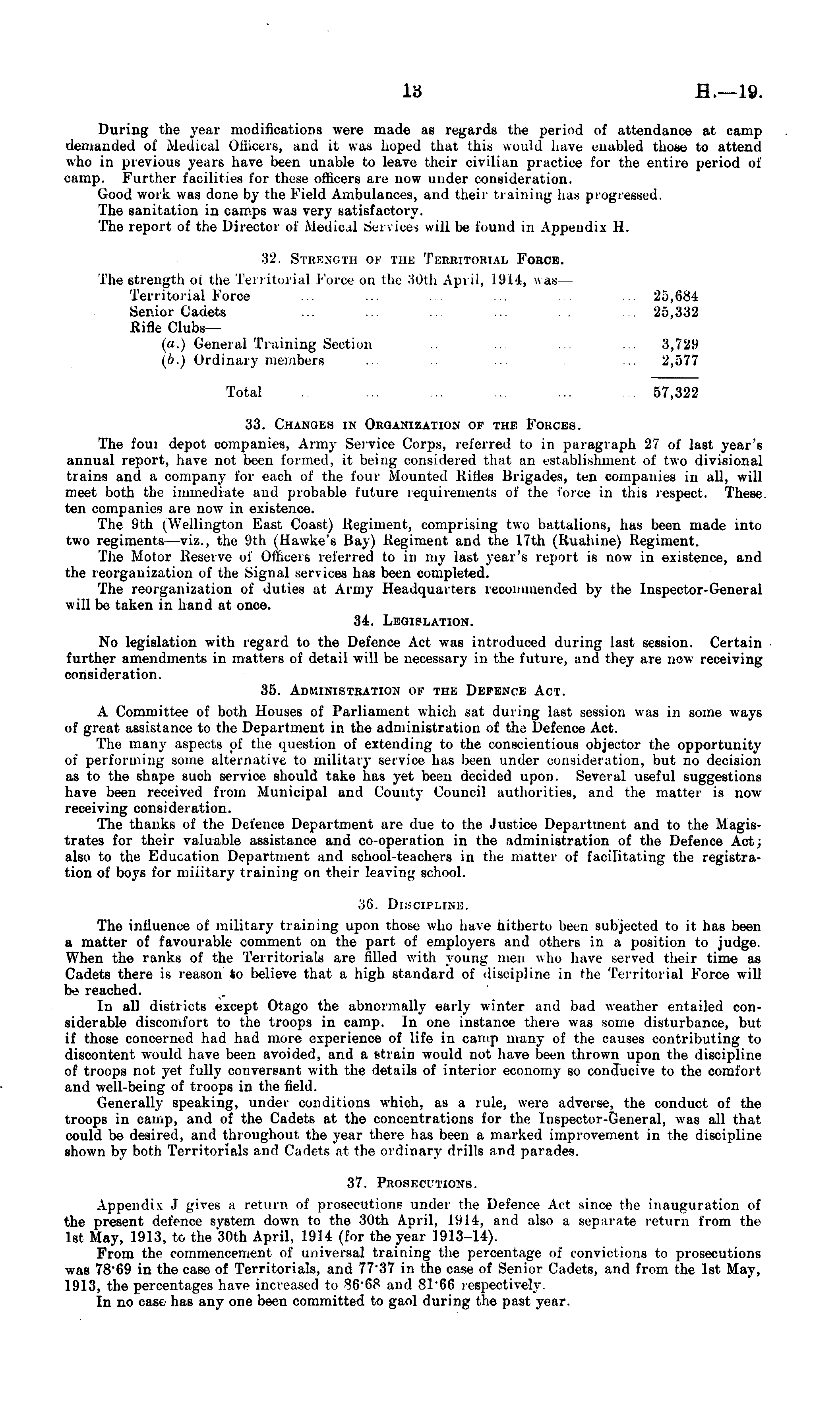 During the year modifications were made as regards the period of attendance at camp demanded of Medical Officers, and it was hoped that this would have enabled those to attend who in previous years have been unable to leave their civilian practice for the entire period of camp. Further facilities for those officers are now under consideration. Good work was done by the Field Ambulances, and their training has progressed. The sanitation in camps was very satisfactory. The report of the Director of Medical Services will be found in Appendix H. 32. Strength ok the Territorial Force. The strength of the Territorial Force on the -JJOth April, i9li, «as — Territorial Force ... ... ... ... ... ... 25,684 Senior Cadets ... ... .. ... . . ... 25,332 Rifle Clubs— (a.) General Training Section .. ... ... ... 3,729 (6.) Ordinary members ... . ... ~ ... 2,577 Total ... ... .. ... ... 57,322 33. Changes in Organization of the Forces. The foui depot companies, Army Service Corps, referred to in paragraph 27 of last year's annual report, have not been formed, it being considered that an establishment of two divisional trains and a company for each of the four Mounted Kifles Brigades, ten companies in all, will meet both the immediate and probable future requirements of the force in this respect. These ten companies are now in existence. The 9th (Wellington East Coast) Regiment, comprising two battalions, has been made into two regiments —viz., the 9th (Hawke's Bay) Regiment and the 17th (Ruahine) Regiment. The Motor Reserve of Officers referred to in my last year's report is now in existence, and the reorganization of the Signal services has been completed. The reorganization of duties at Army Headquarters recommended by the Inspector-General will be taken in hand at once. 34. Legislation. No legislation with regard to the Defence Act was introduced during last session. Certain further amendments in matters of detail will be necessary in the future, and they are now receiving consideration. 35. Administration of the Defence Act. A Committee of both Houses of Parliament which sat during last session was in some ways of great assistance to the Department in the administration of the Defence Act. The many aspects pf the question of extending to the conscientious objector the opportunity of performing some alternative to military service has been under consideration, but no decision as to the shape such service should take has yet been decided upon. Several useful suggestions have been received from Municipal and County Council authorities, and the matter is now receiving consideration. The thanks of the Defence Department are due to the Justice Department and to the Magistrates for their valuable assistance and co-operation in the administration of the Defence Act; also to the Education Department and school-teachers in the matter of facilitating the registration of boys for military training on their leaving school. :.>6. Discipline. The influence of military training upon those who have hitherto been subjected to it has been a matter of favourable comment on the part of employers and others in a position to judge. When the ranks of the Territorials are tilled with young men who have wived their time as Cadets there is reason to believe that a high standard of discipline in the Territorial Force will hi reached. In all districts except Otago the abnormally early winter and bad weather entailed considerable discomfort to the troops in camp. In one instance there was some disturbance, but if those concerned had had more experience of life in camp many of the causes contributing to discontent would have been avoided, and a strain would not have been thrown upon the discipline of troops not yet fully conversant with the details of interior economy so conducive to the comfort and well-being of troops in the field. Generally speaking, under conditions which, as a rule, were adverse, the conduct of the troops in camp, and of the Cadets at the concentrations for the Inspector-General, was all that could be desired, and throughout the year there has been a marked improvement in the discipline shown by both Territorials and Cadets at the ordinary drills nnd parades. 37. Prosecutions. Appendix J gives a return of prosecutions under the Defence Act since the inauguration of the present defence system down to the 30th April, 1914, and also a separate return from the Ist May, 1913, to the 30th April, 1914 (for the year 1913-14). From the commencement of universal training the percentage of convictions to prosecutions was 78"69 in the case of Territorials, and 77 - 37 in the case of Senior Cadets, and from the Ist May, 1913, the percentages have increased to 86 - 68 and 8T66 respectively. In no case has any one been committed to gaol during the past year.