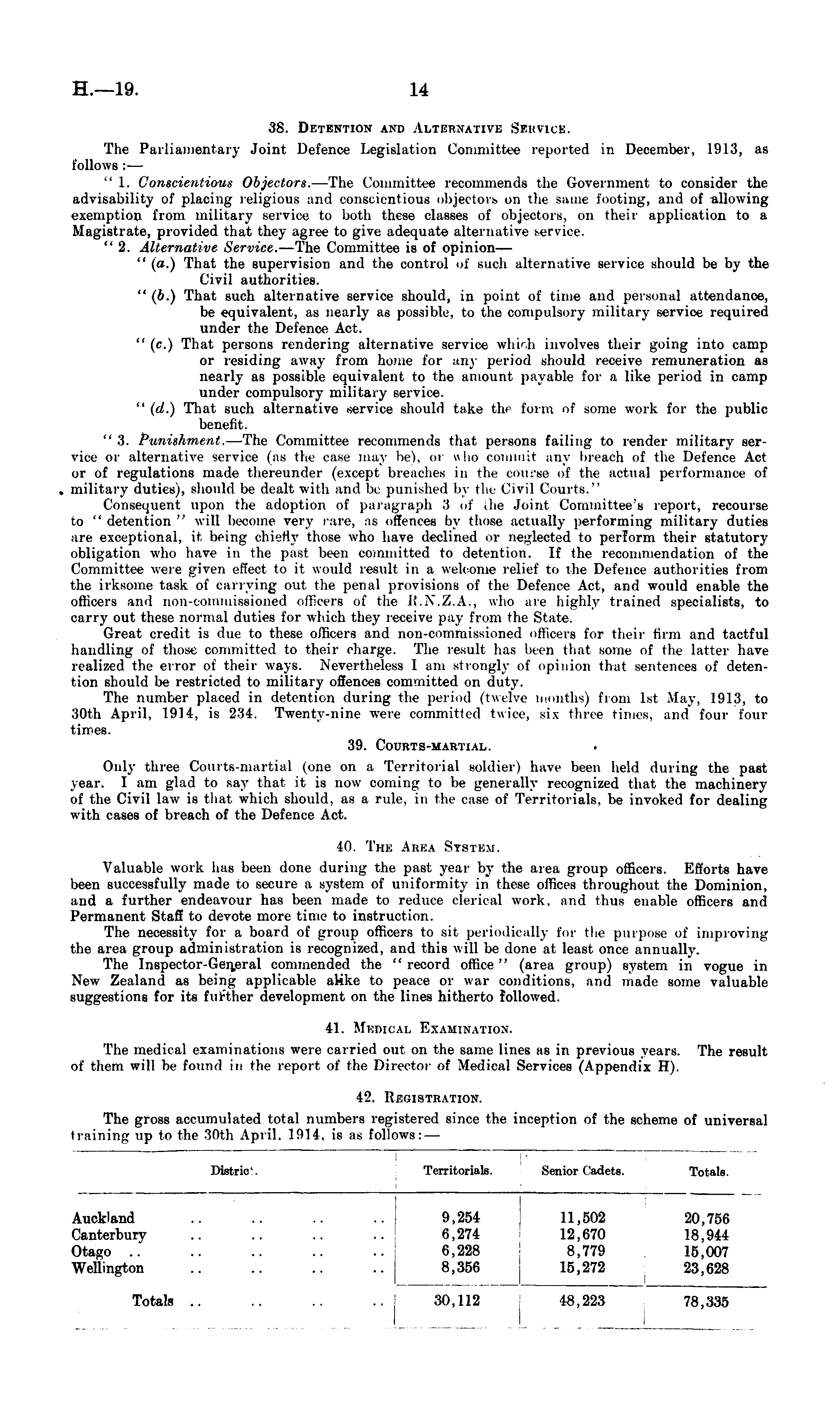 38. Detention and Alternative Service. The Parliamentary Joint Defence Legislation Committee reported in December, 1913, as follows : — " 1. Conscientious Objectors. —The Committee recommends the Government to consider the advisability of placing religious and conscientious objectors on the same footing, and of allowing exemption from military service to both these classes of objectors, on their application to a Magistrate, provided that they agree to give adequate alternative service. " 2. Alternative Service. —The Committee is of opinion— " (a.) That the supervision and the control of such alternative service should be by the Civil authorities. " (b.) That such alternative service should, in point of time and personal attendance, be equivalent, as nearly as possible, to the compulsory military service required under the Defence Act. " (c.) That persons rendering alternative service which involves their going into camp or residing away from home for any period should receive remuneration as nearly as possible equivalent to the amount payable for a like period in camp under compulsory military service. " (d.) That such alternative service should take the form of some work for the public benefit. " 3. Punishment. —The Committee recommends that persons failing to render military service or alternative service (as the ease may be), or who commit any breach of the Defence Act or of regulations made thereunder (except breaches in the course of the actual performance of military duties), should be dealt, with and be punished by the Civil Courts." Consequent upon the adoption of paragraph 3 of the Joint Committee's report, recourse to " detention " will become very fare, as offences by those actually performing military duties are exceptional, it being ohiefly those who have declined or neglected to perform their statutory obligation who have in the past been committed to detention. If the recommendation of the Committee were given effect to it would result in a welcome relief to the Defence authorities from the irksome task of carrying out the penal provisions of the Defence Act, and would enable the officers and non-commissioned officers of the R.N.Z.A., who are highly trained specialists, to carry out these normal duties for which they receive pay from the State. Great credit is due to these officers and non-commissioned officers for their firm and tactful handling of those committed to their charge. The result has been that some of the latter have realized the error of their ways. Nevertheless I am strongly of opinion that sentences of detention should be restricted to military offences committed on duty. The number placed in detention during the period (twelve months) from Ist May, 1913, to .'soth April, 1914, is 234. Twenty-nine were committed twice, six three times, and four four times. 39. Courts-martial. Only three Courts-martial (one on a Territorial soldier) have been held during the past year. I am glad to say that it is now coming to be generally recognized that the machinery of the Civil law is that which should, as a rule, in the case of Territorials, be invoked for dealing with cases of breach of the Defence Act. 40. The Abea System. Valuable work has been done during the past year by the area group officers. Efforts have been successfully made to secure a system of uniformity in these offices throughout the Dominion, and a further endeavour has been made to reduce clerical work, and thus enable officers and Permanent Staff to devote more time to instruction. The necessity for a board of group officers to sit periodically for the purpose of improving the area group administration is recognized, and this will be done at least once annually. The Inspector-Gerjeral commended the " record office" (area group) system in vogue in New Zealand as being applicable alike to peace or war conditions, and made some valuable suggestions for its further development on the lines hitherto followed. 41. Medical Examination. The medical examinations were carried out on the same lines as in previous years. The result of them will be found in the report of the Director of Medical Services (Appendix H). 42. Registration. The gross accumulated total numbers registered since the inception of the scheme of universal training up to the 30th April. 1014. is as follows: —