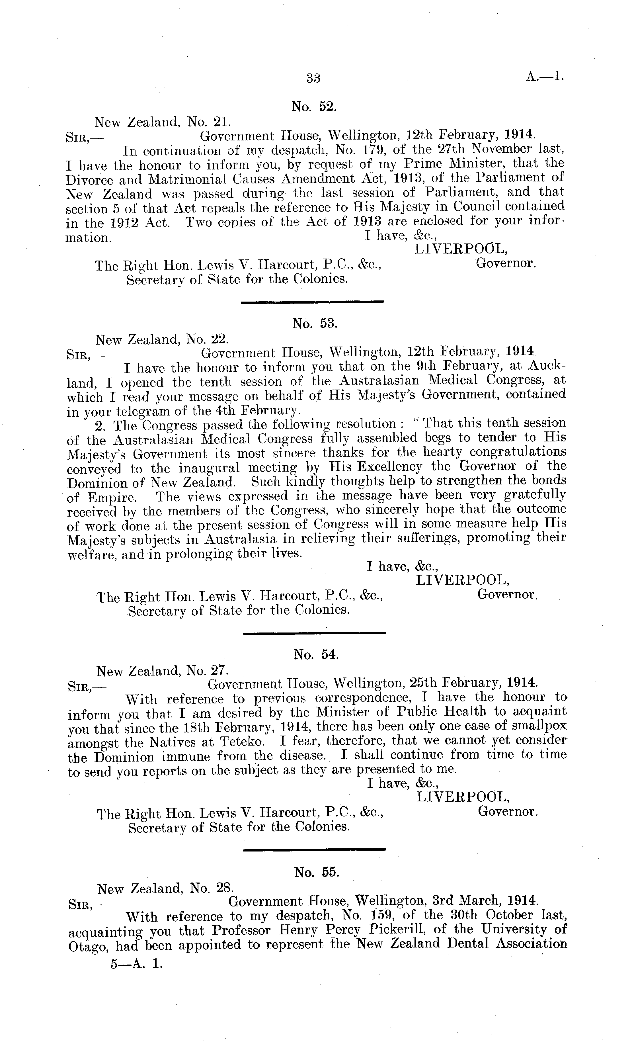 No. 53. New Zealand, No. 22. Sir,— Government House, Wellington, 12th February, 1914 I have the honour to inform you that on the 9th February, at Auckland, I opened the tenth session of the Australasian Medical Congress, at which I read your message on behalf of His Majesty's Government, contained in your telegram of the 4th February. 2. The Congress passed the following resolution : " That this tenth session of the Australasian Medical Congress fully assembled begs to tender to His Majesty's Government its most sincere thanks for the hearty congratulations conveyed to the inaugural meeting by His Excellency the Governor of the Dominion of New Zealand. Such kindly thoughts help to strengthen the bonds of Empire. The views expressed in the message have been very gratefully received by the members of the Congress, who sincerely hope that the outcome of work done at the present session of Congress will in some measure help His Majesty's subjects in Australasia in relieving their sufferings, promoting their welfare, and in prolonging their lives. I have, &c, LIVERPOOL, The Right Hon. Lewis V. Harcourt, P. 0., &c, Governor. Secretary of State for the Colonies.