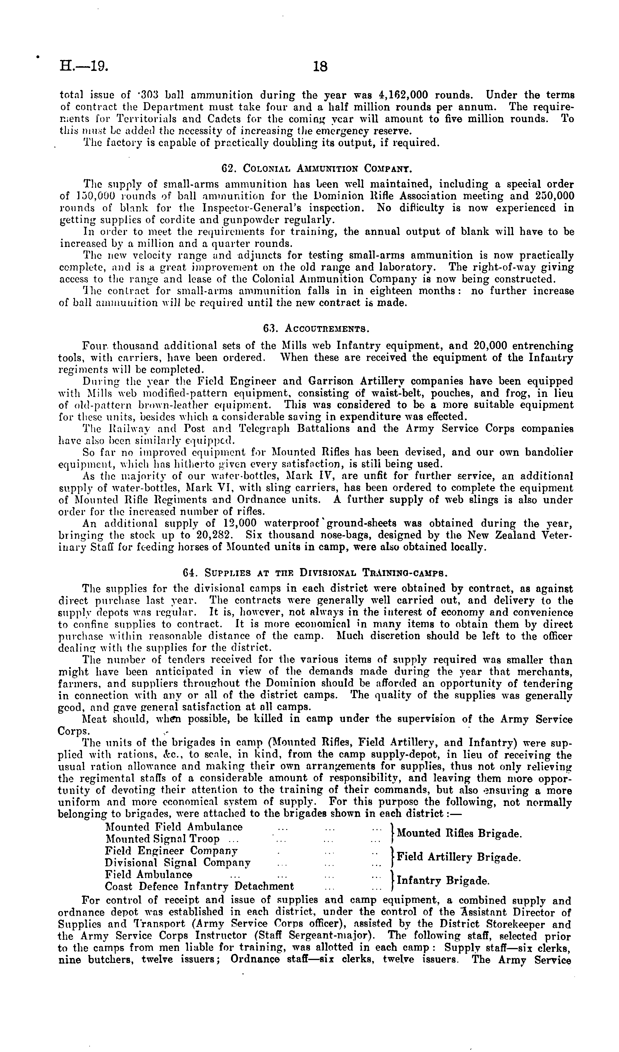 total issue of '303 ball ammunition during the year was 4,162,000 rounds. Under the terms of contract the Department must take four and a half million rounds per annum. The requirements for Territorials and Cadets for the coming year will amount to five million rounds. To this must be atldeil the necessity of increasing the emergency reserve. The factory is capable of practically doubling its output, if required. 62. Colonial Ammunition Company. The supply of small-arms ammunition has been well maintained, including a special order of 130,000 rounds of ball ammunition for the Dominion Rifle Association meeting and 250,000 rounds of blank for the Inspector-General's inspection. No difficulty is now experienced in getting supplies of cordite and gunpowder regularly. In order to meet the requirements for training, the annual output of blank will have to be increased by a million and a quarter rounds. The new velocity range and adjuncts for testing small-arms ammunition is now practically complete, and is a great improvement on the old range and laboratory. The right-of-way giving access to the range and lease of the Colonial Ammunition Company is now being constructed. The contract for small-arms ammunition falls in in eighteen months : no further increase of ball ammunition will be required until the new contract is made. 63. Accoutrements. Four thousand additional sets of the Mills web Infantry equipment, and 20,000 entrenching tools, with carriers, have been ordered. When these are received the equipment of the Infantry regiments will be completed. During the year the Field Engineer and Garrison Artillery companies have been equipped with Mills web modified-pattern equipment, consisting of waist-belt, pouches, and frog, in lieu of old-pattern brown-leather equipment. This was considered to be a more suitable equipment for these units, besides which a considerable saving in expenditure was effected. The Railway and Post and Telegraph Battalions and the Army Service Corps companies have also been similarly equipped. So far no improved equipment for Mounted Rifles has been devised, and our own bandolier equipment, which has hitherto given every satisfaction, is stili being used. As the majority of our water-bottles, Mark IV, are unfit for further service, an additional supply of water-bottles, Mark VI, with sling carriers, has been ordered to complete the equipment of Mounted Rifle Regiments and Ordnance units. A further supply of web slings is also under order for the increased number of rifles. An additional supply of 12,000 waterproof' ground-sheets was obtained during the year, bringing the stock up to 20,282. Six thousand nose-bags, designed by the New Zealand Veterinary Staff for feeding iiorses of Mounted units in camp, were also obtained locally. 64. Supplies at tiie Divisional Training-camps. The supplies for the divisional enmps in each district were obtained by contract, as against direct purchase last year. The contracts were generally well carried out, and delivery to the supply depots was regular. It is, however, not always in the interest of economy and convenience to confine supplies to contract. It is more economical in many items to obtain them by direct purchase within reasonable distance of the camp. Much discretion should be left to the officer dealing with the supplies for the district. The number of tenders received for the various items of supply required was smaller than might have been anticipated in view of the demands made during the year that merchants, farmers, and suppliers throughout the Dominion should be afforded an opportunity of tendering in connection with any or all of the district camps. The quality of the supplies was generally good, and gave general satisfaction at all camps. Meat should, when possible, be killed in camp under the supervision of the Army Service Corps. The units of the brigades in camp (Mounted Rifles, Field Artillery, and Infantry) were supplied with rations, fco., to scale, in kind, from the camp supply-depot, in lieu of receiving the usual ration allowance and making their own arrangements for supplies, thus not only relieving the regimental staffs of a considerable amount of responsibility, and leaving them more opportunity of devoting their attention to the training of their commands, but also ensuring a more uniform and more economical system of supply. For this purpose the following, not normally belonging to brigades, were attached to the brigades shown in each district:— MSd Si T± P lance ::: .. I *»»** ™» b^. : ::: ) Field Artil,ery Br * ade - Field Ambulance ... ... ... -It* t> • j Coast Defence Infantry Detachment ... J lnfantl 7 Brigade. For control of receipt and issue of supplies and camp equipment, a combined supply and ordnance depot was established in each district, under the control of the Assistant Director of Supplies and Transport (Army Service Corps officer), assisted by the District Storekeeper and the Army Service Corps Instructor (Staff Sergeant-major). The following staff, selected prior to the camps from men liable for training, was allotted in each camp : Supply staff—six clerks, nine butchers, twelve issuers; Ordnance staff —six clerks, twelve issuers. The Army Service