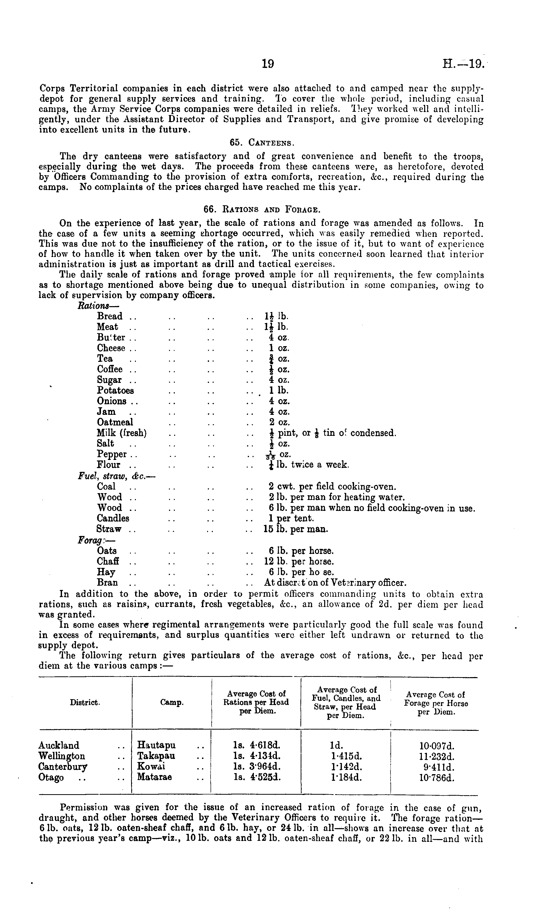 District. Camp. Average Cost of Rations per Head per Diem. Average Cost of Fuel, Candles, and Straw, per Head per Diem. Average Cost of Forage per Horse per Diem. Luckland Vellington Janterbury Hautapu Takapau Kowai Matarae Is. 4-618d. Is. 4-134d. 13. 3-964d. la. 4525d. Id. 1415d. l-142d. 1184d. 10-097d. ll-232d. 9-411d. 10'786d. )tago