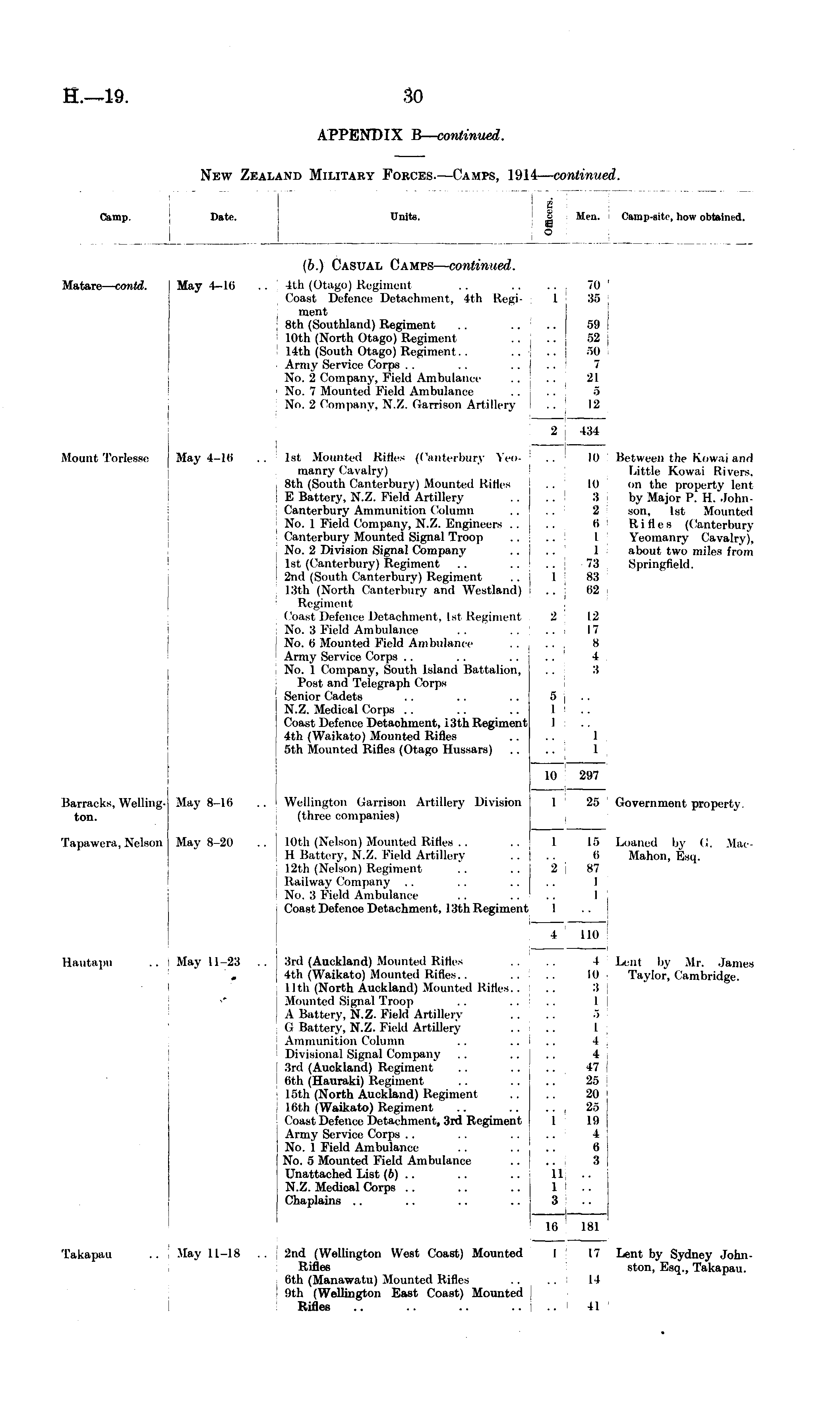 New Zealand Military Forces.—Camps, 1914 — continued.