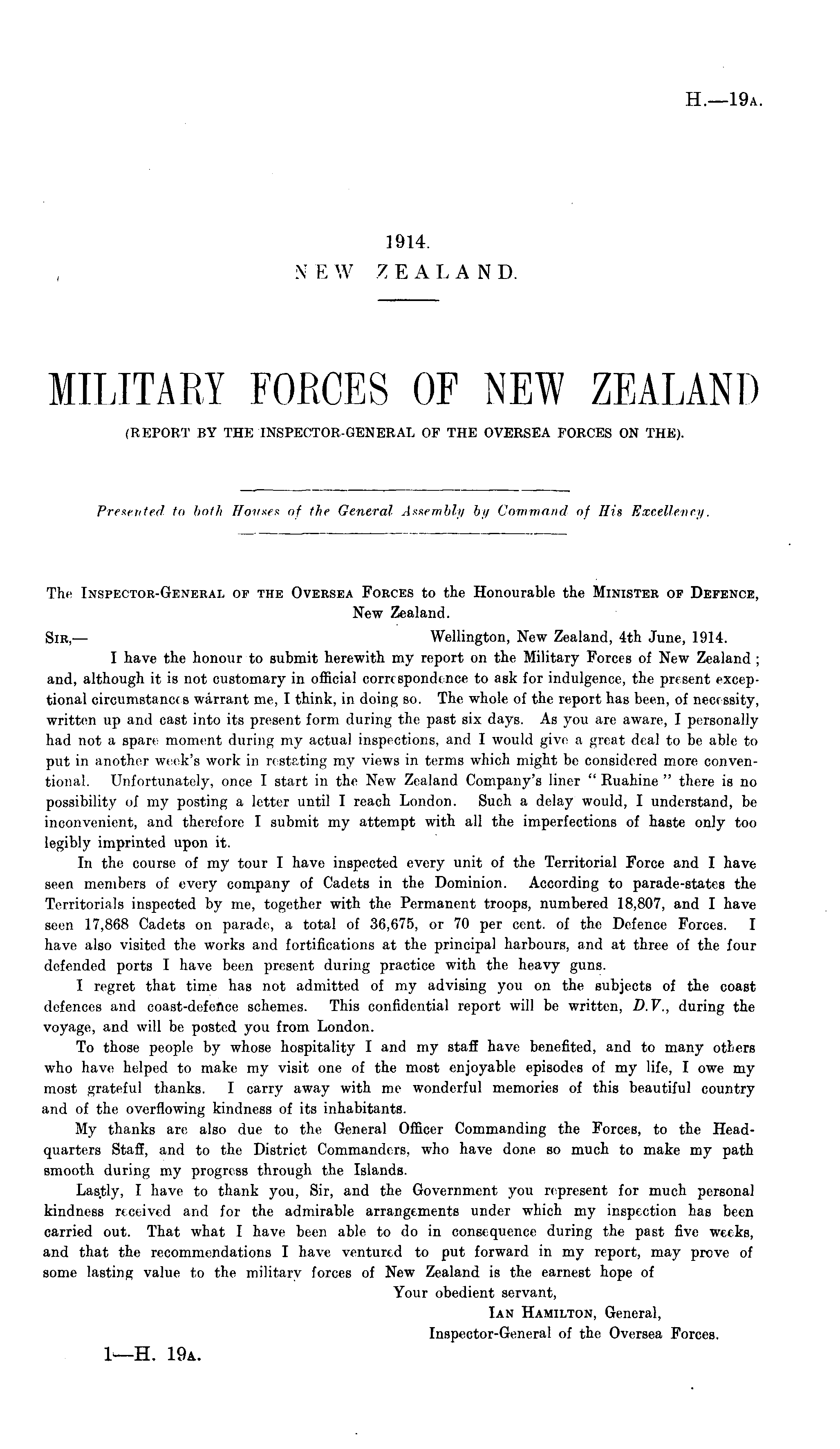 The Inspector-General of the Oversea Forces to the Honourable the Minister of Defence, New Zealand. Sir, — Wellington, New Zealand, 4th June, 1914. I have the honour to submit herewith my report on the Military Forces of New Zealand ; and, although it is not customary in official correspondence to ask for indulgence, the present exceptional circumstances warrant me, I think, in doing so. The whole of the report has been, of necessity, written up and cast into its present form during the past six days. As you are aware, I personally had not a spare moment during my actual inspections, and I would give a great deal to be able to put in another week's work in restating my views in terms which might be considered more conventional. Unfortunately, once I start in the New Zealand Company's liner " Ruahine " there is no possibility of my posting a letter until I reach London. Such a delay would, I understand, be inconvenient, and therefore I submit my attempt with all the imperfections of haste only too legibly imprinted upon it. In the course of my tour I have inspected every unit of the Territorial Force and I have seen members of every company of Cadets in the Dominion. According to parade-states the Territorials inspected by me, together with the Permanent troops, numbered 18,807, and I have seen 17,868 Cadets on parade, a total of 36,675, or 70 per cent, of the Defence Forces. I have also visited the works and fortifications at the principal harbours, and at three of the four defended ports I have been present during practice with the heavy guns. I regret that time has not admitted of my advising you on the subjects of the coast defences and coast-defence schemes. This confidential report will be written, D.V., during the voyage, and will be posted you from London. To those people by whose hospitality I and my staff have benefited, and to many others who have helped to make my visit one of the most enjoyable episodes of my life, I owe my most grateful thanks. I carry away with me wonderful memories of this beautiful country and of the overflowing kindness of its inhabitants. My thanks are also due to the General Officer Commanding the Forces, to the Headquarters Staff, and to the District Commanders, who have done so much to make my path smooth during my progress through the Islands. Las.tly, I have to thank you, Sir, and the Government you represent for much personal kindness received and for the admirable arrangements under which my inspection has been carried out. That what I have been able to do in consequence during the past five weeks, and that the recommendations I have ventured to put forward in my report, may prove of some lasting value to the military forces of New Zealand is the earnest hope of Your obedient servant, lan Hamilton, General, Inspector-General of the Oversea Forces.