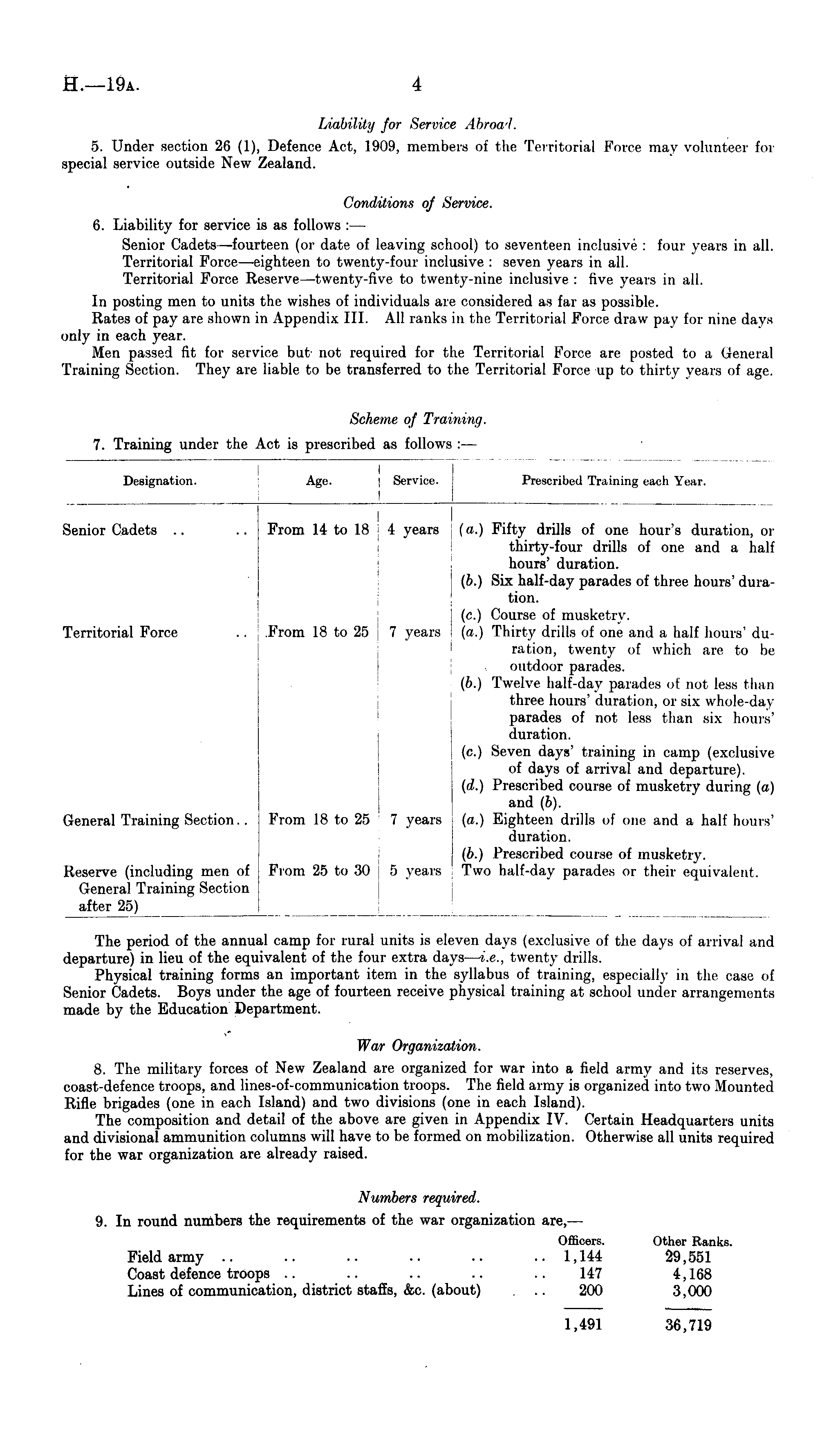 Liability for Service Abroad. 5. Under section 26 (1), Defence Act, 1909, members of the Territorial Force may volunteer for special service outside New Zealand. Conditions of Service. 6. Liability for service is as follows : — Senior Cadets—fourteen (or date of leaving school) to seventeen inclusive : four years in all. Territorial Foree —-eighteen to twenty-four inclusive : seven years in all. Territorial Force Reserve—twenty-five to twenty-nine inclusive : five years in all. In posting men to units the wishes of individuals are considered as far as possible. Rates of pay are shown in Appendix 111. All ranks in the Territorial Force draw pay for nine days only in each year. Men passed fit for service but not required for the Territorial Force are posted to a General Training Section. They are liable to be transferred to the Territorial Force up to thirty years of age. Scheme of Training. 7. Training under the Act is prescribed as follows : —