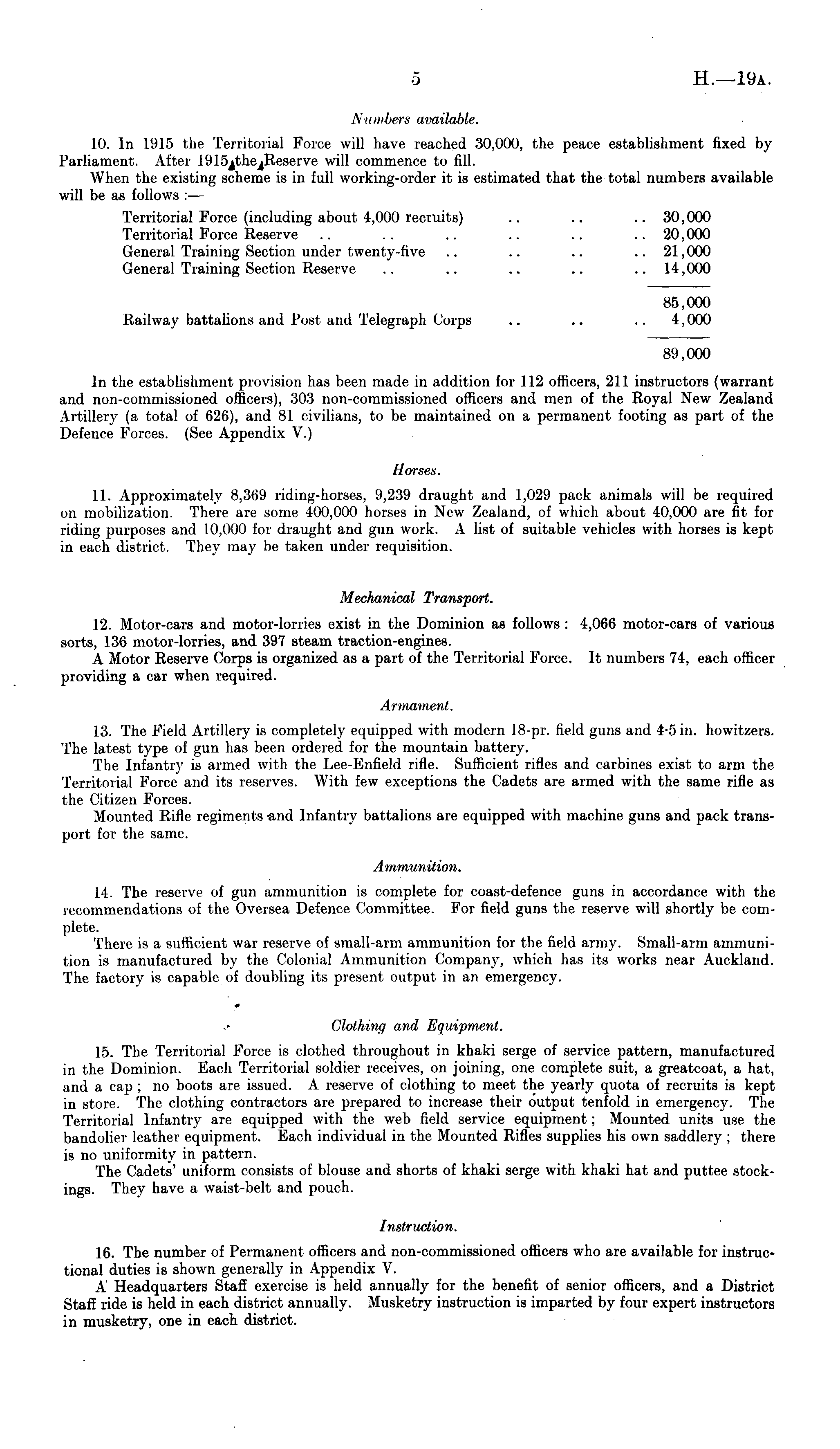 .\ umbers available. 10. In 1915 the Territorial Force will have reached 30,000, the peace establishment fixed by Parliament. After will commence to fill. When the existing scheme is in full working-order it is estimated that the total numbers available will be as follows : — Territorial Force (including about 4,000 recruits) .. .. ..30,000 Territorial Force Eeserve .. .. .. .. .. ..20,000 General Training Section under twenty-five .. .. .. .. 21,000 General Training Section Reserve .. .. .. .. .. 14,000 85,000 Railway battalions and Post and Telegraph Corps .. .. .. 4,000 89,000 In the establishment provision has been made in addition for 112 officers, 211 instructors (warrant and non-commissioned officers), 303 non-commissioned officers and men of the Royal New Zealand Artillery (a total of 626), and 81 civilians, to be maintained on a permanent footing as part of the Defence Forces. (See Appendix V.) Horses. 11. Approximately 8,369 riding-horses, 9,239 draught and 1,029 pack animals will be required on mobilization. There are some 400,000 horses in New Zealand, of which about 40,000 are fit for riding purposes and 10,000 for draught and gun work. A list of suitable vehicles with horses is kept in each district. They may be taken under requisition. Mechanical Transport. 12. Motor-cars and motor-lorries exist in the Dominion as follows : 4,066 motor-cars of various sorts, 136 motor-lorries, and 397 steam traction-engines. A Motor Reserve Corps is organized as a part of the Territorial Force. It numbers 74, each officer providing a car when required. Armament. 13. The Field Artillery is completely equipped with modern 18-pr. field guns and 4-5 in. howitzers. The latest type of gun has been ordered for the mountain battery. The Infantry is armed with the Lee-Enfield rifle. Sufficient rifles and carbines exist to arm the Territorial Force and its reserves. With few exceptions the Cadets are armed with the same rifle as the Citizen Forces. Mounted Rifle regiments and Infantry battalions are equipped with machine guns and pack transport for tin , same. Ammunition. 14. The reserve of gun ammunition is complete for coast-defence guns in accordance with the recommendations of the Oversea Defence Committee. For field guns the reserve will shortly be complete. There is a sufficient war reserve of small-arm ammunition for the field army. Small-arm ammuniiion is manufactured by the Colonial Ammunition Company, which lias its works near Auckland. The factory is capable of doubling its present output in an emergency. m Clothing and Equipment. 15. The Territorial Force is clothed throughout in khaki serge of service pattern, manufactured in the Dominion. Each Territorial soldier receives, on joining, one complete suit, a greatcoat, a hat, and a cap ;no boots are issued. A reserve of clothing to meet the yearly quota of recruits is kept in store. The clothing contractors are prepared to increase their output tenfold in emergency. The Territorial Infantry are equipped with the web field service equipment; Mounted units use the bandolier leather equipment. Each individual in the Mounted Rifles supplies his own saddlery ; there is no uniformity in pattern. The Cadets' uniform consists of blouse and shorts of khaki serge with khaki hat and puttee stockings. They have a waist-belt and pouch. Instruction. 16. The number of Permanent officers and non-commissioned officers who are available for instructional duties is shown generally in Appendix V. A Headquarters Staff exercise is held annually for the benefit of senior officers, and a District Staff ride is held in each district annually. Musketry instruction is imparted by four expert instructors in musketry, one in each district.