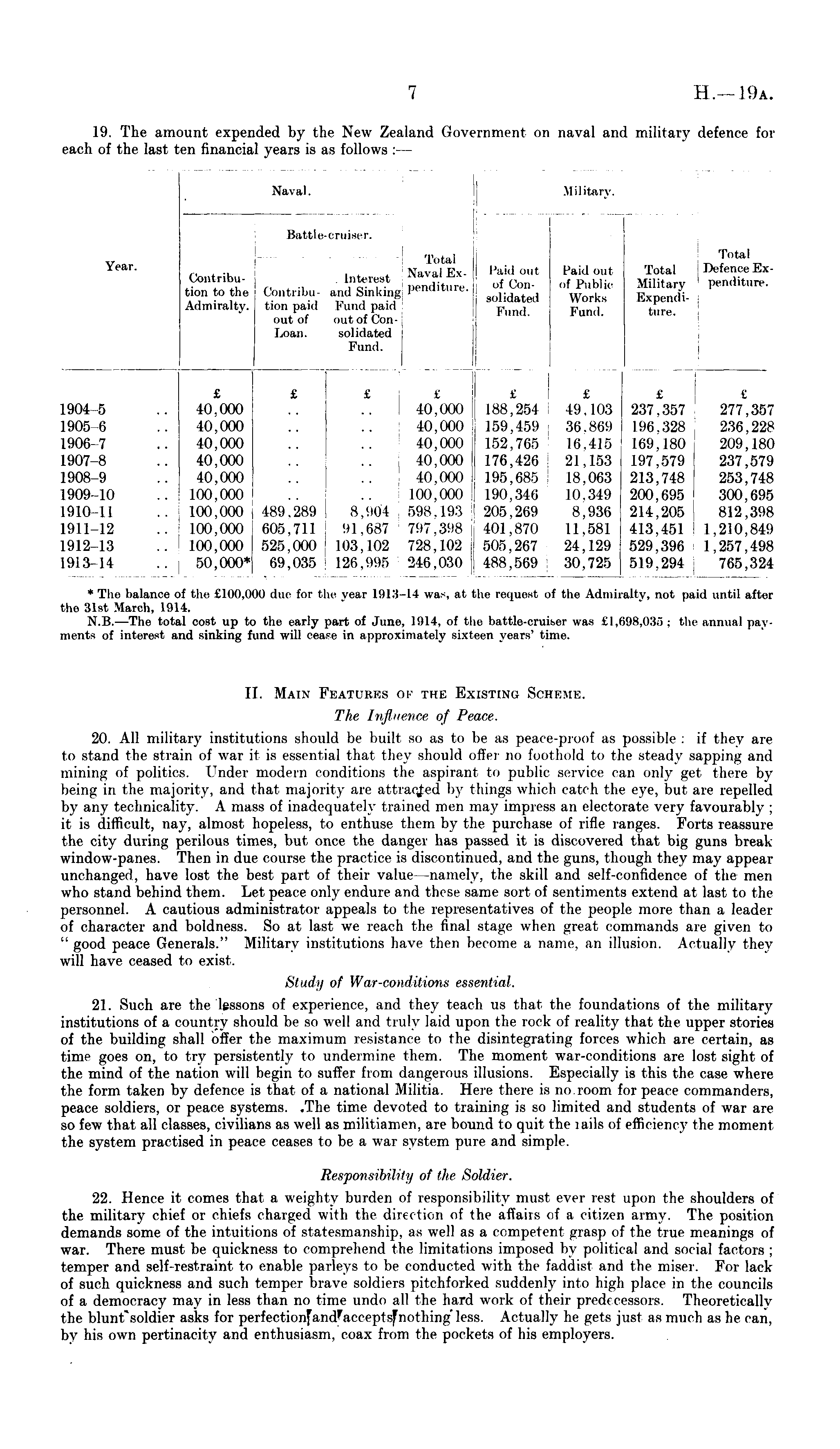 Naval. Military. Battle- cruisn. 5fear. (Contribution to the Admiralty. Total Interest Naval ExContribu- and Sinking penditure. tion paid Fund paid out of out of ConLoan, solidated Fund. Paid out of Consolidated Fund. Paid out of Public Works Fund. Total Total Defence ExMilitary penditure. Expenditure. 904-5 905-6 1906-7 [907-8 1908-9 [909-10 .910-11 [911-12 912-13 913-14 £ 40.000 40,000 40,000 40,000 40,000 100,000 100,000 100,000 100,000 50,000* £ £ £ £ 40,000 40,000 40,000 40,000 40,000 .. ! 100,000 489,289 8,904 598,193 I (i()5.7ll 91,687 797,398 525,000 103.102 728,102 69,035 ; 126,995 246,030 £ £ 188,251 111.103 159,459 ; 36.869 152,705 16,415 176,426 : 21,153 195,685 ! 18,063 190,346 10,349 205,269 8,936 401,870 11,581 505,267 24,129 488,569 30,725 £ £ 237.357 277,357 196,328 236.228 169,180 209,180 197,579 237,579 213,748 ! 253,748 200.695 i 300,695 214,205 , 812,398 413,451 1.210,849 529.396 1,257,498 519.294 765,324 489,289 605,711 525,000 69,035 * The balance ( ho 31st March, 191 N.B.—The toti nents of interest a >f the £100,0 4. il cost up t( nd sinking f K) due for tl ) due for the year 1913-14 wai. at t I,,- request of the Admii raltj . nut paid until after the early j ind will ceai the early part of June, 1914, of tli nd will cease in approximately Bixti ie battle-cruiser was £1,1 een years' time. 698,035 : the annual pay-
