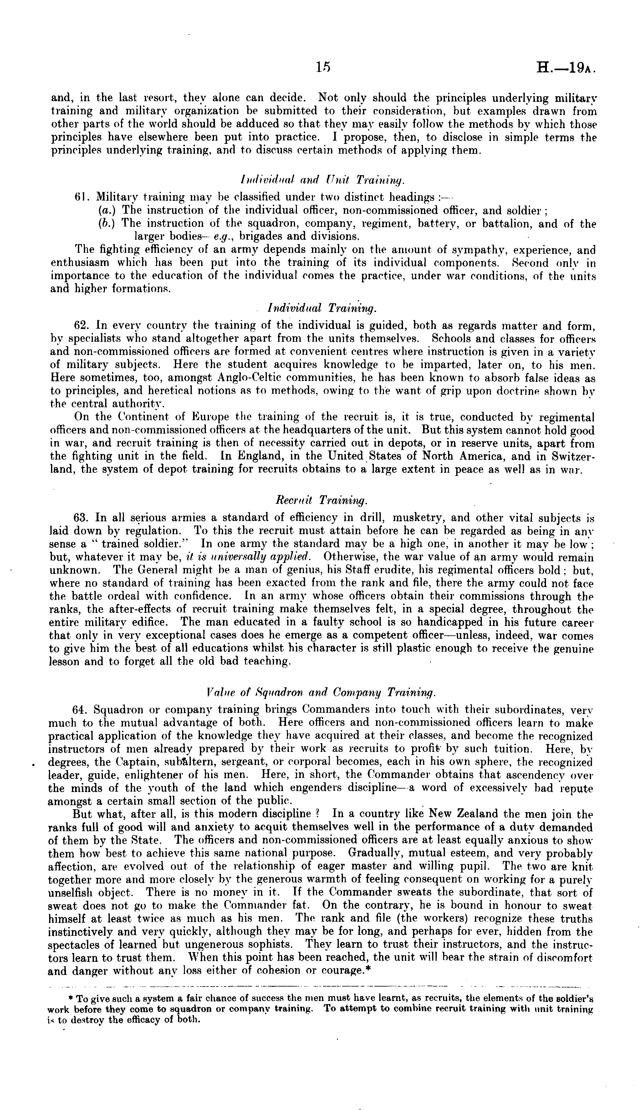 and, in the last resort, they alone can decide. Not only should the principles underlying military training and military organization be submitted to their consideration, but examples drawn from other parts of the world should be adduced so that they may easily follow the methods by which those principles have elsewhere been put into practice. I propose, then, to disclose in simple terms the principles underlying training, ami to discuss certain methods of applying them. Individual and Unit Training. iil. Military training may lie classified under two distinct headings: (a.) The instruction of the individual officer. Qon-commissioned officer, and soldier ; (/).) The instruction of the squadron, company, regiment, battery, or battalion, and of the larger bodies e.g., brigades and divisions. The fighting efficiency of an army depends mainly on the amount of sympathy. experience, and enthusiasm which has been put into the training of its individual components. Second only in importance to the education of the individual comes the practice, under war conditions, of the units and higher formations. Individual Training. 62. In every country the training of the individual is guided, both as regards matter and form, by specialists who stand altogether apart bom the units themselves. Sol Is and classes for officers and non-commissioned officers are formed at convenient centres where instruction is given in a variety of military subjects. Mere the student acquires knowledge to lie imparted, later on. to his men. Here sometimes, too. amongst Anglo-Celtic communities, he has been known to absorb false ideas as to principles, and heretical notions as to methods, owing to the want of grip upon doctrine shown by the central authority. On the Continent of Europe the training of the recruit is. it is true, conducted by regimental officers and non-commissioned officers at the headquarters of the unit. But this system cannot hold good in war, and recruit training is then of necessity carried out in depots, or in reserve units, apart from the fighting unit in the field. In England, in the United States of North America, and in Switzerland, the system of depot training for recruits obtains to a large extent in peace as well as in war. Recruit Training. 63. In all serious armies a standard of efficiency in drill, musketry, and other vital subjects is laid down by regulation. To this the recruit must attain before he can be regarded as being in any sense a ''trained soldier." In one army the standard may be a high one. in another it may be low: but, whatever it may be. it is universally applied. Otherwise, the war value of an army would remain unknown. The General might be a man of genius, his Staff erudite, his regimental officers bold ; but, where no standard of training has been exacted from the rank and tile, there the army could not face the battle ordeal with confidence. In an army whose officers obtain their commissions through tinranks, the after-effects of recruit training make themselves felt, in a special degree, throughout the entire military edifice. The man educated in a faulty school is so handicapped in his future career that only in very exceptional cases does he emerge as a competent officer—unless, indeed, war comes to give him the best of all educations whilst his character is still plastic enough to receive the genuine lesson and to forget all the old bad teaching. Value of Squadron and Company Training. 64. Squadron or company training brings Commanders into touch with their subordinates, very much to tlie mutual advantage of both. Here officers and non-commissioned officers learn to make practical application of the knowledge they have acquired at their classes, and become the recognized instructors i>l men already prepared by their work as recruits in profit by such tuition. Here, by degrees, the Captain, subaltern, sergeant, or corporal becomes, each in his own sphere, the recognized leader, guide, enlightener of his men. Here, in short, the Commander obtains that ascendency over the minds of the youth of the land which engenders discipline a word of excessively bad repute amongst a certain small section of the public. But what, after all. is this modern discipline '. In a country like New Zealand the men join the ranks full of good will and anxiety to acquit themselves well in the performance of a duty demanded of them by the State. The officers and non-commissioned officers are at least equally anxious to show them how best to achieve this same national purpose. Gradually, mutual esteem, and very probably affection, are evolved out of the relationship of eager master and willing pupil. The two are knit together more and more closely by the generous warmth of feeling consequent on working for a purely unselfish object. There is no money in it. If the Commander sweats the subordinate, that sort of sweat does not go to make the Commander fat. On the contrary, he is bound in honour to sweat himself at least twice as much as his men. The rank and file (the workers) recognize these truths instinctively and very quickly, although they may be for long, and perhaps for ever, hidden from the spectacles of learned but ungenerous sophists. They learn to trust their instructors, and the instructors learn to trust them. When this point has been reached, the unit will bear the strain of discomfort and danger without any loss either of cohesion or courage.*