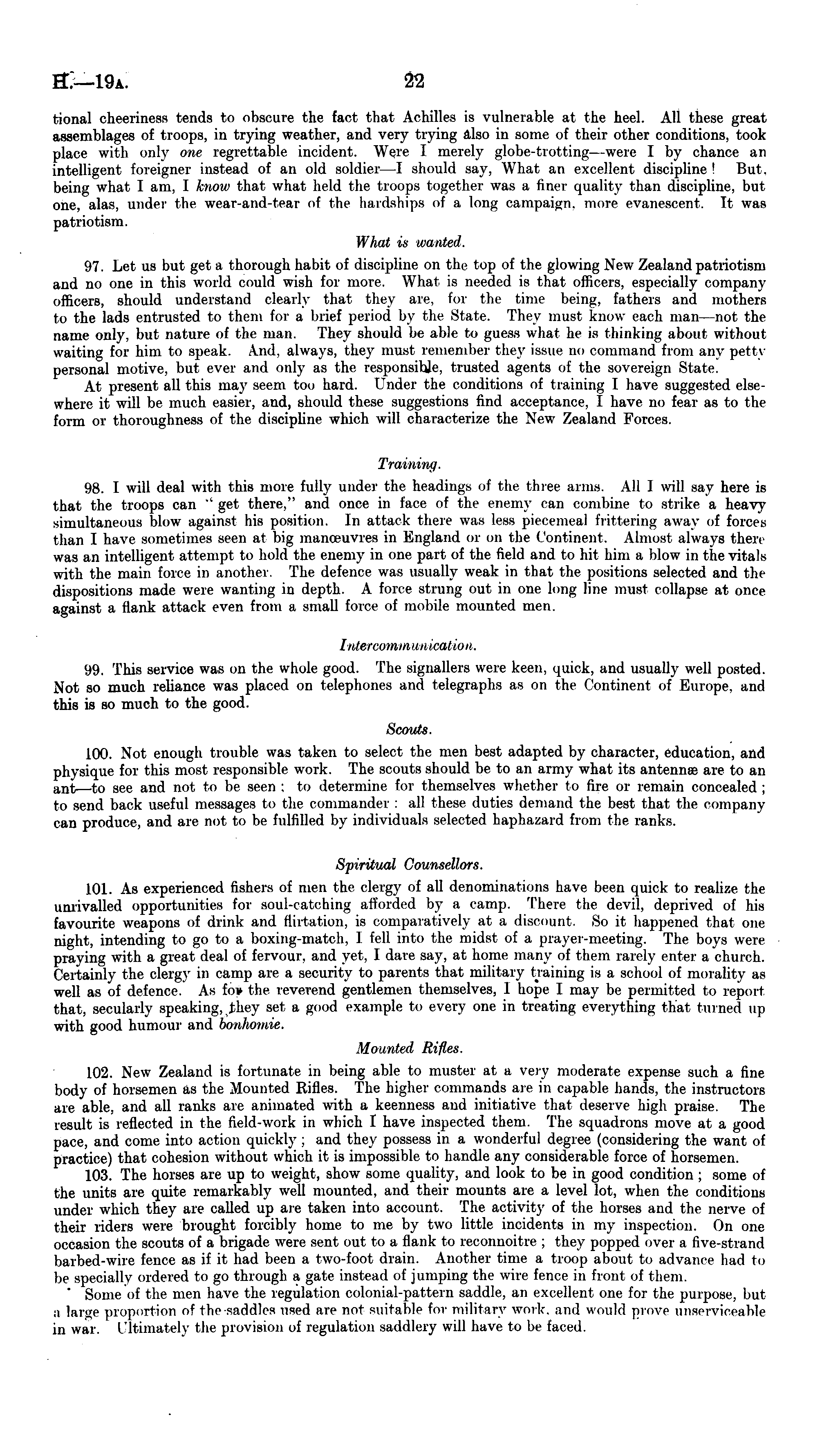 tional cheeriness tends to obscure the fact that Achilles is vulnerable at the heel. All these great assemblages of troops, in trying weather, and very trying also in some of their other conditions, took place with only one regrettable incident. Were I merely globe-trotting—were I by chance an intelligent foreigner instead of an old soldier—l should say, What an excellent discipline ! But. being what I am, I know that what held the troops together was a finer quality than discipline, but one, alas, under the wear-and-tear of the hardships of a long campaign, more evanescent. It was patriotism. What is wanted. 97. Let us but get a thorough habit of discipline on the top of the glowing New Zealand patriotism and no one in this world could wish for more. What is needed is that officers, especially company otticers, should understand clearly that they are, for the time being, fathers and mothers to the lads entrusted to them for a brief period by the State. They must know each man—not the name only, but nature of the man. They should be able to guess what be is thinking about without waiting for him to speak. And, always, they must remember they issue no command from any petty personal motive, but ever and only as the responsible, trusted agents of the sovereign State. At present all this may seem too hard. Under the conditions of training I have suggested elsewhere it will be much easier, and, should these suggestions find acceptance, I have no fear as to the form or thoroughness of the discipline which will characterize the New Zealand Forces. Training. 98. I will deal with this more fully under the headings of the three arms. All I will say here is (hat the troops can "get there," and once in face of the enemy can combine to strike a heavy simultaneous blow against his position. In attack there was less piecemeal Frittering away of forces than I have sometimes seen at big manoeuvres in England or on the Continent. AJmosi always there was an intelligent attempt to hold the enemy in one part of the field and to hit him a blow in the vitals with the main force in another. The defence was usually weak in that the positions selected and the dispositions made were wanting in depth. A force strung out in one long line must collapse at once against a flank attack even from a small force of mobile mounted men. Intercommunication. 99. This service was on the whole good. The signallers were keen, quick, and usually well posted. Not so much reliance was placed on telephones and telegraphs as on the Continent of Europe, and this is so much to the good. Scouts. 100. Not enough trouble was taken to select the men best adapted by character, education, and physique for this most responsible work. The scouts should be to an army what its antennae are to an an t—to see and not to be seen ; to determine Eor themselves whether to fire or remain concealed ; to send back useful messages to the commander : all these duties demand the best that the company can produce, and are not to be fulfilled by individuals selected haphazard from the ranks. Spiritual Counsellors. 101. As experienced fishers of men the clergy of all denominations have been quick to realize the unrivalled opportunities for soul-catching afforded by a camp. There the devil, deprived of his favourite weapons of drink and flirtation, is comparatively at a discount. So it happened that one night, intending to go to a boxing-match, 1 fell into the midst of a prayer-meeting. The bnvs were praying with a great deal of fervour, and yet, 1 dare say, at home many of them rarely enter a church. Certainly the clergy in camp are a security to parents that military training is a school of morality as well as of defence. As fov the reverend gentlemen themselves, 1 hope I may be permitted to report that, secularly speaking, .they set a good example to every one in treating everything that turned up with good humour and bonhomie. Mounted Rifles. 102. New Zealand is fortunate in being able to muster at a very moderate expense such a fine body of horsemen as the Mounted Rifles. The higher commands are in capable hands, the instructors are able, and all ranks are animated with a keenness and initiative that deserve high praise. The result is reflected in the field-work in which I have inspected them. The squadrons move at a good pace, and come into action quickly ; and they possess in a wonderful degree (considering the want of practice) that cohesion without which it is impossible to handle any considerable force of horsemen. 103. The horses are up to weight, show some quality, and look to be in good condition ; some of the units are quite remarkably well mounted, and their mounts are a level lot, when the conditions under which they are called up are taken into account. The activity of the horses and the nerve of their riders were brought forcibly home to me by two little incidents in my inspection. On one occasion the scouts of a brigade were sent out to a flank to reconnoitre ; they popped over a five-strand barbed-wire fence as if it had been a two-foot drain. Another time a troop about to advance had to be specially ordered to go through a gate instead of jumping the wire fence in front of them. Some of the men have the regulation colonial-pattern saddle, an excellent one for the purpose, but a large proportion of the saddles used are not suitable for military work, and would grove unserviceable in war. Ultimately the provision of regulation saddlery will have to be faced.