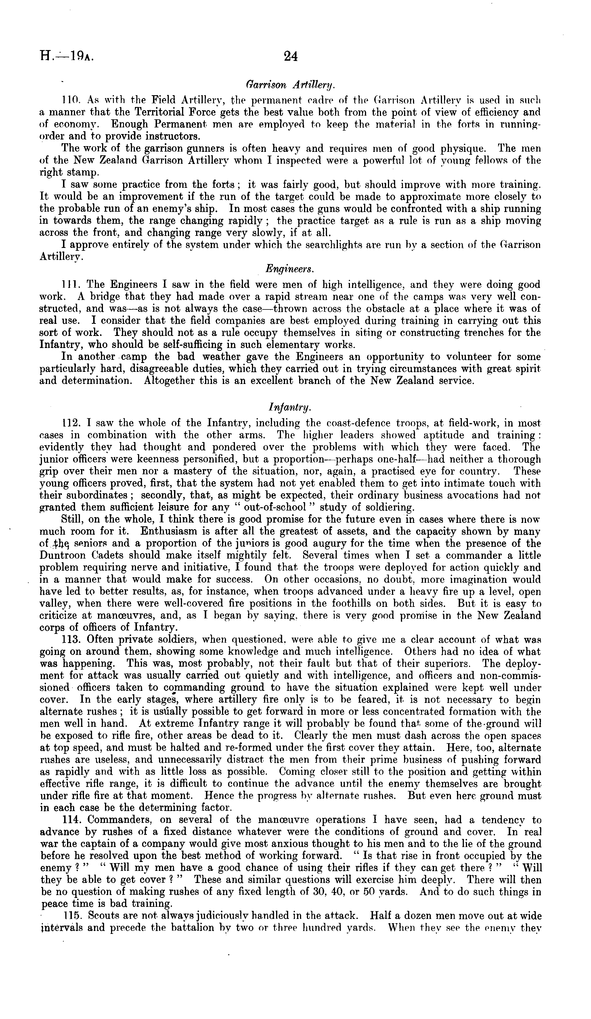 Garrison Artillery. 110. As with Hip Fiold Artillery, the permanent cadre of the Garrison Artillery is used in such a manner that the Territorial Force gets the. best value both from the point of view of efficiency and of economy. Enough Permanent men are employed to keep the material in the forts in runningorder and to provide instructors. The work of the garrison gunners is often heavy and requires men of good physique. The men of the New Zealand Garrison Artillery whom I inspected were a powerful lot of young fellows of the right stamp. I saw some practice from the forts ; it was fairly good, but should improve with more training. It would be an improvement if the run of the target could be made to approximate more closely to the probable run of an enemy's ship. In most cases the guns would be confronted with a ship running in towards them, the range changing rapidly ; the practice target as a rule is run as a ship moving across the front, and changing range very slowly, if at all. I approve entirely of the system under which the searchlights are run by a section of the Garrison Artillery. Engineers. 111. The Engineers I saw in the field were men of high intelligence, and they were doing good work. A bridge that they had made over a rapid stream near one of the camps was very well constructed, and was—as is not always the case—thrown across the obstacle at a place where it was of ieal use. I consider that the field companies are best employed during training in carrying out this sort of work. They should not as a rule occupy themselves in siting or constructing trenches for the Infantry, who should be self-sufficing in such elementary works. In another camp the bad weather gave the Engineers an opportunity to volunteer for some particularly hard, disagreeable duties, which they carried out in trying circumstances with great spirit and determination. Altogether this is an excellent branch of the New Zealand service. Infantry. 112. I saw the whole of the Infantry, including the coast-defence troops, at field-work, in most cases in combination with the other arms. The higher leaders showed aptitude and training : evidently they had thought and pondered over the problems with which they were faced. The junior officers were keenness personified, but a proportion—perhaps one-half—had neither a thorough grip over their men nor a mastery of the situation, nor, again, a practised eye for country. These young officers proved, first, that the system had not, yet enabled them to get into intimate touch with their subordinates ; secondly, that, as might be expected, their ordinary business avocations had not granted them sufficient leisure for any " out-of-school " study of soldiering. Still, on the whole, I think there is good promise for the future even in cases where there is now much room for it. Enthusiasm is after all the greatest of assets, and the capacity shown by many < f seniors and a proportion of the jumors is good augury for the time when the presence of the Duntroon Cadets should make itself mightily felt. Several times when I set a commander a little problem requiring nerve and initiative, I found that the troops were deployed for action quickly and in a manner that would make for success. On other occasions, no doubt, more imagination would have led to better results, as, for instance, when troops advanced under a heavy fire up a level, open valley, when there were well-covered fire positions in the foothills on both sides. But it is easy to criticize at manoeuvres, and, as I began by saying, there is very good promise in the New Zealand corps of officers of Infantry. 113. Often private soldiers, when questioned, were able to give me a clear account of what was going on around them, showing some knowledge and much intelligence. Others had no idea of what was happening. This was, most probably, not their fault but that of their superiors. The deployment for attack was usually carried out quietly and with intelligence, and officers and non-commis-sioned officers taken to commanding ground to have the situation explained were kept well under cover. In the early stages, where artillery fire only is to be feared, it is not necessary to begin alternate rushes ; it is usually possible to get forward in more or less concentrated formation with the men well in hand. At extreme Infantry range it will probably be found that some of the ground will he exposed to rifle fire, other areas be dead to it. Clearly the men must dash across the open spaces at top speed, and must be halted and re-formed under the first cover they attain. Here, too, alternate rushes are useless, and unnecessarily distract the men from their prime business of pushing forward as rapidly and with as little loss as possible. Coming closer still to the position and getting within effective rifle range, it is difficult to continue the advance until the enemy themselves are brought under rifle fire at that moment. Hence the progress by alternate rashes. But even here ground must in each case be the determining factor. 114. Commanders, on several of the manoeuvre operations I have seen, had a tendency to advance by rushes of a fixed distance whatever were the conditions of ground and cover. In real war the captain of a company would give most anxious thought to his men and to the lie of the ground before he resolved upon the best method of working forward. "Is that rise in front occupied by the enemy ? " " Will my men have a good chance of using their rifles if they can get there ? " " Will they be able to get cover ? " These and similar questions will exercise him deeply. There will then be no question of making rushes of any fixed length of 30, 40, or 50 yards. And to do such things in peace time is bad training. 115. Scouts are not always judiciously handled in the attack. Half a dozen men move out at wide intervals and precede the battalion by two or three hundred yards. When they see the enemy they