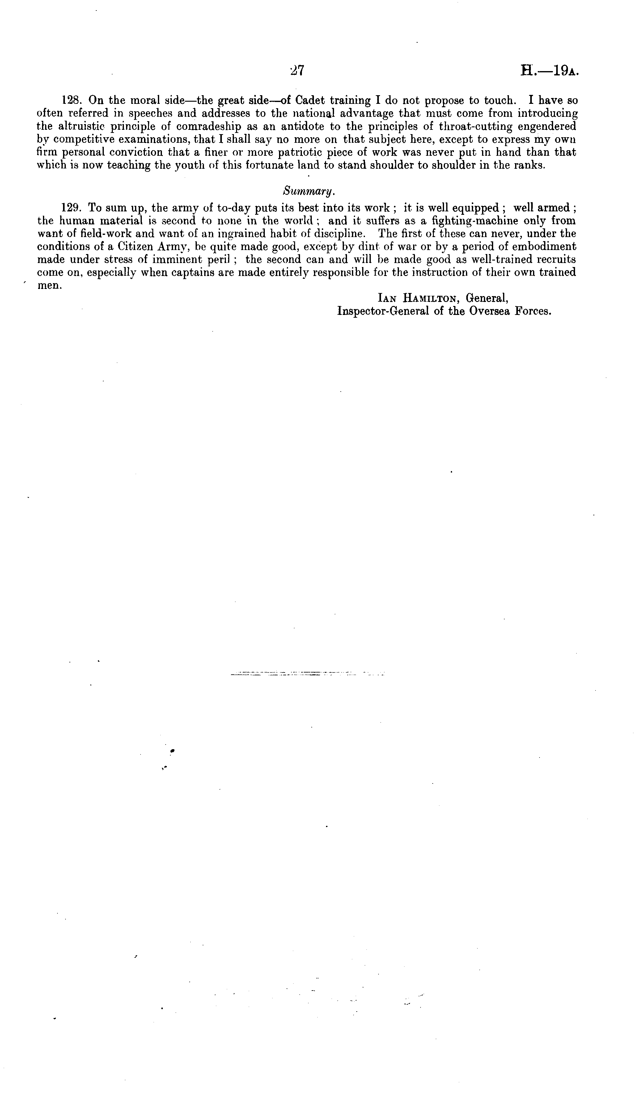 128. On the moral side—the great side—of Cadet training Ido not propose to touch. I have so often referred in speeches and addresses to the national advantage that must come from introducing the altruistic principle of comradeship as an antidote to the principles of throat-cutting engendered by competitive examinations, 1 hat I shall say no more on that subject here, except to express my own firm personal conviction that a finer or more patriotic piece of work was never put in hand than that which is now teaching the youth of this fortunate land to stand shoulder to shoulder in the ranks. Summary. 129. To sum up, the army of to-day puts its best into its work ; it is well equipped ; well armed ; tin' human material is second to nine in the world : and it suffers as a fighting-machine only from want of field-work and want of an ingrained habit of discipline. The first of these can never, under the conditions of a Citizen Army, be quite made good, except by dint of war or by a period of embodiment made under stress of imminent peril : the second can and will !>e made good as well-trained recruits come on. especially when captains are made entirely responsible for the instruction of their own trained men. la.n Hamilton, General, Inspector-General of the Oversea Forces.