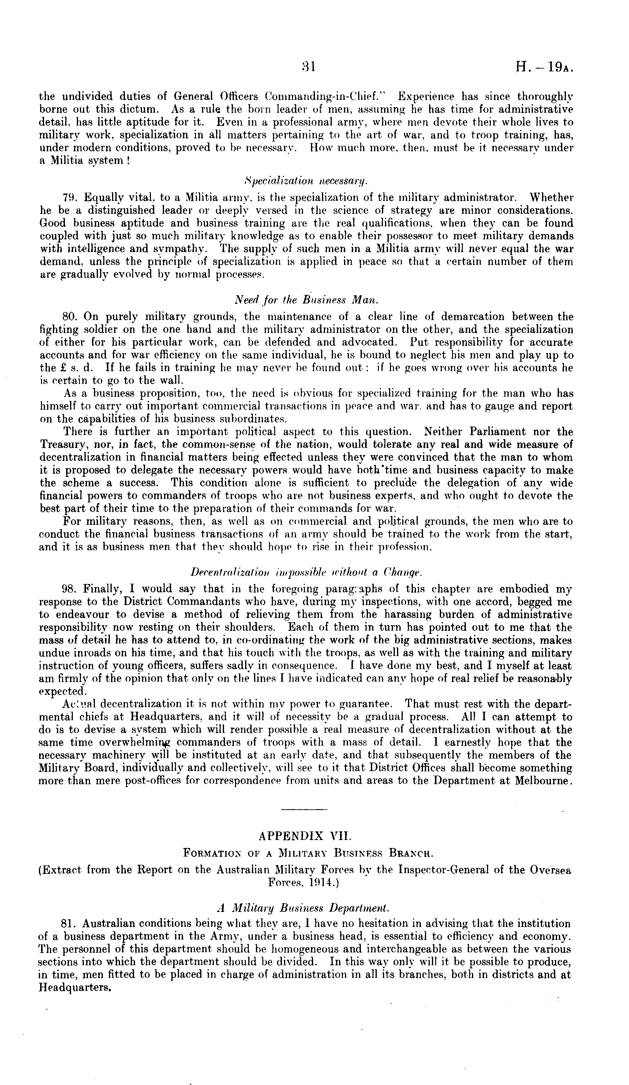 APPENDIX VII. Formation or a Military Business Bkanch. (Extract from the Report on the Australian Military Forces by the Inspector-General of the Oversea Forces. 1914.) A Military Business Department. 81. Australian conditions being what they are, 1 have no hesitation in advising that the institution of a business department in the Army, under a business head, is essential to efficiency and economy. The personnel of this department should be homogeneous and interchangeable as between the various sections into which the department should be divided. In this way only will it be possible to produce, in time, men fitted to be placed in charge of administration in all its branches, both in districts and at Headquarters.