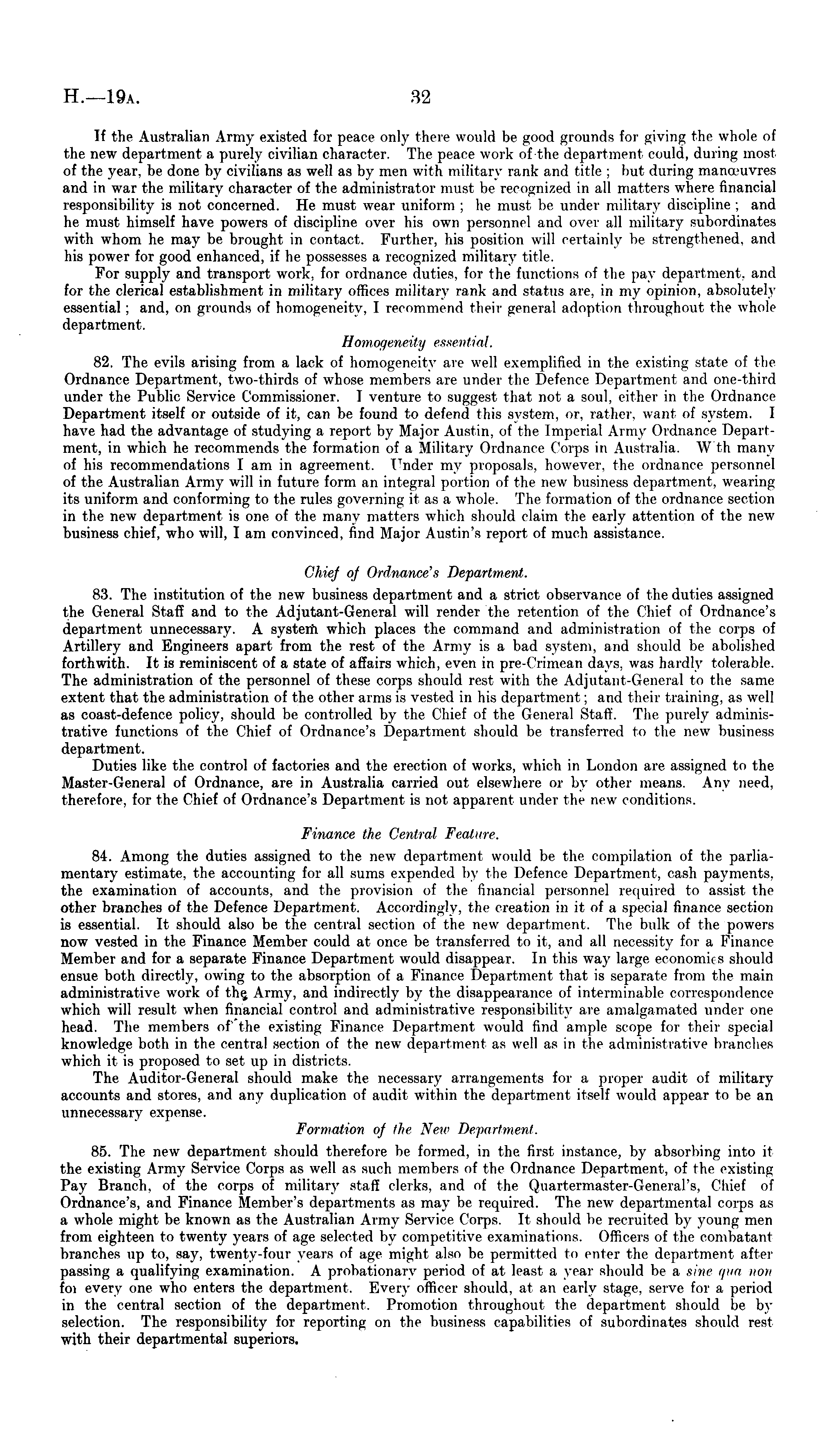 If the Australian Army existed for peace only there would be good grounds for giving the whole of the new department a purely civilian character. The peace work of the department could, during most of the year, be done by civilians as well as by men with military rank and title ; but during manoeuvres and in war the military character of the administrator must be recognized in all matters where financial responsibility is not concerned. He must weal uniform :he must be under military discipline ; and he must himself have powers of discipline over his own personnel and over all military subordinates with whom he may be brought in contact. Further, his position will certainly bo strengthened, and his power for good enhanced, if he possesses a recognized military title. For supply and transport work, for ordnance duties, for the functions of the pay department, and for the clerical establishment in military offices military rank and status are, in my opinion, absolutely essential ; and, on grounds of homogeneity. 1 recommend their general adoption throughout the whole department. Homogeneity essential. 82. The evils arising from a lack of homogeneity are well exemplified in the existing state of the Ordnance Department, two-thirds of whose members are under the Defence Department and one-third under the Public Service Commissioner. I venture to suggest that not a soul, either in the Ordnance Department itself or outside of it, can be found to defend this system, or, rather, want of system. I have had the advantage of studying a report by Major Austin, of the Imperial Army Ordnance Department, in which he recommends the formation of a Military Ordnance Corps in Australia. Wth many of his recommendations lam in agreement. Under my proposals, however, the ordnance personnel of the Australian Army will in future form an integral portion of the new business department, weaving its uniform and conforming to the rules governing it as a whole. The formation of the ordnance section in the new department is one of the many matters which should claim the early attention of the new business chief, who will, I am convinced, find Major Austin's report of much assistance. Chief of Ordnance's Department. 83. The institution of the new business department and a strict observance of the duties assigned the General Staff and to the Adjutant-General will render the retention of the Chief of Ordnance's department unnecessary. A system which places the command and administration of the corps of Artillery and Engineers apart from the rest of the Army is a bad system, and should be abolished forthwith. It is reminiscent of a state of affairs which, even in pre-Crimean days, was hardly tolerable. The administration of the personnel of these corps should rest with the Adjutant-General to the same extent that the administration of the other arms is vested in his department; and their training, as well as coast-defence policy, should be controlled by the Chief of the General Staff. The purely administrative functions of the Chief of Ordnance's Department should be transferred to the new business department. Duties like the control of factories and the erection of works, which in London are assigned to the Master-General of Ordnance, are in Australia carried out elsewhere or by other means. Any need, therefore, for the Chief of Ordnance's Department is not apparent under tin- new conditions. Finance the Central Feature. 84. Among the duties assigned to the new department would be the compilation of the parliamentary estimate, the accounting for all sums expended by (he Defence Department, cash payments, the examination of accounts, and the provision of the financial personnel required to assist the other branches of the Defence Department. Accordingly, the creation in it of a special finance section is essential. It should also be the central section of the new department. The bulk of the powers now vested in the Finance Member could at once be transferred to it, and all necessity for a Finance Member and for a separate Finance Department would disappear. In this way large economit s should ensue both directly, owing to the absorption of a Finance Department that is separate from the main administrative work of the Army, and indirectly by the disappearance of interminable correspondence which will result when financial control and administrative responsibility are amalgamated under one head. The members of the existing Finance Department would find ample scope for their special knowledge both in the central section of the new department as well as in the administrative branches which it is proposed to set up in districts. The Auditor-General should make the necessary arrangements for a proper audit of military accounts and stores, and any duplication of audit within the department itself would appear to be an unnecessary expense. Formation oj the New Department. 85. The new department should therefore be formed, in the first instance, by absorbing into it the existing Army Service Corps as well as such members of the Ordnance Department, of the existing Pay Branch, of the corps of military staff clerks, and of the Quartermaster-General's, Chief of Ordnance's, and Finance Member's departments as may be required. The new departmental corps as a whole might be known as the Australian Army Service Corps. Tt should lie recruited by young men from eighteen to twenty years of age selected by competitive examinations. Officers of the combatant branches up to, say, twenty-four years of age might also be permitted to enter the department after passing a qualifying examination. A probationary period of at least a year should be a sine qua non foi every one who enters the department. FiVery officer should, at an early stage, serve for a period in the central section of the department. Promotion throughout the department should be by selection. The responsibility for reporting on the business capabilities of subordinates should res