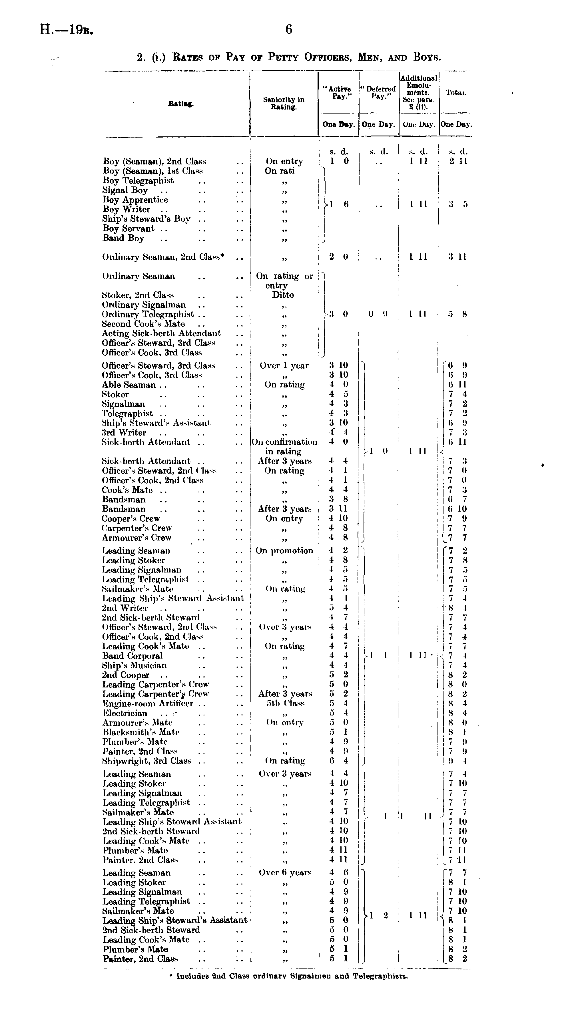 Jt«ti»g. Seniority in Rating. " Active Pay." One Day. '■ Deferred I'ay." lAdditiouiil Emoluments. Sec para. 2(ii). Total. One Day. Out- J>;iy Oue Day. JJoy (Seaman), 2nd ( lass Boy (Seaman), 1st ('lass Hoy Telegraphist Signal Boy Boy Apprentice Boy Writer Ship's Steward's Hoy .. Boy Servant Band Boy On entry 1 0 On rati s. d. 1 0 s. ,1. 1 0 s. d. s. d. 8. d. 1 II 8. .1. 1 II ■ S. (1. 2 II >> ■ 1 t> I II 3 5 Uβ -1 0 I II if » " K Ordinary Seaman, 2nd Class* - (I 2 0 1 LI 1 11 :i u Ordinary Seaman On rating or entry Ditto Stoker, 2nd Class Ordinary Signalman (hdinarv Telegraphist Second Conk's Mate Acting Sick-berth Attendant Officer's Stoward, 3rd Class Officer's Cook, 3rd Class .. 3 0 3 0 O '.I I 11 r> s " " Officer's Steward, 3rd Class .. | Officer's Cook, 3rd Class Able Seaman Stoker Signalman Telegraphist Ship's Steward's Aeeiistant 3rd Writer Sick-lierth Attendant .. Over 1 year 3 10 :i 10 On rating 4 0 I ."> 4 :i 4 3 3 10 I • On confirmation 4 0 in rating After 3 years 4 4 On rutin;.' 4 1 4 1 4 4 :! s All it 3 yean 3 11 On entry 4 10 4 8 4 8 3 10 :s io i o 4 5 4 3 4 3 3 10 £ 4 4 0 6 '.' C> !l (i II 7 I 7 2 7 2 0 !> 7 :! l> II U 0 I 0 I II -j ■> Sick-berth Attendant .. ((fflcer's Steward, 2nd ('la-s Officer's Cook, 2nd Class (look's Mate Bandsman Bandsman Cooper's Crew ('arpenter's ( reu Armourer's (Yew ■I 4 4 1 4 1 4 4 3 8 3 11 4 10 4 8 4 8 ;-1 v 7 :; 7 o 7 0 7 :: (> 7 (i 10 7 !) I 7 7 7 7 t Leading Seaman Leading Stoker Leading Signalman Leading Telegraphwi Sailmaker's Uate .. Leading Ship's Steward Assistant 2nd Writer .. .. .. j 2nd Sick-berth Steward .. . Officer's Steward, 2nd Class ()ffieer's Cook, 2nd ( lass Leading Cook's Mate .. Band Corporal Ship's .Musician 2nd Cooper I lending Carpenter "> Crew Leading Carpenter's Crew Kngine-ronm Artificer . . Klectrician .. >- Armourer's Male Blaoksmith's Mate Plumber's Mate Painter, 2nd ( Hans Shipwright, 3rd Clan •■ Leading Seaman Leading Stoker Leading Signalman Leading Telegraphic .. Sailmaker's Mate Leading Ship's Steward Assistant 2nd Sick-berth Steward Leading Cook's Mate . . Plumber's .Mate Painter, 2nd Class On promotion 4 2 I 8 I r> 4 r, (<n ratimr I 6 + I 5 4 • :: Over .'; yearn I I I I On rating 4 7 4 4 4 4 ■"' 2 r> o After 3 years ."> 2 .->tli (lass .-> 4 •"> 4 On entry 5 0 "> l I !l 4 9 ()n rating fl 4 4 2 4 8 4 r> 4 B t .-> I I ."> 4 I 7 I I I I 4 7 I I 4 4 5 2 5 (I S 2 .-> 4 .") 4 .-, (I 5 1 i g i g 6 4 I 1 -I I I II I I I f7 2 7 S 7 r> 7 ■"> 7 r> 7 I 8 4 7 7 7 4 7 I 7 7 7 I 7 4 8 2 S (I S 2 8 4 S I 8 0 8 I I 7 !> 7 9 9 I i Iver years 4 4 4 10 4 7 4 7 1 7 4 Id I 10 I 10 4 11 4 11 4 4 4 10 I 7 t 7 4 7 4 10 I 10 t io 4 11 4 11 I I , I II II ' I 7 1(1 7 7 ' ii 7 1(1 7 1(1 7 II (_7 11 Leading Seaman Leading Stoker Leading Signalman Leading Telegraphist Sailmaker's Mate Loading Ship's Steward's Assistant 2nd Sick-berth Steward Leading Cook's Mate .. Plumber's Mate Painter, 2nd Class (>\rr (> WAV- 4 6 5 0 4 9 4 9 4 9 5 0 5 0 5 0 5 1 '51 4 l> 5 0 4 9 4 9 4 9 5 0 5 0 5 0 5 1 5 1 il 2 12 1 II I II f7 7 8 I 7 10 7 10 7 10 is l 8 1 8 1 8 2 (.8 2 * Includee 2nd Class ordinary Signalmen and igvaphists.