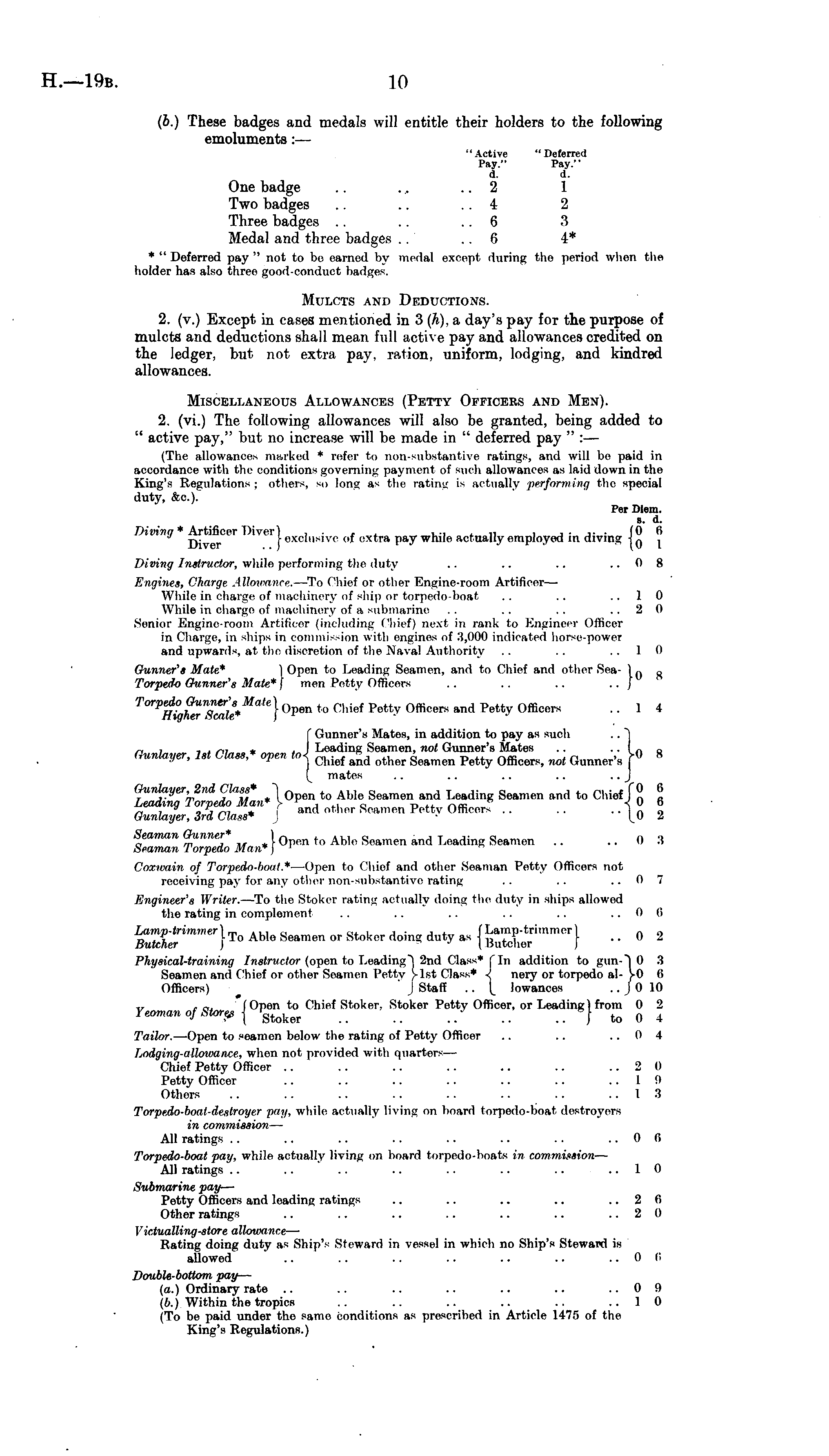 (b.) These badges and medals will entitle their holders to the following emoluments:— " V.tive "Deferred Pay." Pay." d. d. One badge .. .. 2 1 Two badges .. .. .. 4 2 Three badges .. .. .. 6 3 Medal and three badges . . . . 6 -4* * " Deferred pay " not to bo earned by medal except during the period when the holder has also throe good-conduct bad Mulcts and Deductions. 2. (v.) Except, in cases mentioned in 3 (h), a day's pay for the purpose of mulcts and deductions shall mean full active pay and allowances credited on the ledger, but not extra pay, ration, uniform, lodging, and kindred allowances. Miscellaneous Allowances (Petty Officers and Men). 2. (vi.) The following allowances will also be granted, being added to " active pay," but no increase will be made in " deferred pay " :— (The allowances marked * refer t<> non-substantive ratings, and will be paid in accordance with the condition go\ erning payment of such allowances as laid down in the King's Regulations; others, no long a-- the rating is actually performing the special duty. &O.). Per Diem. s. d. THvina * Artificer Diver) , . , .., n i • i- • (Oβ jjj \ exolnaive of extra pay while aotually employed in diving -I X | Diving Instructor, while performing the duty .. .. .. ..0 8 Engines, < 'h<m/r Allowance. -To Chief or other fSngine-room Artificer — While in oharge of machinery of ship or torpedo-boat .. .. ..10 While in charge of machinery of a submarine .. .. .. ..20 Senior Engine-room Artificer (including Chief) next in rank t<> Engineer Offioer in Charge, in ihips in commit ion with engines of 3,000 indicated torse-power and upwards, at the discretion of the Naval Authority .. .. ..in Gunner'e Mate* lOpen to Leading Seamen, and to Chief and other Sea- ),» o Torpedo Gunner's Mate*) men Petty Officers .. .. .. .. J !PorP ff?^s'^ ifO ' e }open to Chief Petty Offioers and Petty Offloere .. 1 4 J" Gunners Mates, in addition to pay as such .. ~1 „ , ~ „, * . Leading Seamen, not Gunner's Mates .. .. I „ „ 11itnunii'.r, Ist ( hisx,* open to ' ~, . „ , , 1 n ~~. . , >O S ■■ ' ' ' Chief and other Seamen Petty Officers, not Gunner s | {_ mates .. .. .. .. .. J Gunkiyer 2nd Cfoss* 1 0 to Al)le Sea men and Leading Seamen and to I Ihief f" !i Leading Torpedo Man* Wd other Seamen Petty i" I Gunlayer, 3rd Clans* 1 ■ 2 Seaman Gunner* I Open to Able Seamen and Leading Seamen .. ..(»:! Seaman Torpedo Man* \ ' I'n.rimin of Torpedo-boat.* —Open to Chief and other Seaman Petty Officers not receiving pay for any other non-substantive rating .. .. ..0 7 Engineer's Writer. —To the Stoker rating aotually doing the duty in ships allowed the rating in complement .. .. .. .. .. ..06 Sac? ■: ''■- ** » ■■ - **- i ' m ? -1 bSC , —"} •■ ° 2 Physical-training Instructor (open to Leading*] 2nd Class* fin addition to gun-*| 0 3 Seamen and Chief or other Seamen Pettj Ist Class* ' nery or torpedo al->0 <> Officer.,) . ' J Staff .. l_ lowances .. J0 10 .. ,„, (Open to Chief Stoker, Stoker Petty Offioer, or Leading) from 0 2 Yeoman of Storp \ ' st()U . r ■ .. f to 0 4 Tailor. —Open to seamen below the rating of Petty Officer .. .. ..04 Lodging-allowance, when not provided with quarters — Chief Petty Officer .. .. .. .. .. .. ..2 0 Petty Officer .. .. .. .. .. .. ..19 Others .. .. .. .. .. .. .. ..13 Torpedo-boat-destroyer pay, while aotually living on board torpedo-boat destroyers in commiesion — All ratings .. .. .. .. .. .. .. ..Oβ Torpedo-boat pay, while aotually livini; on board torpedo-boats in commission — All ratings'.. .. .. .. .. .. .. ..10 Submarine pay — Petty Officers and loading ratings .. .. .. .. ..20 Other ratings .. .. .. .. .. .. ..20 V ictualling-store allowance — Rating doing duty as Ship' Steward in vessel in which no Ship's Steward is allowod .. .. .. .. .. .. .. 0 (i Double-bottom pay — (a.) Ordinary rate .. .. .. .. .. .. ..09 (b.) Within the tropics .. .. .. .. .. ..10 (To be paid under the same conditions as prescribed in Article 1475 of the King's Regulations.)