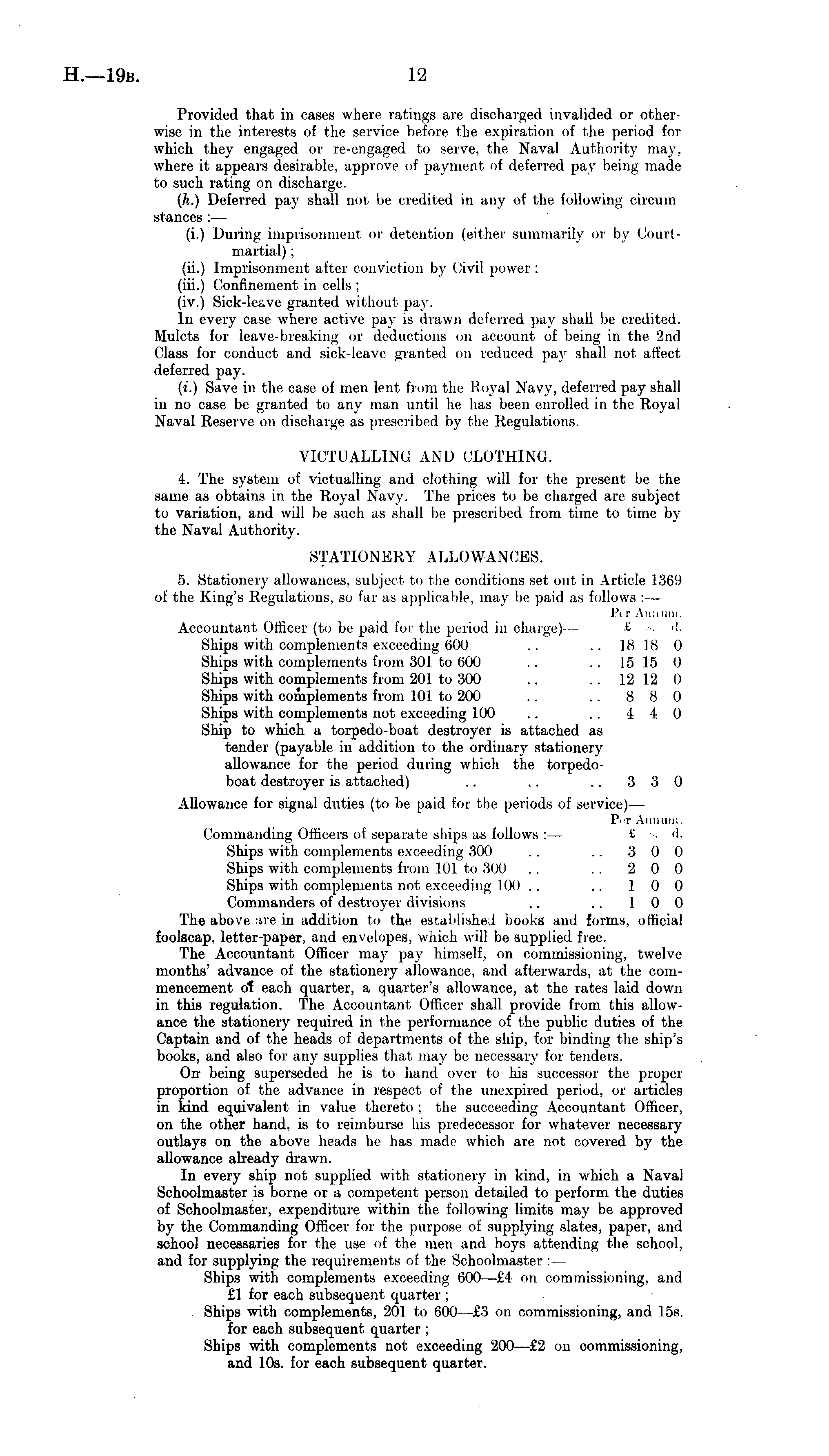 Provided that in cases where ratings are discharged invalided or otherwise in the interests of the service before the expiration of the period for which they engaged or re-engaged to serve, the Naval Authority may, where it appears desirable, approve of payment of deferred pay being made to such rating on discharge. (A.) Deferred pay shall not be credited in any of the following circum stances :— (i.) During imprisonment or detention (either summarily or by Courtmartial) ; (ii.) Imprisonment after conviction by Civil power : (iii.) Confinement in cells ; (iv.) Sick-leave granted without paw In every case where active pay is drawn deferred pay shall he credited. Mulcts for leave-breaking or deductions <>n account of being in the 2nd Class for conduct and sick-leave granted <m reduced pay shall not affect deferred pay. (i.) Save in the case of men lent from the Royal Navy, deferred pay shall in no case be granted to any man until he has been enrolled in the Royal Naval Reserve on discharge as prescribed by the Regulations. VICTUALLING AND CLOTHING. 4. The system of victualling and clothing will for the present be the same as obtains in the Royal Navy. The prices to be charged are subject to variation, and will be such as shall be prescribed from time to time by the Naval Authority. STATIONERY ALLOWANCES. 5. Stationery allowances, subject to the conditions set out in Article 1369 of the King's Regulations, so far as applicable, may be paid as follows :— li r Ann urn. Accountant Officer (to be paid lor the period in charge)— £ ■■• d. Ships with complements exceeding 600 .. .. 18 18 0 Ships with complements from 301 to 600 .. .. 15 15 0 Ships with complements from 201 to 300 .. .. 12 12 0 Ships with complements from 101 to 200 .. .. 8 8 0 Ships with complements not exceeding 100 .. .. 4 4 0 Ship to which a torpedo-boat destroyer is attached as tender (payable in addition to the ordinary stationery allowance for the period during which the torpedoboat destroyer is attached) .. .. .. 3 3 0 Allowance for signal duties (to be paid for the periods of service) — Por Annum. Commanding Officers of separate ships as follows : — £ • d. Ships with complements exceeding 300 .. .. 3 0 0 Ships with complements from 101 to 300 .. .. 2 0 0 Ships with complements not exceeding 100 .. .. 10 0 Commanders of destroyer divisions .. .. 10 0 The above are in addition to the established books and forms, official foolscap, letter-paper, and envelopes, which will be supplied free. The Accountant Officer may pay himself, on commissioning, twelve months' advance of the stationery allowance, and afterwards, at the commencement of each quarter, a quarter's allowance, at the rates laid down in this regulation. The Accountant Officer shall provide from this allowance the stationery required in the performance of the public duties of the Captain and of the heads of departments of the ship, for binding the ship's books, and also for any supplies that may be necessary for tenders. On- being superseded he is to hand over to his successor the proper proportion of the advance in respect of the unexpired period, or articles in kind equivalent in value thereto ; the succeeding Accountant Officer, on the other hand, is to reimburse his predecessor for whatever necessary outlays on the above heads be has made which are not covered by the allowance already drawn. In every ship not supplied with stationery in kind, in which a Naval Schoolmaster is borne or a competent person detailed to perform the duties of Schoolmaster, expenditure within the following limits may be approved by the Commanding Officer for the purpose of supplying slates, paper, and school necessaries for the use of the men and boys attending the school, and for supplying the requirements of the Schoolmaster :— Ships with complements exceeding 600—£4 on commissioning, and £1 for each subsequent quarter ; Ships with complements, 201 to 600—£3 on commissioning, and 15s. for each subsequent quarter ; Ships with complements not exceeding 200—£2 on commissioning, and 10s. for each subsequent quarter.