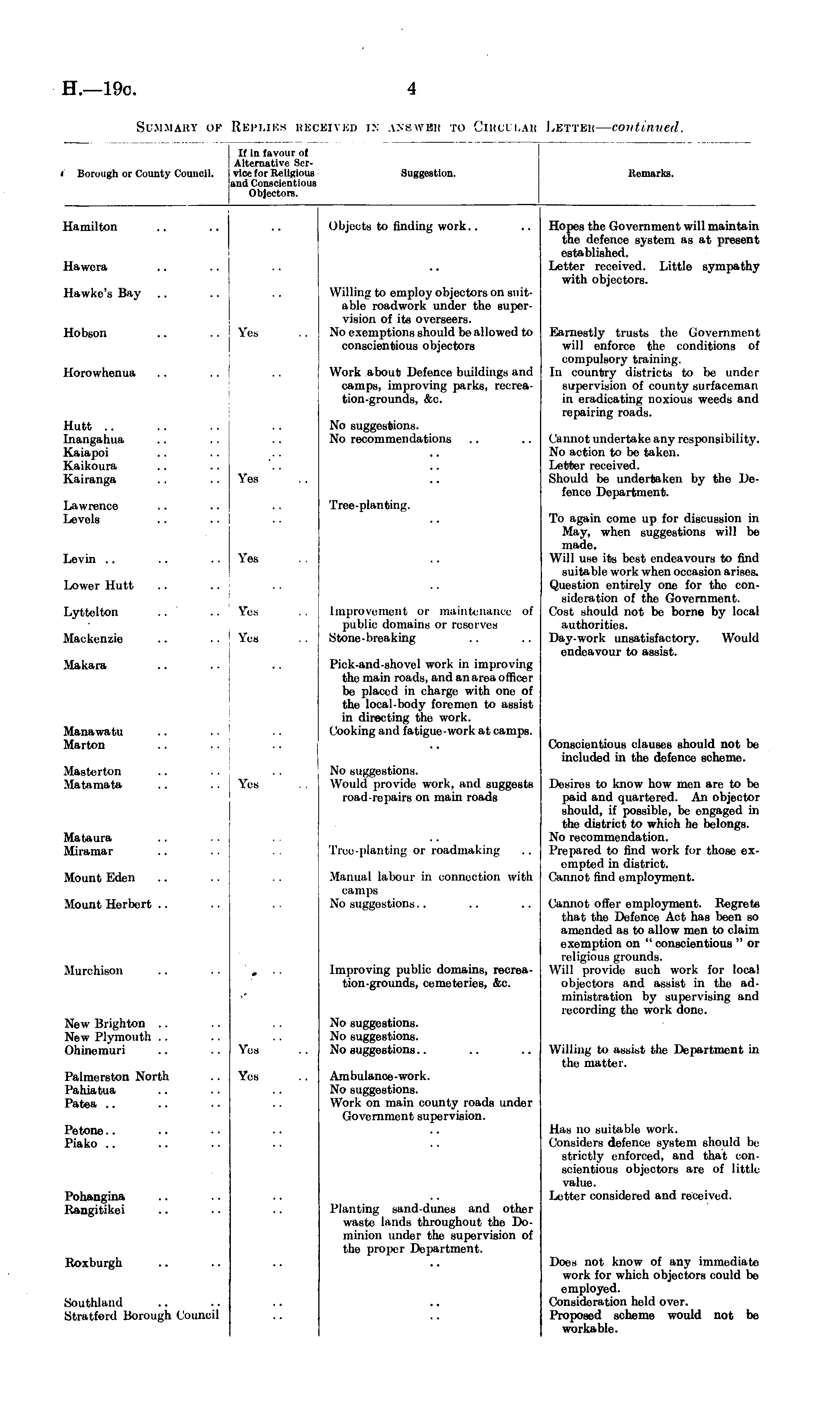 Borough or County Council. If in favour of Alternative Servicefor Religious and Conscientious Objectors. Suggestion. Hcmarks. Hamilton Objects to rinding work.. Hopes the Government will maintain the defence system as at present established. Letter received. Little sympathy with objectors. Hawera Hawkc's Bay Willing to employ objectors on suitable roadwork under the supervision of its overseers. No exemptions should be allowed to conscientious objectors Hobson Horowhenua Yes Work about Defence buildings and camps, improving parks, recrea-tion-grounds, &c. Earnestly trusts the Government will enforce the conditions of compulsory training. In country districts to be under supervision of county surfaceman in eradicating noxious weeds and repairing roads. Hutt lnangahua Kaiapoi Kaikoura Kairanga No suggestions. No recommendations ('aiinot undertake any responsibility. No action to be taken. Letter received. Should be undertaken by the Defence Department. Yes Lawrence Levels Tree-planting. Levin Lower Hutt Lyttelton Yes fee Improvement or maintenance of public domains or reserves Stone-breaking To again come up for discussion in May, when suggestions will be made. Will use its best endeavours to find suitable work when occasion arises. Question entirely one for the consideration of the Government. Cost should not be borne by local authorities. Day-work unsatisfactory. Would endeavour to assist. Mackenzie Yea Makara Pick-and-shovel work in improving the main roads, and an area officer be placed in charge with one of the local-body foremen to assist in directing the work. ( 'ooking and fatigue-work at camps. Manawatu Marton Conscientious clauses should not bo included in the defence scheme. Masterton Matamata Yea .No suggestions. Would provide work, and suggests road-repairs on main roads Desires to know how men are to be |>aid and quartered. An objector should, if possible, be engaged in the district to which he belongs. No recommendation. Prepared to find work for those exempted in district. Cannot find employment. Mataura Miramar Tree-planting or roadmaking Mount Eden Manual labour in connection with Mount Herbert camps No suggestions Cannot offer employment. Regrets that the Defence Act has been so amended as to allow men to claim exemption on " conscientious " or religious grounds. Will provide such work for local objeotors and assist in the administration by supervising and recording the work done. Murchison Improving public domains, recrea-tion-grounds, cemeteries, &c. New Brighton New Plymouth Ohinemuri No suggestions. No suggestions. No suggestions Palmerston North Pahiatua 1'atea .. Yes Yes Ambulance-work. No suggestions. Work on main county roads under (lovemment supervision. Willing to assist the Department in the matter. Petone Piako Has no .suitable work. Considers defence system should be strictly enforced, and that conscientious objectors are of little value. Letter considered and received. Pohangina Rangitikei Planting sand-dunes and other waste lands throughout the Dominion under the supervision of the propel Department. Roxburgh Does not know of any immediate work for which objectors could be employed. Consideration held over. Proposed scheme would not be workable. Southland Stratford Borough Council