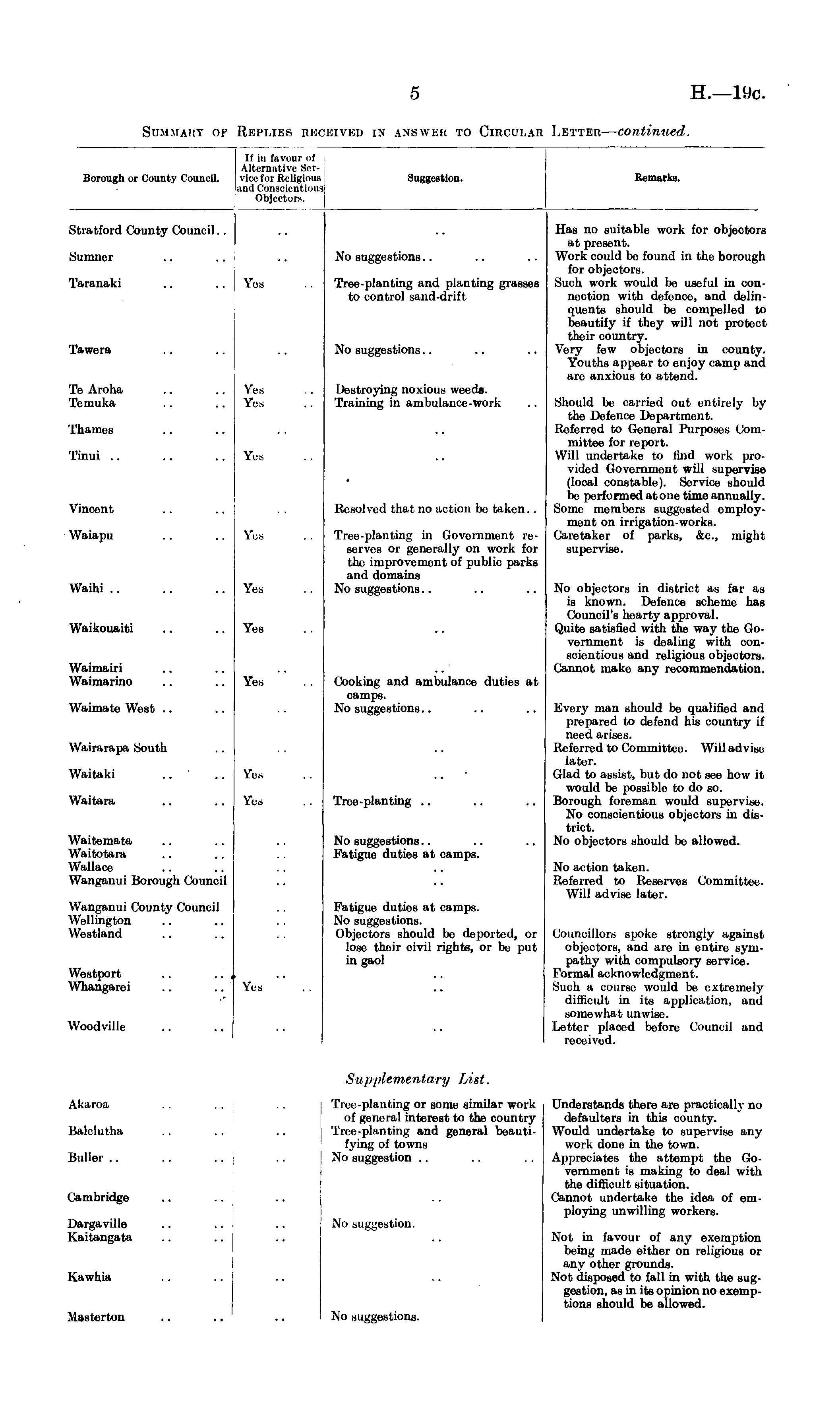 Borough or County Council. If in favour of Alternative *'■!■■ dee for Religious and Conscientious Objectors. Suggestion. Remarks. Stratford County Council.. Sumner Taranaki Yes Yes No suggestions.. Tree-planting and planting grasses to control sand-drift Has no suitable work for objectors at present. Work could be found in the borough for objectors. Such work would be useful in connection with defence, and delinquents should be compelled to beautify if they will not protect their country. Very few objectors in county. Youths appear to enjoy camp and are anxious to attend. Tawera No suggestions.. Te Aroha Temuka Vos Yes Yes Yes IJestroying noxious weede. Training in ambulance-work Should be carried out entirely by the Defence Department. Referred to General Purposes Committee for report. Will undertake to find work provided Government will supervise (local constable). Service should be performed atone time annually. Some members suggested employment on irrigation-works. Caretaker of parks, &c, might supervise. Thames Tinui Yes Yes Vincent Resolved that no action be taken.. Waiapu Waihi Yes Yes fee Yes Tree-planting in Government reserves or generally on work for the improvement of public parks and domains No suggestions Waikouaiti Yes Yes No objectors in district as far as is known. Defence scheme has Council's hearty approval. Quite satisfied with the way the Government is dealing with conscientious and religious objectors. Cannot make any recommendation. Waimairi Waimarino Yes Cooking and ambulance duties at camps. No suggestions.. Yes Waimate West Wairarapa South Waitaki See See Every man should be qualified and prepared to defend his country if need arises. Referred to Committee. Will advise later. Glad to assist, but do not see how it would be possible to do so. Borough foreman would supervise. No conscientious objectors in district. No objectors should be allowed. Waitara Yes Yes Tree-planting Waitemata Waitotara Wallace Wanganui Borough Council No suggestions Fatigue duties at camps. No action taken. Referred to Reserves Committee. Will advise later. Wanganui County Council Wellington Westland Fatigue duties at camps. No suggestionsObjectors should be deported, or lose their civil rights, or be put in gaol Councillors spoke strongly against objectors, and are in entire sympathy with compulsory service. Formal acknowledgment. Such a course would be extremely difficult in its application, and somewhat unwise. Letter placed before Council and received. Westport .. .. , Whangarei Yea Woodville Akaroa Suppleme ivtn ry L is t. Understands there are practically no defaulters in this county. Would undertake to supervise any work done in the town. Appreciates the attempt the Government is making to deal with the difficult situation. Cannot undertake the idea of employing unwilling workers. Balclutha Tree-planting or some similar work of general interest to the country Tree-planting and general beautifying of towns No suggestion Buller Cambridge Dargaville Kaitangata No suggestion. Not in favour of any exemption being made either on religious or any other grounds. Not disposed to fall in with the suggestion, as in its opinion no exemptions should be allowed. Kawhia Masterton No suggestions. NO SU!