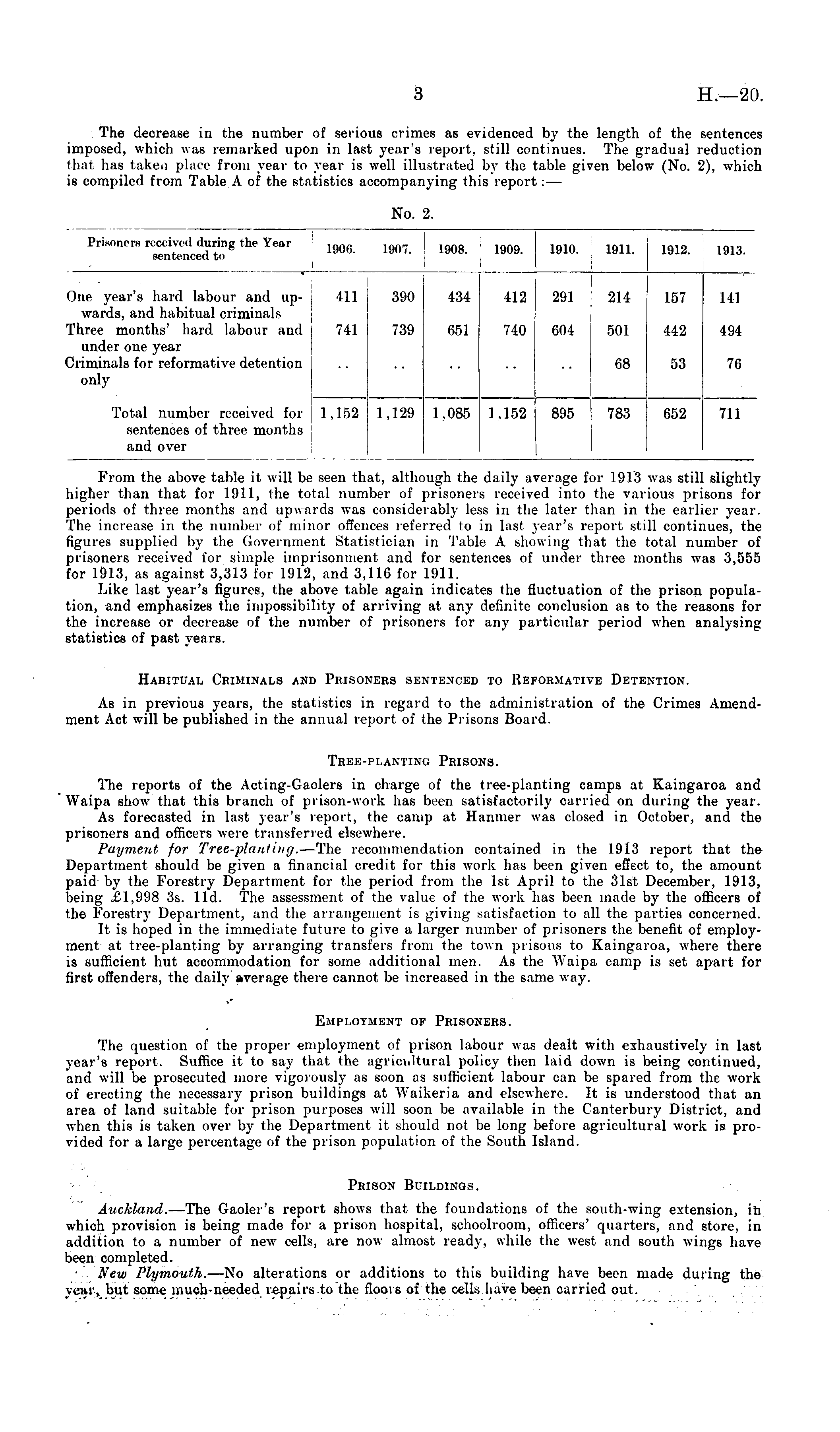 From the above table it will be seen that, although the daily average for 1913 was still slightly higher than that for 1911, (he total number of prisoners received into the various prisons for periods of three months and upwards was considerably less in the later than in the earlier year. The increase in the number of minor offences referred to in last year's report still continues, the figures supplied by the Government Statistician in Table A showing that the total number of prisoners received for simple imprisonment and for sentences of under three months was 3,555 for 1913, as against 3,313 for 1912, and 3,116 for 1911. Like last year's figures, the above table again indicates the fluctuation of the prison population, and emphasizes the impossibility of arriving at any definite conclusion as to the reasons for the increase or decrease of the number of prisoners for an} , particular period when analysing statistics of past years. Habitual Criminals and Prisoners sentenced to Reformative Detention. As in previous years, the statistics in regard to the administration of the Crimes Amendment Act will be published in the annual report of the Prisons Board. Tree-planting Prisons. The reports of the Acting-Gaolers in charge of the tree-planting camps at Kaingaroa and Waipa show that this branch of prison-work has been satisfactorily carried on during the year. As forecasted in last year's report, the camp at Hanmer was closed in October, and the prisoners and officers were transferred elsewhere. Payment for Tree-planting. —The recommendation contained in the 1913 report that the Department should be given a financial credit for this work has been given effect to, the amount paid by the Forestry Department for the period from the Ist April to the 31st December, 1913, being £1,998 3s. lid. The assessment of the value of the work has been made by the officers of the Forestry Department, and the arrangement is giving satisfaction to all the parties concerned. It is hoped in the immediate future to give a larger number of prisoners the benefit of employment at tree-planting by arranging transfers from the town prisons to Kaingaroa, where there is sufficient hut accommodation for some additional men. As the Waipa camp is set apart for first offenders, the daily average there cannot be increased in the same way. Employment of Prisoners. The question of the proper employment of prison labour was dealt with exhaustively in last year's report. Suffice it to say that the agricultural policy then laid down is being continued, and will be prosecuted more vigorously as soon ;;s sufficient labour can be spared from the work of erecting the necessary prison buildings at Waikeria and elsewhere. It is understood that an area of land suitable for prison purposes will soon be available in the Canterbury District, and when this is taken over by the Department it should not be long before agricultural work is provided for a large percentage of the prison population of the South Island. Prison Buildings. Auckland. —The Gaoler's report shows that the foundations of the south-wing extension, in which provision is being made for a prison hospital, schoolroom, officers' quarters, and store, in addition to a number of new cells, are now almost ready, while the west and south wings have been completed. New Plymouth. —No alterations or additions to this building have been made during the year, but some much-needed repairs to the floois of the cells have been carried out.