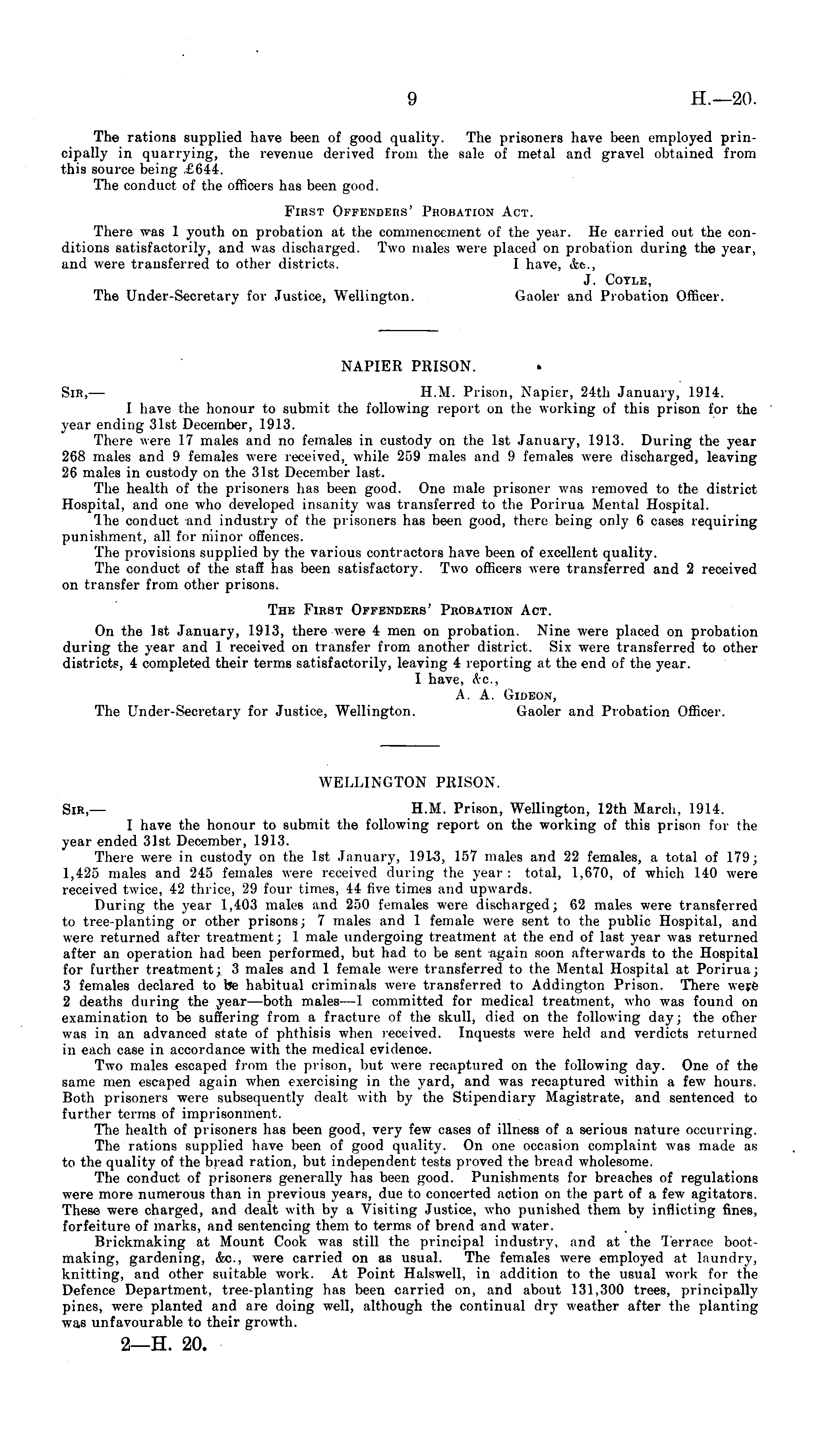 The rations supplied have been of good quality. The prisoners have been employed principally in quarrying, the revenue derived from the sale of metal and gravel obtained from this source being £644. The conduct of the officers has been good. Fibst Offenders , Probation Act. There was 1 youth on probation at the commencement of the year. He carried out the conditions satisfactorily, and was discharged. Two males were placed on probation during the year, and were transferred to other districts. I have, &c, J. Coyle, The Under-Secretary for Justice, Wellington. Gaoler and Probation Officer. NAPIER PRISON. Sin, — H.M. Prison, Napier, 24th January, 1914. I have the honour to submit the following report on the working of this prison for the year ending 31st December, 1913. There were 17 males and no females in custody on the Ist January, 1913. During the year 268 males and 9 females were received, while 259 males and 9 females were discharged, leaving 26 males in custody on the 31st December last. The health of the prisoners has been good. One male prisoner was removed to the district Hospital, and one who developed insanity was transferred to the Porirua Mental Hospital. The conduct and industry of the prisoners has been good, there being only 6 cases requiring punishment, all for minor offences. The provisions supplied by the various contractors have been of excellent quality. The conduct of the staff has been satisfactory. Two officers were transferred and 2 received on transfer from other prisons. The First Offenders' Probation Act. On the Ist January, 1913, there were 4 men on probation. Nine were placed on probation during the year and 1 received on transfer from another district. Six were transferred to other districts, 4 completed their terms satisfactorily, leaving 4 reporting at the end of the year. I have, A-c, A. A. Gideon, The Under-Secretary for Justice, Wellington. Gaoler and Probation Officer.