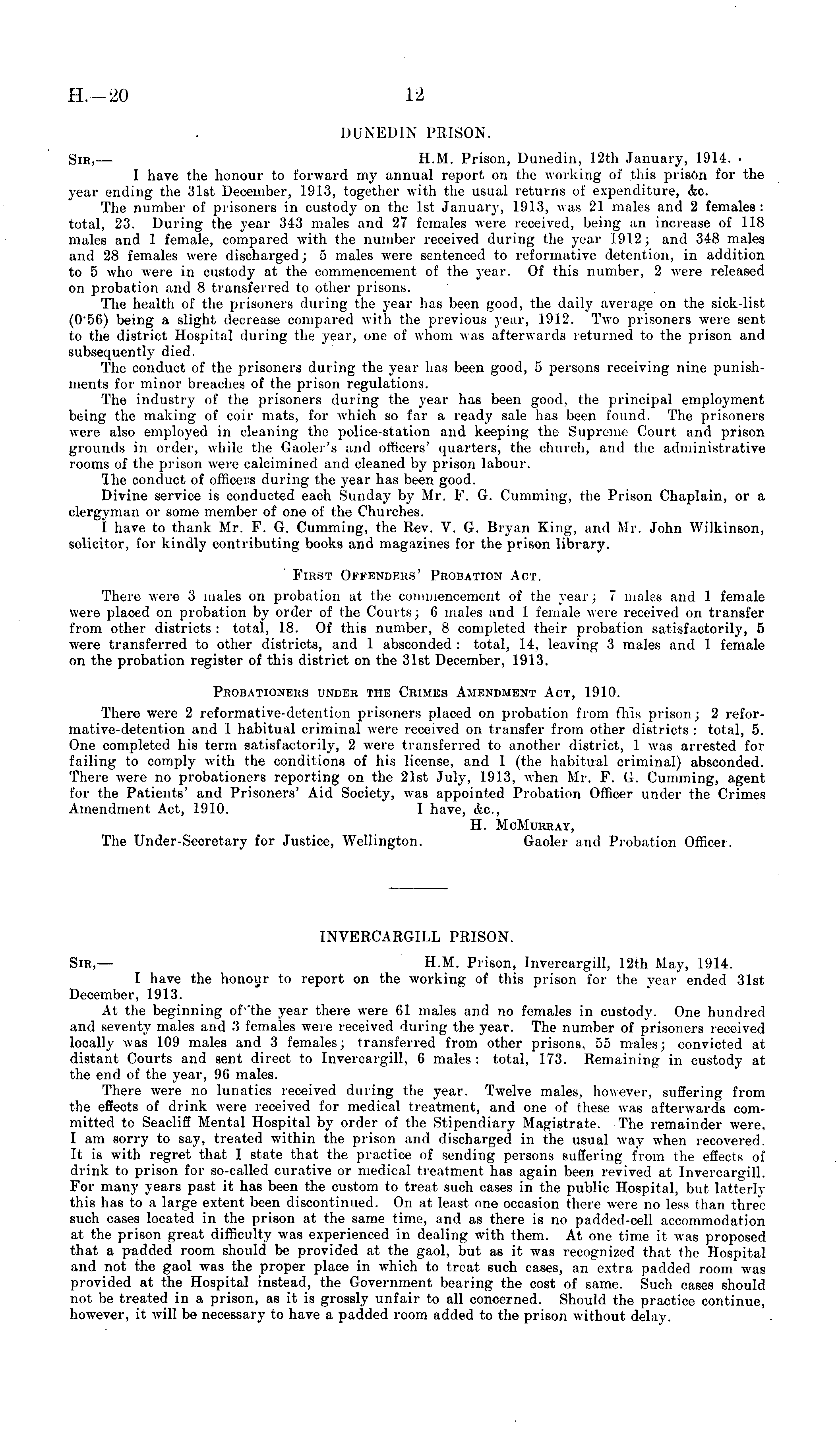 INVERCARGILL PRISON. Sir, — H.M. Prison, Invercargill, 12th May, 1914. I have the honour to report on the working of this prison for the year ended 31st December, 1913. At the beginning of'the year there were 61 males and no females in custody. One hundred and seventy males and 3 females were received during the year. The number of prisoners received locally was 109 males and 3 females; transferred from other prisons, 55 males; convicted at distant Courts and sent direct to Invercargill, 6 males: total, 173. Remaining in custody at the end of the year, 96 males. There were no lunatics received during the year. Twelve males, however, suffering from the effects of drink were received for medical treatment, and one of these was afterwards committed to Seacliff Mental Hospital by order of the Stipendiary Magistrate. The remainder were, I am sorry to say, treated within the prison and discharged in the usual way when recovered. It is with regret that I state that the practice of sending persons suffering from the effects of drink to prison for so-called curative or medical treatment has again been revived at Invercargill. For many years past it has been the custom to treat such cases in the public Hospital, but latterly this has to a large extent been discontinued. On at least one occasion there were no less than three such cases located in the prison at the same time, and as there is no padded-cell accommodation at the prison great difficulty was experienced in dealing with them. At one time it was proposed that a padded room should be provided at the gaol, but as it was recognized that the Hospital and not the gaol was the proper place in which to treat such cases, an extra padded room was provided at the Hospital instead, the Government bearing the cost of same. Such cases should not be treated in a prison, as it is grossly unfair to all concerned. Should the practice continue, however, it will be necessary to have a padded room added to the prison without delay.