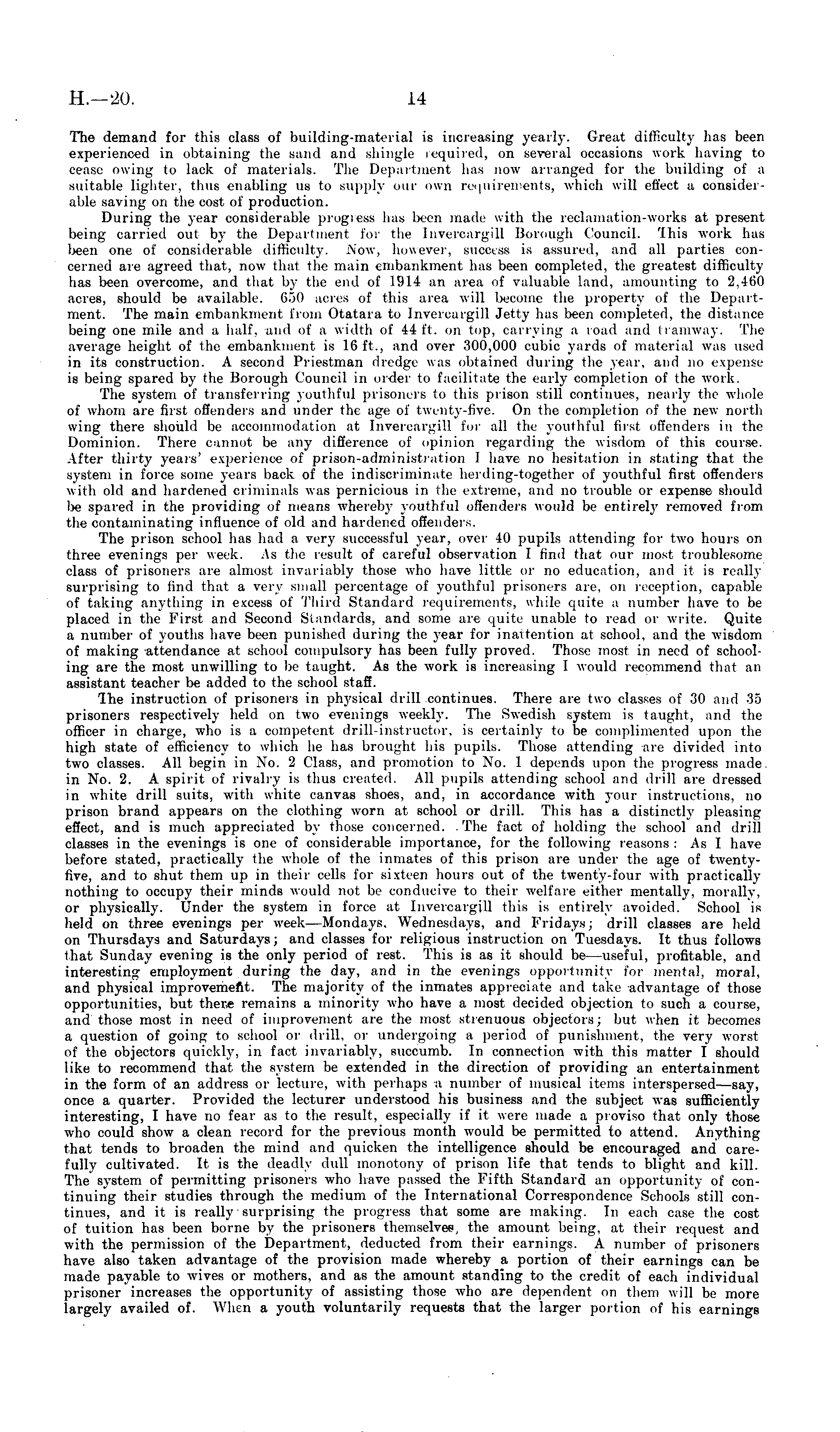 The demand for this class of building-material is increasing yearly. Great difficulty has been experienced in obtaining the sand and shingle required, on several occasions work having to d owing i<i lark of materials. The Departmeni has now arranged for the building of a suitable lighter, thus enabling us to supply our own requirements, which will effect a considerable saving on the cost of production. During the year considerable progress has been made with the reclamation-works at present being- carried out by the Departmeni for the Invercargill Borough Council. This work has been one of considerable difficulty. \ov, however, sucoess is assured, and all parties concerned are agreed that, now thai the main embankment has been completed, the greatest difficulty has been overcome, and that by the end of i '.) l I. an area "!' valuable land, amounting to 2,460 acres, should be available. 650 acres of this area will become the property of the Department. The main embankment From Otatara to Invercargill Jetty has been completed, the distance being one mile and a hall', and oi a width of 44ft. on top, carrying a road ami tramway. The average height of the embankment is Mi ft., and over 300,000 cubic yards of material was used in its construction. A second Priestman dredge was obtained during the year, and no expi is being spared by the Borough Council in order to facilitate the early completion of the work. The system of transferring youthful prisoners to this prison still continues, nearly the whole of whom are first offenders and under tin age of twenty-five. On the completion of the new north wing there should be accora dation at Invercargil] For all the youthful firsi offenders in the Dominion. There cannot be any difference of opinion regarding the wisdom of this course. After thirty years' experience of prison-administration I have no hesitation in stating that the system in force some years back of the indiscriminate herding-together of youthful first offenders with old and hardened criminals was pernicious in the extreme, and no trouble or expense should be spared in the providing of means whereby youthful offenders would be entirely removed from the contaminating influence of old and hardened offenders. The prison school has had a very successful year, over 40 pupils attending for two hours on three evenings per week. As the result of careful observation I find that our most troublesome class of prisoners are almost invariably those who have little or no education, and it is really surprising to find that a very small percentage of youthful prisoners are. on reception, oapable of taking anything in excess of Third Standard requirements, while quite a number have to be placed in the First and Second Standards, and some are quite unable to read or write. Quite a number of youths have been punished during the year for inattention at school, and the wisdom of making attendance at school compulsory has been fully proved. Tho ied of schooling are the most unwilling to lie taught. As the work is increasing 1 would recommend assistant teacher be added to the school staff. The instruction of prisoners in physical drill continues. There are two classes of :)() and ■'>■"> prisoners respectively held on two evenings weekly. The Swedish system is taught, and the officer in charge, who is a competent drill-instructor, is certainly to be complimented upon the high state of efficiency to which he has brought his pupils. Those attending are divided into two classes. All begin in No. 'I Class, and promotion to No. 1 depends upon the progress made in No. 2. A spirit of rivalry is thus created. All pupils attending school and drill are dressed in white drill suits, with white canvas shoes, and, in accordance with your instructions, no prison brand appears on the clothing worn at school or drill. This has a distinctly pleasing effect, and is much appreciated by those concerned. .The fact of holding the school and drill classes in the evenings is one of considerable importance, for the following reasons : As I have before stated, practically the whole of the inmates of this prison are under the age of twentyfive, and to shut them up in their cells for sixteen hours out of the twenty-four with practically nothing to occupy their minds would not be conducive to their welfare either mentally, morally, or physically. Under the system in force at Invercargill this is entirely avoided. School is held on three evenings per week—Mondays. Wednesdays, and Fridays; drill classes are held on Thursdays and Saturdays; and classes for religious instruction on Tuesdays. It thus follows that Sunday evening is the only period of rest. This is as it should be —useful, profitable, and interesting employment during the day. and in the evenings opportunity for mental, moral, and physical improvement. The majority of the inmates appreciate and take advantage of those opportunities, but there remains a minority who have a most decided objection to such a course, and those most in need of improvement are the most strenuous objectors; but when it becomes a question of going to school or drill, or undergoing a period of punishment, the. very worst of the objectors quickly, in fact invariably, succumb. In connection with this matter I should like to recommend that the system be extended in the direction of providing an entertainment in the form of an address or lecture, with perhaps a number of musical items interspersed—say, once a quarter. Provided the lecturer understood his business and the subject was sufficiently interesting, I have no fear as to the result, especially if it were made a proviso that only those who could show a clean record for the previous month would be permitted to attend. Anything that tends to broaden the mind and quicken the intelligence should be encouraged and carefully cultivated. It is the deadly dull monotony of prison life that tends to blight and kill. The system of permitting prisoners w