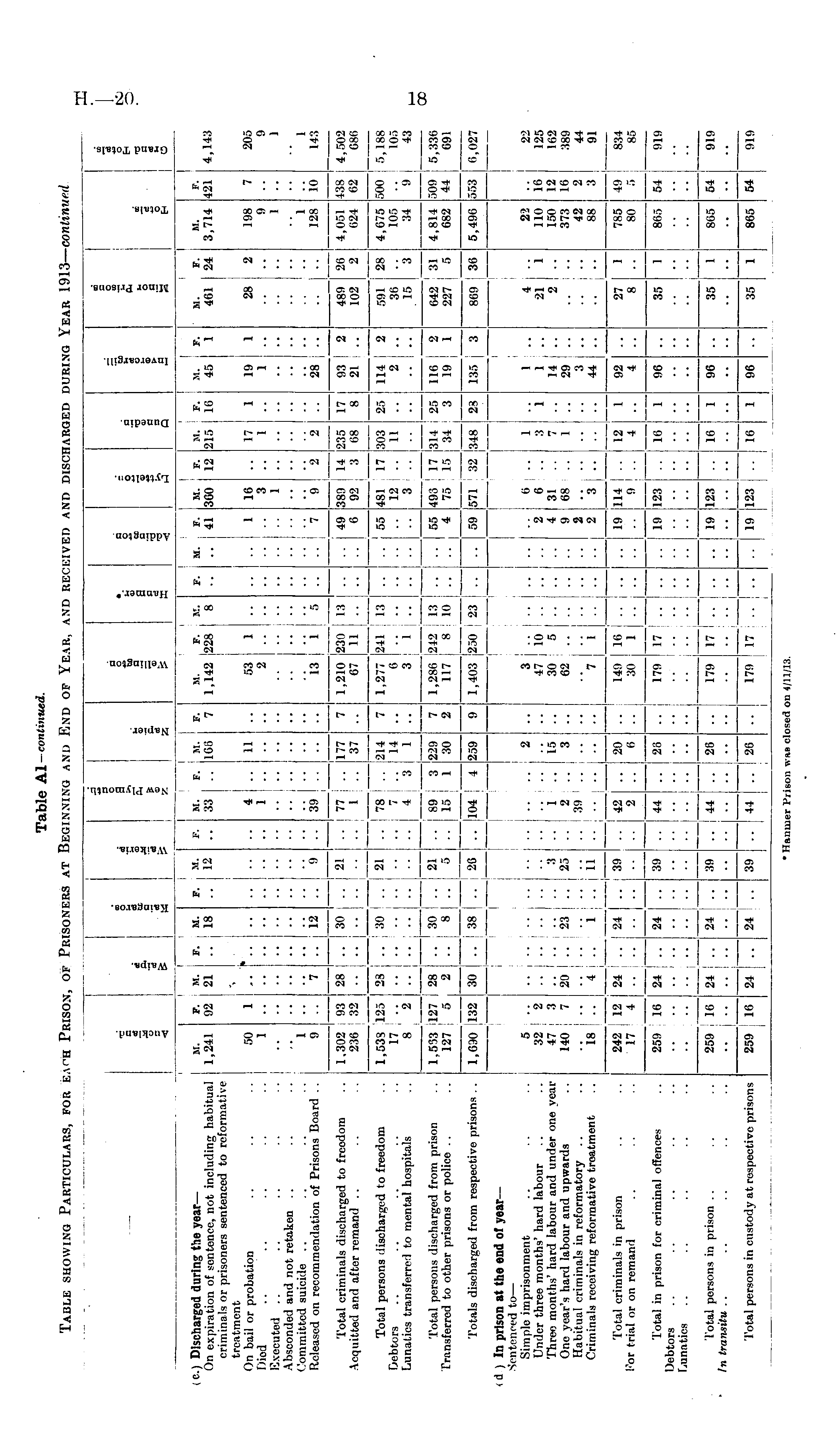 Table A1— continued. Table showing Particulars, for Prison, of Prisoners at Beginning and End of Year, and received and discharged during Year 1913— continued.