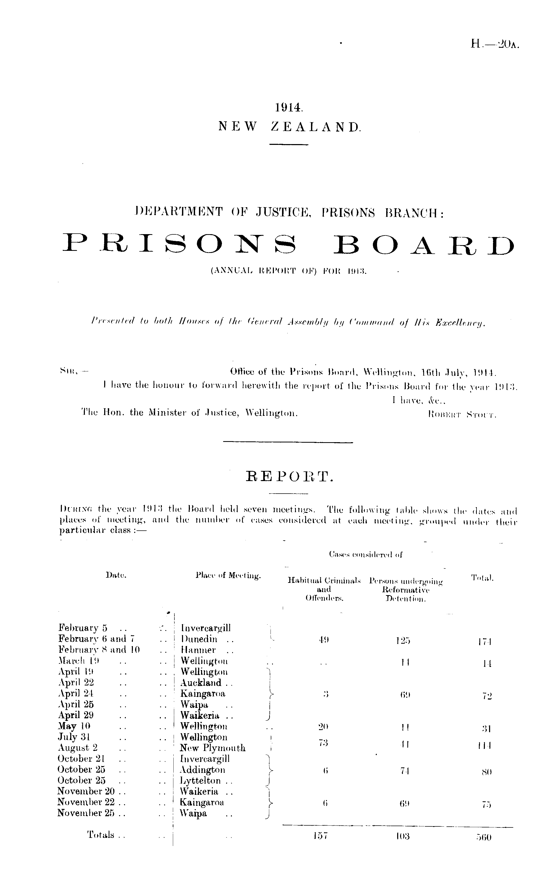 Sn:. Officeofthe Prisons Board, Wellington, 16th July, 1914. I have the honour to forward herewith the report of the Prisons Board for the year 1913 1 have. 4c, The Hon. the Minister of Justice, Wellington. Robert Stout.