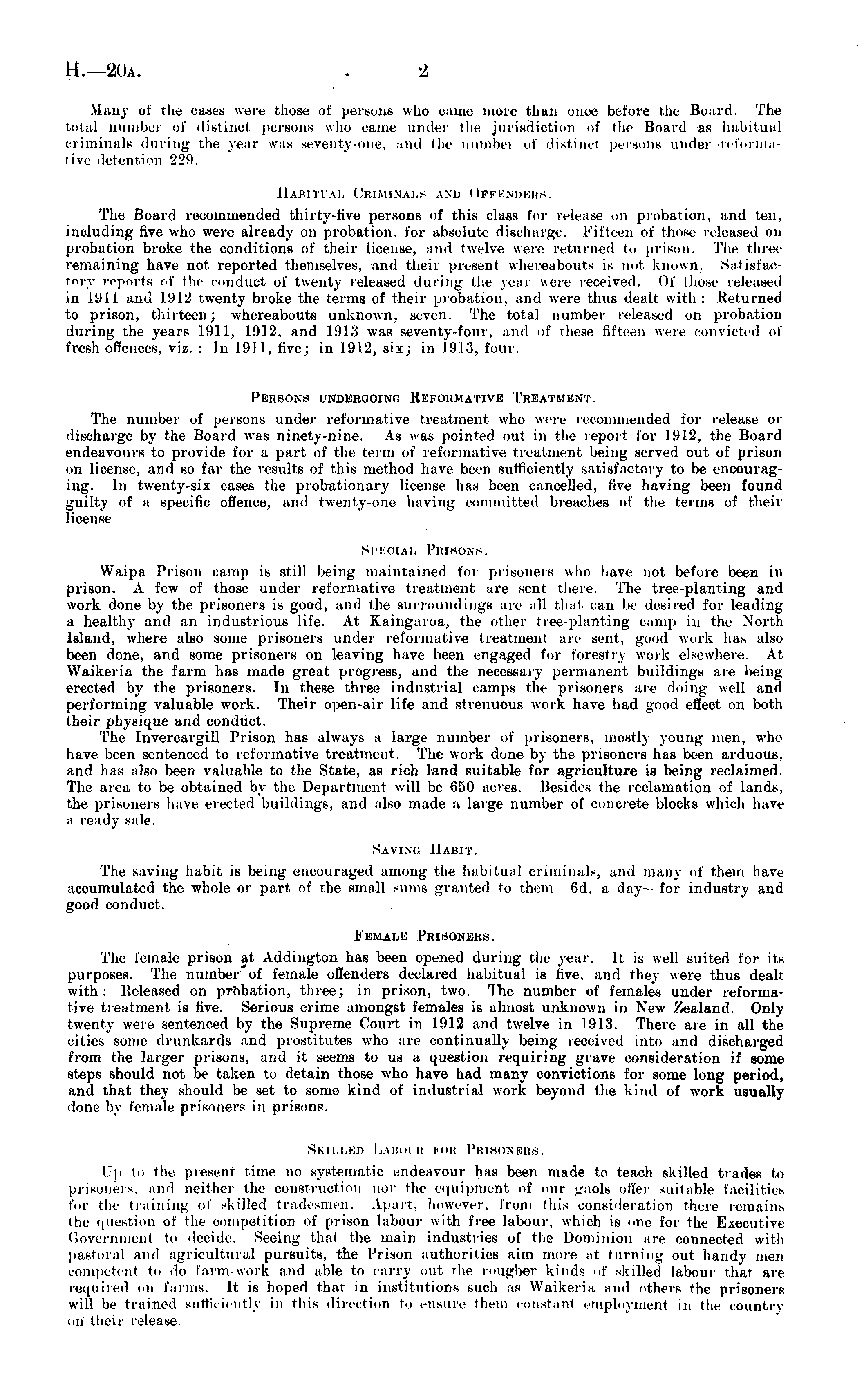 Many of the cases were those of persons who came more than once before the Board. The total number of distinct persons who came under the jurisdiction of the Board as habitual criminals during the year was seventy-one. and the number of distinct persons under reforma tive detention 229. Habitual Criminals ami Offenders. The Board recommended thirty-five persons of this class for release on probation, and ten. including five who were already on probation, for absolute discharge. Fifteen of those released on probation broke the conditions of their license, and twelve were returned to prison. The three remaining have not reported themselves, and their present whereabouts is not known, Satisfac tory reports of tin conduct of twenty released during the year were received. Of those released m 1911 and 1912 twenty broke the terms of their probation, and were thus dealt with : Returned to prison, thirteen; whereabouts unknown, seven. The total number released on probation during the years 1911, 1912, and 1913 was seventy-four, and of these fifteen were convicted of fresh offences, viz. : In 1911, five; in 1912, six; in 1913, four. Persons undergoing Reformative Treatment. The number of persons under reformative treatment who were recommended for release or discharge by the Board was ninety-nine. As was pointed out in the report for 1912, the Board endeavours to provide for a part of the term of reformative treatment being served out of prison on license, and so far the results of this method have been sufficiently satisfactory to be encouraging. In twenty-six cases the probationary license has been cancelled, live having been found guilty of a specific offence, and twenty-one having committed breaches of the terms of their license. Special Prisons. Waipa Prison camp is still being maintained for prisoners who have not before been in prison. A few of those under reformative treatment tire sent there. The tree-planting and work done by the prisoners is good, and the surroundings :ue all that can be desired for leading a healthy and an industrious life. At Kaingaroa, the other tree-planting camp in the North Island, where also some prisoners under reformative treatment are sent, good work has also been done, and some prisoners on leaving have been engaged for forestry work elsewhere. At Waikeria the farm litis made great progress, and the necessary permanent buildings are l)eing erected by the prisoners. In these three industrial camps the prisoners are doing well and performing valuable work. Their open-air life and strenuous work have had good effect on both their physique and conduct. The Invercargill Prison has always a large number of prisoners, mostly young men. who have been sentenced to reformative treatment. The work done by the prisoners has been arduous, and has also been valuable to the State, as rich land suitable for agriculture is being reclaimed. The area to be obtained by the Department will be 650 acres. Besides the reclamation of lands, the prisoners have erected buildings, and also made a large number of concrete blocks which have a ready sale. Saving Habit. The saving habit is being encouraged among the habitual criminals, and many of them have accumulated the whole or part of the small sums granted to them —6d. a day—for industry and good conduct. Female Prisoners. The female prison at Addington has been opened during the year. It is well suited for its purposes. The number of female offenders declared habitual is five, and they were thus dealt with: Released on probation, three; in prison, two. r lhe number of females under reformative treatment is five. Serious crime amongst females is almost unknown in New Zealand. Only twenty were sentenced by the Supreme Court in 1912 and twelve in 1913. There are in all the cities some drunkards and prostitutes who are continually being received into and discharged from the larger prisons, and it seems to us a question requiring grave consideration if some steps should not be taken to detain those who have had many convictions for some long period, and that they should be set to some kind of industrial work beyond the kind of work usually done by female prisoners in prisons. Skilled Labour fob Prisoners. Up to the present time no systematic endeavour has been made to teach skilled trades to prisoners, and neither the construction nor the equipment of our gaols offer suitable facilities for the training of skilled tradesmen. Apart, however, from this consideration there remains the questi f the competition of prison labour with free labour, which is one for the Executive Government to decide. Seeing that the main industries of the Dominion are connected with pastoral and agricultural pursuits, the Prison authorities aim more at turning out handy men oompetenl to do farm-work and able to entry out tli<' rougher kinds of skilled labour that are required on farms. It is hoped that in institutions such as Waikeria and others the prisoners will be trained sufficiently in this direction to ensure them constant employment in the country on their release.