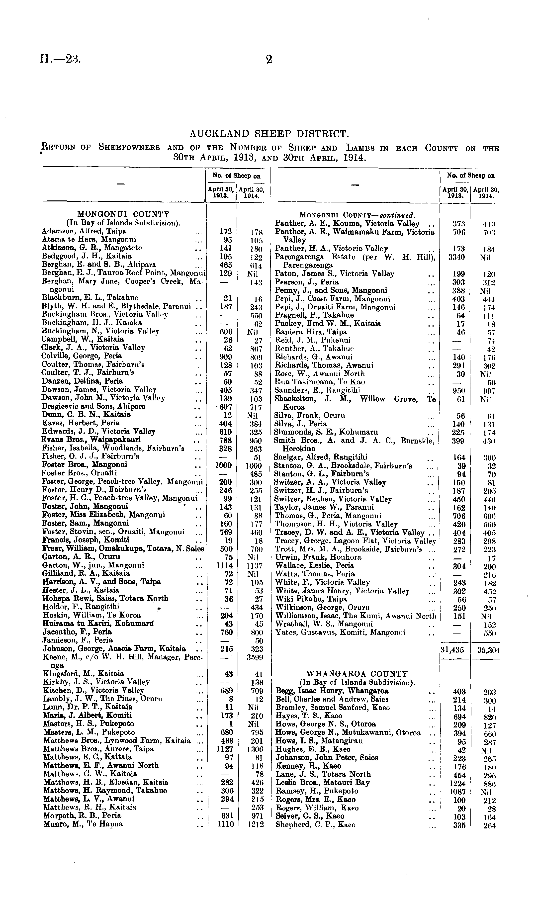 AUCKLAND SHEEP DISTRICT. Return of Sheepowners and of the Number of Sheep and Lambs in each County on the 30th April, 1913, and 30th April, 1914.