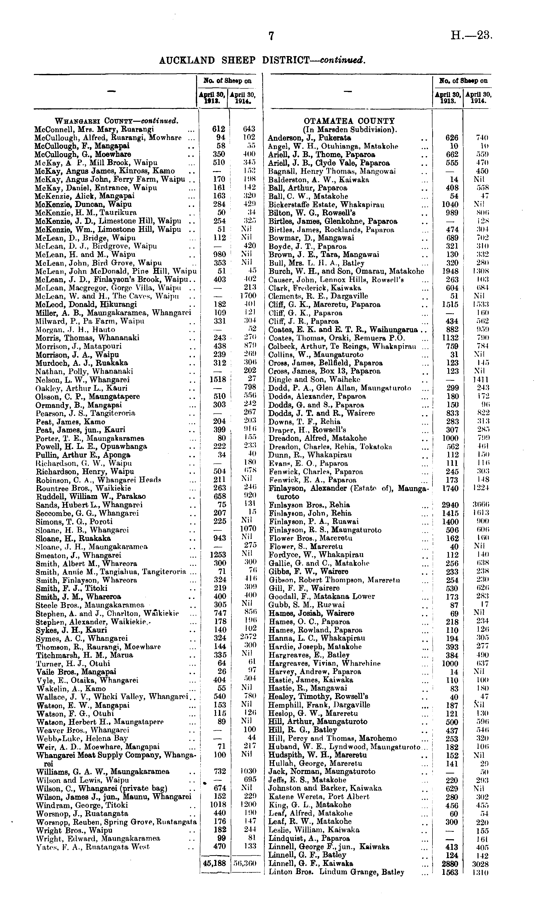 No. of ShMp on April 30, April 30, 1913. 1914. OTAMATEA COUNTY (In Marsden Subdivision). Anderson, J., Pukerata .. 626 Angel, W. H., Otuhianga, Matakohe ... 10 Ariell, J. B., Thome, Paparoa .. 662 Ariell, J. B., Clyde Vale, Paparoa .. 555 Bagnall, Henry Thomas, Mangowai .. — Balderston, A. W., Kaiwaka ... 14 Ball, Arthur, Paparoa .. 408 Ball.C. W., Matakohe ... 54 Biekerstaffe Estate, Whakapirau ... 1040 Bilton, W. G., Rowsell's .. 989 Birtles, James, Glenkohne, Paparoa .. —■ Birtles, James, Rocklands, Paparoa ... 474 Bowmar, D., Mangawai .. 689 Boyde, J. T., Paparoa ... 321 Brown, J. E., Tara, Mangawai .. 130 Bull, Mrs. L. 11. A.,Batley ... 320 Burch, W. H., and Son, Omarau, Matakohe 1948 Causer, John, Lennox Hills, Rowsell's ... 263 Clark, Frederick, Kaiwaka ... 604 Clements, R. E., Dargaville .. 51 Cliff, G. K., Mareretu, Paparoa .. 1515 Cliff, G. K, Paparoa ... — Cliff, J. R, Paparoa ... 434 Coates, E. K. and E. T. R., Waihungarua .. 882 Coates, Thomas, Oraki, Retnuera P.O. ... 1132 Colbeck, Arthur, Te Reinga, Whakapirau ... 759 Collins, W., Maungaturoto ... 31 Cross, James, Bellfield, Paparoa ... 123 Cross, James, Box 13, Paparoa ., 123 Dingle and Son, Waiheke .. — Dodd, P. A., Glen Allan, Maungaturoto ... 299 Dodds, Alexander, Paparoa ... 180 Dodds, G. and S., Paparoa ... 150 Dodds, J. T. and R., Wairere .. 833 Downs, T. F., Rehia ... 283 Draper, H., Rowsell's ... 307 Dreadon, Alfred, Matakohe .. 1000 Dreadon, Charles, Rehia, Tokatoka ... 502 Dunn, R., Whakapirau .. 112 Evans, E. O, Paparoa ... Ill Fenwick, Charles, Paparoa .. 245 Fenwick, E. A., Paparoa ... 173 Finlayson, Alexander (F.stato of), Maunga- 1740 turoto Finlayson Bros., Rehia ... 2940 Finlayson, John, Rehia ... 1415 Finlayson, P. A., Ruawni ... 1400 Finlayson, R. S., Maungaturoto .. 500 Flower Bros., Mareretu ... 162 Flower, S.. Mareretu ... 40 Fordyce, W., Whakapirau .. 112 Gallie, G. and C, Matakohe ... 256 Gibbs, F. W., Wairere .. 233 Gibson, Robert Thompson, Mareretu ,.. 254 Gill, F. F., Wairere 530 Goodall, F., Matakana Lower ... i 173 Gubb, S. M., Ruawai .. 87 Hames, Josiah, Wairere .. 69 Hames, O. O, Paparoa ... 218 Hames, Rowland, Paparoa ... 110 Hanna, L. C, Whakapirau ,. i 194 Hardie, Joseph, Matakohe ... 393 Hargreaves, E., Batley ... 384 Hargreaves, Vivian, Wharehine ... 1000 Harvey, Andrew, Paparoa ... 14 Hastie, James, Kaiwaka ... 110 Hastie, R., Mangawai .. 83 Healey, Timothy, Rowsell's .. 40 Hemphill, Frank, Dargaville ... 187 Heslop, G. W., Mareretu ... 121 Hill, Arthur, Maungaturoto .. 500 Hill, R. G., Batley .. 437 Hill, Percy and Thomas, Marohemo ... 253 Huband, W. E., Lyndwood, Maungaturoto . 182 Hudspith, W. H., Mareretu .. 152 Hullah, George, Mareretu ... 141 Jack, Norman, Maungaturoto .. — Jeffs, E. S., Matakohe ... 220 Johnston and Barker, Kaiwaka .. 629 Katcue Wereta, Port Albert ... 280 King, G. L, Matakohe 456 Leaf, Alfred, Matakohe ... 60 Leaf, R. W., Matakohe .. 300 Leslie, William, Kaiwaka .. — Lindquist, A., Paparoa ... — Linnell, George F., jun., Kaiwaka ... 413 Linnell, G. F., Batley .. 124 Linnell, G. F., Kaiwaka ... 2880 Linton Bros. Lindum Grange, Batley ... 1563 740 10 .-,.79 1711 450 Nil .-,.-,s 47 Nil 806 128 .",01 702 31(1 532 280 I 308 103 684 Nil I 533 I 011 502 959 7! II1 784 Nil 145 Nil 1 II1 243 172 90 822 313 2Sr, 799 101 150 110 303 148 I 22 I 3000 1613 110(1 000 loo Nil 140 03S 238 250 020 283 17 Nil 251 120 305 277 190 037 Nil 100 IMi 17 Nil 130 .790 540 320 106 Nil 29 .-,0 293 Nil 502 455 54 220 155 101 405 142 3028 1510