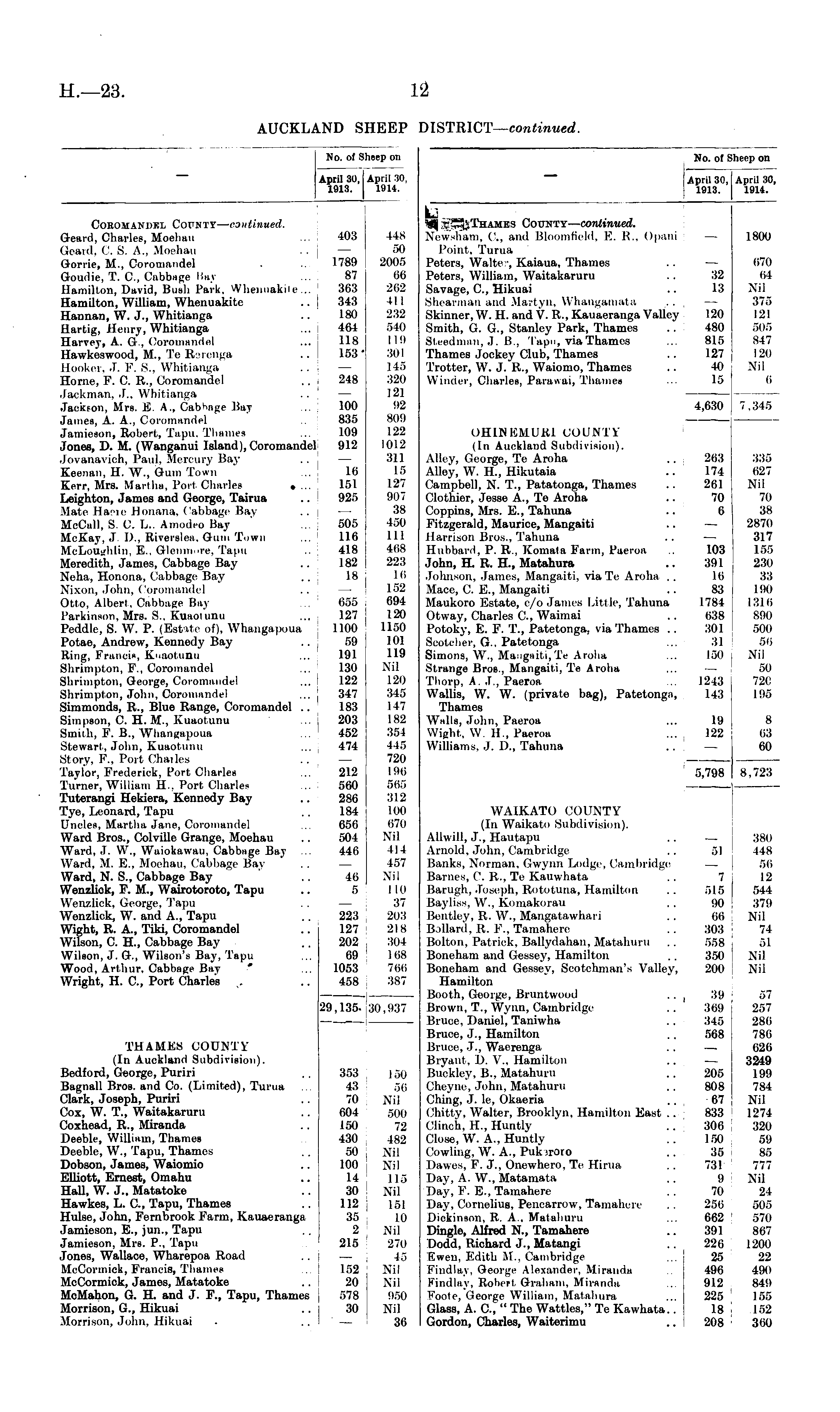 No. of Sheep on April 30, April 30. 1913. 1914. Cobomandkl County— continued. Geard, Charles, Moehaii ... 403 Geard, ('. S. A.. Moehau .. — Gorrie, M., Coromandel . 1789 Goudie, T. ft, Cabbage Kay ... 87 Hamilton, David, Bush Park. Whenuakite 363 Hamilton, William, Whenuakite .. [ 343 Hannan, W. J., Whitianga .. 180 Ilartig, Henry, Whitianga ... 464 Harvey, A. G., Coromandel ... 118 Hawkeswood, M., Te Rsrenga . ■ 153' Hooker, J. F. S., Whitianga .. — Home, F. C. R., Coromandel . . 248 Jackman, J., Whitianga .. — Jackfon, Mrs. E. A., Cabbage Bay .. 100 James, A. A., Coromandel 835 Jamieson, Robert, Tapu. Thamea ... 109 Jones, D. M. (Wanganui Island), Coromandel 912 Jovanavioh, Paul. Mercury Bay .. — Keenan, II. W., Gum Town . 16 Kerr, Mrs. Martha, Port Charles . ... 151 Leighton, James and George, Tairua .. 925 Mate lla-n- lloiiana. Cabbage Bay .. — McCall, S. O. L.. Amodeo Bay ... 505 McKay, J I)., Riverslea. Gum Town ... 116 McLoUifhlin, E., Glenmore, Tapu 418 Meredith, James, Cabbage Bay 182 Neha, Honona, Cabbage Bay . . 18 Nixon, John, Coromandel .. —■ Otto, Albert, Cabbage Bay 055 Parkinson, Mrs. S.. Kuaotunu ... 127 Peddle, S. W. P. (Estite of). Whangapoua 1100 Potae, Andrew, Kennedy Bay .. 59 ' Ring, Francis, Kuaotnnu ... 191 Shrimpton, F., Coromandel .. 130 Shrimpton, George, Coromandel ... 122 Shrimpton, John, Coromandel ... 347 Simmonds, R., Blue Range, Coromandel .. 183 Simpson, C. H. M., Kuaotnnu 203 Smith, F. B., Whangapoua 452 Stewart, John, Kuaotnnu ... 474 Story, P., Port Charles .. — Taylor, Frederick, Port. Charles ... 212 Turner, William H., Port Charles ... 500 Tuterangi Hekiera, Kennedy Bay .. 286 Tye, Leonard, Tapu .. 184 Uncles, Martha Jane, Coromandel ... 656 Ward Bros., Colville Grange, Moehau .. 504 Ward, J. W., Waiokawau, Cabbage Bay ... 446 Ward. M. E., Mocha)t, Cabbage Bay .. — Ward, N. S., Cabbage Bay .. 46 Wenzlick, F. M., Wairotoroto, Tapu .. 5 Wenzlick, George. Tapu . . — Wenzlick, W. and A., Tapu .. 223 Wight, R. A., Tiki, Coromandel .. 127 Wilson, C. H., Cabbage Bay .. 202 Wilson, J. G., Wilson's Bav, Tapu ... 69 Wood, Arthur. Cabbage Bav * ... 1053 Wright, H. ft, Port Charles ,. .. 458 29,135. 448 50 2005 oii 202 411 232 540 119 5(11 145 520 121 92 809 122 1012 311 15 127 907 38 150 111 468 223 10 152 694 120 1150 101 119 Nil 120 315 147 182 551 115 720 190 505 312 10(1 670 Nil 414 457 Nil 110 37 203 218 304 108 700 3S7 29,135. 30,937 THAMES COUNTY (In Auckland Subdivision). Bedford, George, Puriri .. 353 Bagnall Bros, and Co. (Limited), Turua ... 43 Clark, Joseph, Puriri .. 70 Cox, W. T., Waitakaruru .. 604 Coxhead, R., Miranda . . 150 Deeble, William, Thames 430 Deeble, W., Tapu, Thames .. 50 Dobson, James, Waiomio .. 100 Elliott, Ernest, Omahu .. 14 Hall, W. J.. Matatoke .. 30 Hawkes, L. ft, Tapu, Thames .. 112 Hulse, John, Fernbrook Farm, Kauaeranga 35 Jamieson, E., jun., Tapu .. 2 Jamieson, Mrs. P., Tapu 215 Jones, Wallace, Wharepoa Road . . — McCormick, Francis, Tba ■ ... I 152 McCormick, James, Matatoke .. I 20 McMahon, G. H. and J. F., Tapu, Thames j 578 Morrison, G., Hikuai .. i 30 Morrison, John, Hikuai . .. I 355 43 70 604 150 430 50 100 14 30 112 35 2 215 152 20 578 30 150 56 Nil 500 72 482 Nil Nil 116 Nil 151 10 Nil 270 45 Nil Nil 960 Nil 36