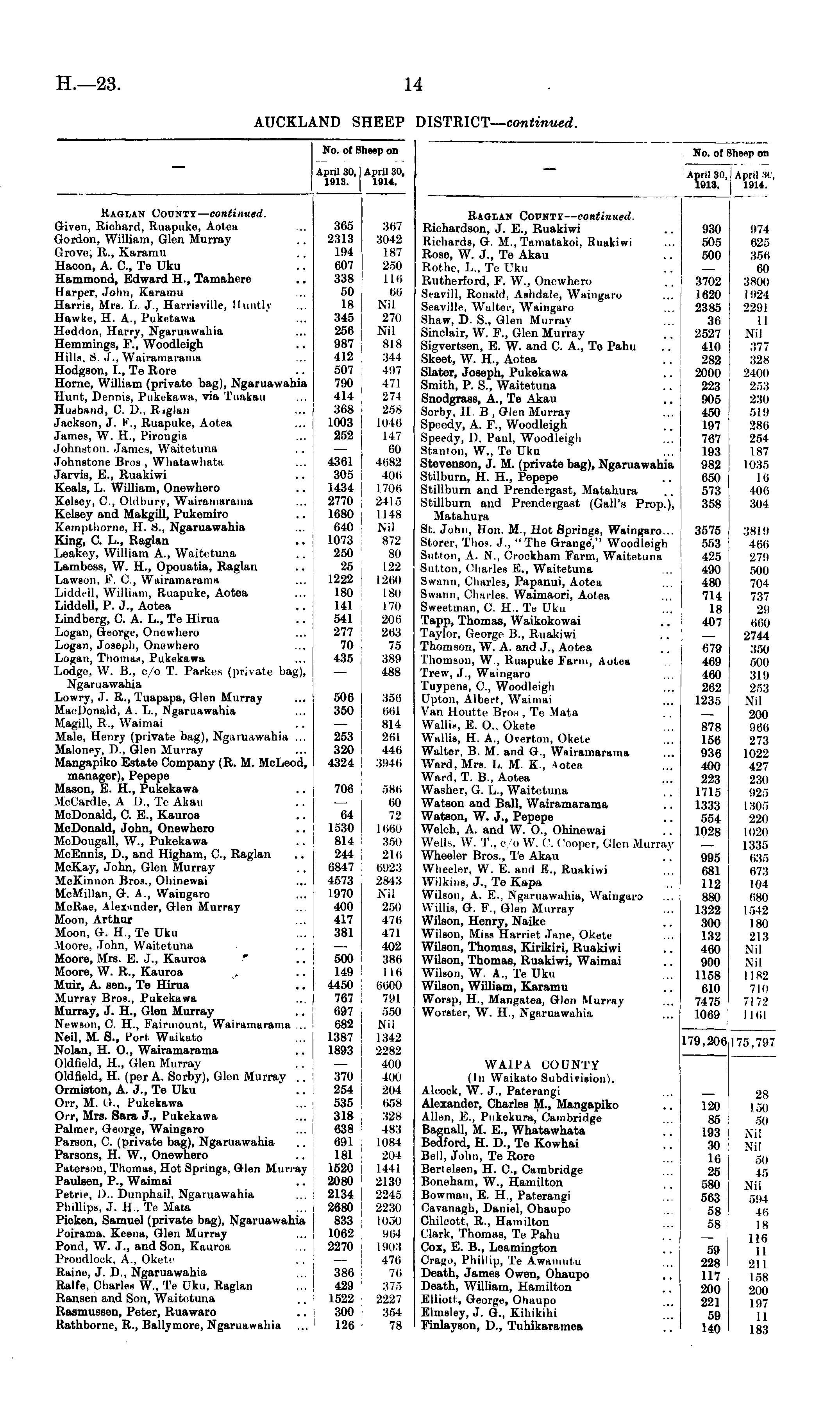 No. of Sheep on April 30, i April 30, 1913. 1914. Raglan County— continued. Given, Richard, Ruapuke, Aotea Gordon, William, Glen Murray Grove, R., Karamu Hacon, A. ft, Te Uku Hammond, Edward H., Tamahere Harper, John, Karamu Harris, Mrs. L. J., Harrisville, Huntly Hawke, H. A., Puketawa Heddon, Harry, Ngaruawahia Hemmings, F., Woodleigh Hills, 8. J., Wairamarama Hodgson, I., Te Rore Home, William (private bag), Ngaruawahia Hunt, Dennis, Pttkekawa, via Tuakau Husband, C. D., Riglan Jackson, J. K., Ruapuke, Aotea James, W. H., Pirongia Johnston. James, Waitetuna Johnstone Bros , Wbatawhala Jarvis, E., Ruakiwi Keals, L. William, Onewhero Kelsey, ft, Oldbury, Wairamarama Kelsey and Makgill, Pukemiro Kempthorne, II. 8., Ngaruawahia King, C. L,, Raglan Leakey, William A., Waitetuna Lambess, W. H., Opouatia, Raglan Lawaon, F. ft, Wairamarama Liddell, William, Ruapuke, Aotea Liddell, P. J., Aotea Lindberg, C. A. L., Te Hirua Logan, George, Onewhero Logan, Joseph, Onewhero Logan, Thomas, Fukekawa Lodge, W. B., c/o T. Parkes (private bag), Ngaruawahia Lowry, .1. R., Tuapapa, Glen Murray MacDonald, A. L., Ngaruawahia Magill, R., Waimai Male, Henry (private bag), Ngaruawahia ... Maloney, D., Glen Murray Mangapiko Estate Company (R. M. McLeod, manager), Pepepe Mason, E. H., Pttkekawa MoCardle, A I)., Te Akau McDonald, C. E., Kauroa McDonald, John, Onewhero McDougall, W., Pukekawa McEnnis, D., and Higham, ft, Raglan McKay, John, Glen Murray McKinnon Bros., Ohinewai McMillan, G. A., Waingaro McRae, Alexander, Glen Murray Moon, Arthur Moon, G. H, Te Uku Moore, John, Waitetuna Moore, Mrs. E. J., Kauroa Moore, W. R., Kauroa Muir, A. sen., Te Hirua Murray Bros., Pukekawa Murray, J. H., Glen Murray Newson, C. H., Fairinount, Wairamarama ... Neil, M. S., Port Waikato Nolan, H. 0., Wairamarama Oldfield, H., Glen Murray Oldfield, H. (per A. Sorby), Glen Murray .. Ormiston, A. J., Te Uku Orr, M. U., Pukekawa Orr, Mrs. Sara J., Pukekawa Palmer, George, Waingaro Parson, C. (private bag), Ngaruawahia Parsons, H. W., Onewhero Paterson, Thomas, Hot Springs, Glen Murray Paulsen, P., Waimai Petrie, 1)., Dunphail, Ngaruawahia Phillips, J. H.. Te Mata Picken, Samuel (private bag), Ngaruawahia Poirama. Keeua, Glen Murray Pond, W. J., and Son, Kauroa Proudlock, A„ Oketc Raine, J. D., Ngaruawahia Ralfe, Charles W., Te Uku, Raglan Hansen and Son, Waitetuna Rasmussen, Peter, Ruawaro Rathborne, R., Bally more, Ngaruawahia 365 2313 194 607 338 50 18 345 250 987 412 507 790 414 368 1003 252 4361 305 1434 2770 1680 040 1073 250 25 1222 180 141 541 277 70 435 500 350 253 320 4324 367 5042 187 250 116 00 Nil 270 Nil 818 544 197 471 274 258 1046 147 60 1082 400 1700 2415 1148 Nil 872 80 122 1260 iso 170 200 203 75 3S9 488 350 001 814 251 110 3940 706 5Si, 00 72 I 0011 350 210 0923 2843 Nil 250 470 471 402 380 lib 0000 791 55(1 Nil 1342 2282 400 400 204 058 328 483 1084 204 1441 2130 2245 2230 1050 904 1903 476 70 375 2227 354 78 64 1530 814 244 6847 4573 1970 400 417 381 500 149 4450 767 697 682 1387 1893 370 254 535 318 638 691 181 1520 2080 2134 2680 833 1062 2270 386 429 1522 300 126