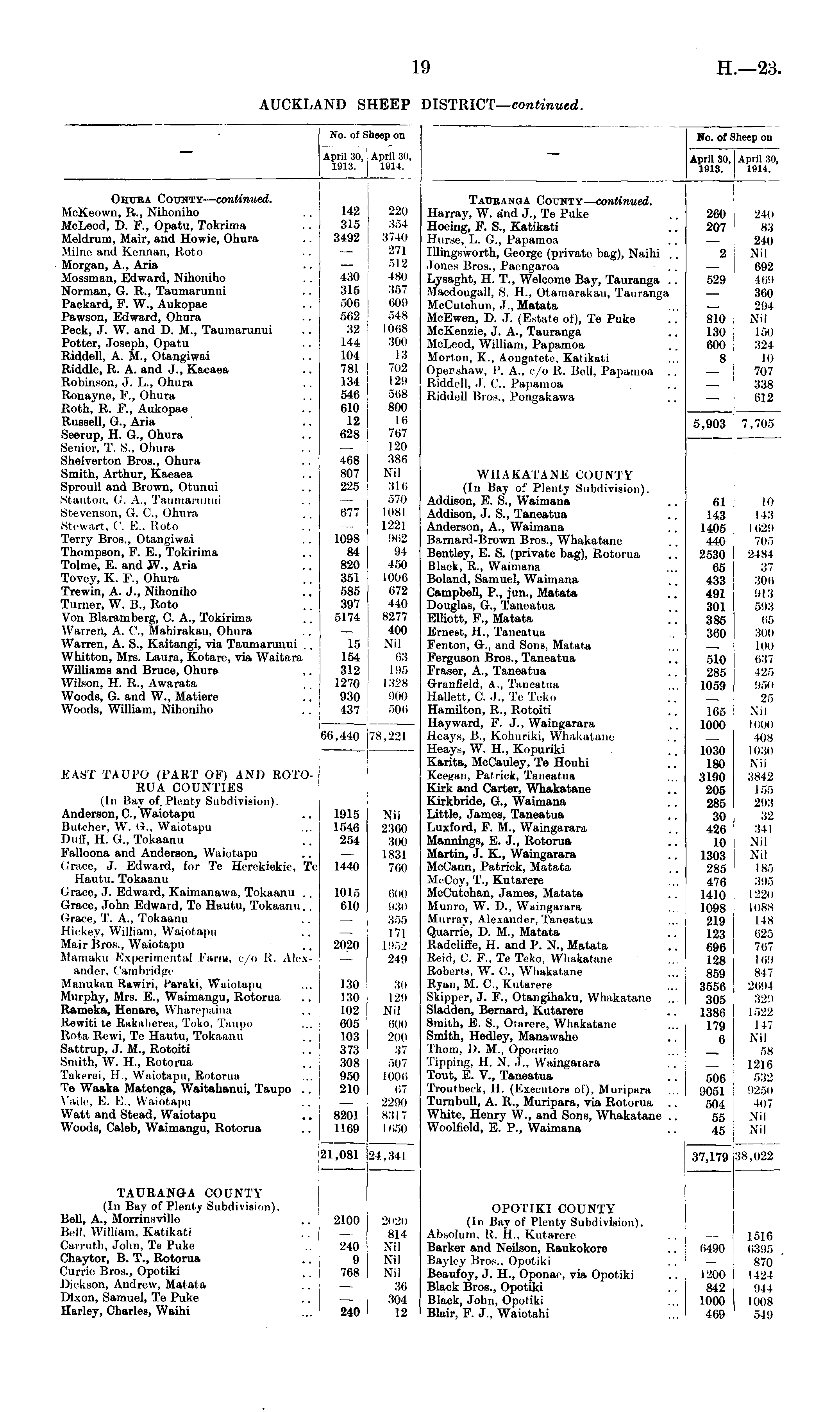 No. of Sheep on April 30, April 30, 1913. 1914. Ohura County— continued. McKeown, R., Nihoniho McLeod, D. F., Opatu, Tokrima Meldrum, Mair, and Howie, Ohura Milne and Keitnan, Koto Morgan, A.. Aria Mossman, Edward, Nihoniho Norman, G. R., Taumarunui Packard, F. W., Aukopae Pawson, Edward, Ohura Peck, J. W. and D. M., Taumarunui Potter, Joseph, Opatu Riddell, A. M., Otangiwai Riddle, R. A. and J., Kaeaea Robinson, J. L., Ohura Ronayne, 1<\, Ohura Roth, R. F., Aukopae Russell, G., Aria Seerup, H. G., Ohura Senior, T, 8., Ohura Shelverton Bros., Ohura Smith, Arthur, Kaeaea Sproull and Brown, Otuiuti Stanton. ( '.. A.. Taumarunui Stevenson, G. ft, Ohura Stewart, C. E., Roto Terry Bros., Otangiwai Thompson, F. E., Tokirima Tolme, E. and W., Aria Tovey, K. F., Ohura Trewin, A. J., Nihoniho Turner, W. B., Roto Von Blaramberg, C. A., Tokirima Warren, A. ft, Mahirakau, Ohura Warren, A. S., Kaitangi, via Taumarunui .. Whitton, Mrs. Laura, Kotarc, via Waitara Williams and Bruce, Ohura Wilson. H. R., Awarata Woods, G. and W., Matiere Woods, William, Nihoniho 142 315 3492 430 315 506 562 32 144 104 781 134 546 610 12 028 468 807 225 220 364 3740 271 512 480 557 009 648 loos 300 13 702 129 568 800 10 767 120 386 Nil 310 570 1081 1221 902 94 460 looo 072 III) 8277 400 Nil 03 195 I 328 900 500 077 1098 84 820 351 585 397 5174 15 154 312 1270 930 437 66,440 78,221 EAST TAUPO (PART OF) AND ROTORUA COUNTIES (In Bay of. Plenty Subdivision). Anderson, ft, Waiotapu Butcher, AV. G., Waiotapu Dull, H. G„ Tokaanu Falloona and Anderson, Waiotapu Grace, J. Edward, for Te Herckiekic. Te Hautu. Tokaanu Grace, J. Edward, Kaimanawa, Tokaanu .. Grace, John Edward, Te Hautu, Tokaanu.. Grace, T. A.. Tokaanu lliekey. William. Waiotapu Mair Bros., Waiotapu Maniaku Experimental Earn*, 0 0 R. Alexander. (lambridge Manukau Rawiri, Paraki, Waiotapu Murphy, Mrs. E., Waimangu, Rotorua Rameka, Henaro, Wharepaina .. I Rewiti te Rakaherea, Toko, Taupo ... | Rota Rewi, Te Hautu, Tokaanu .. | Sattrup, J. M., Rotoiti Smith, W. H., Rotorua Takerei, II., Waiotapu, Rotorua Te Waaka Matenga, Waitahanui, Taupo .. Vaile, E. E., Waiotapu Watt and Stead, Waiotapu Woods, Caleb, Waimangu, Rotorua 1915 1540 254 1440 1015 610 2020 Nil 2500 300 1831 700 000 930 355 171 I'.'52 249 130 130 102 005 103 373 308 950 210 30 129 Nil 000 20(1 37 507 1000 07 22! Ml 8317 I 0511 8201 1169 21,081 124.311 TAURANGA COUNTY (In Bay of Plenty Subdivision). Bell, A., Morrinsville Bell. William. Katikati Cat-ruth, John, Te Puke Chaytor, B. T., Rotorua Currie Bros., Opotiki Dickson, Andrew, Matata Dixon, Samuel, Te Puke Harley, Charles, Waihi 2100 240 9 768 2020 814 Nil Nil Nil 30 304 12 240