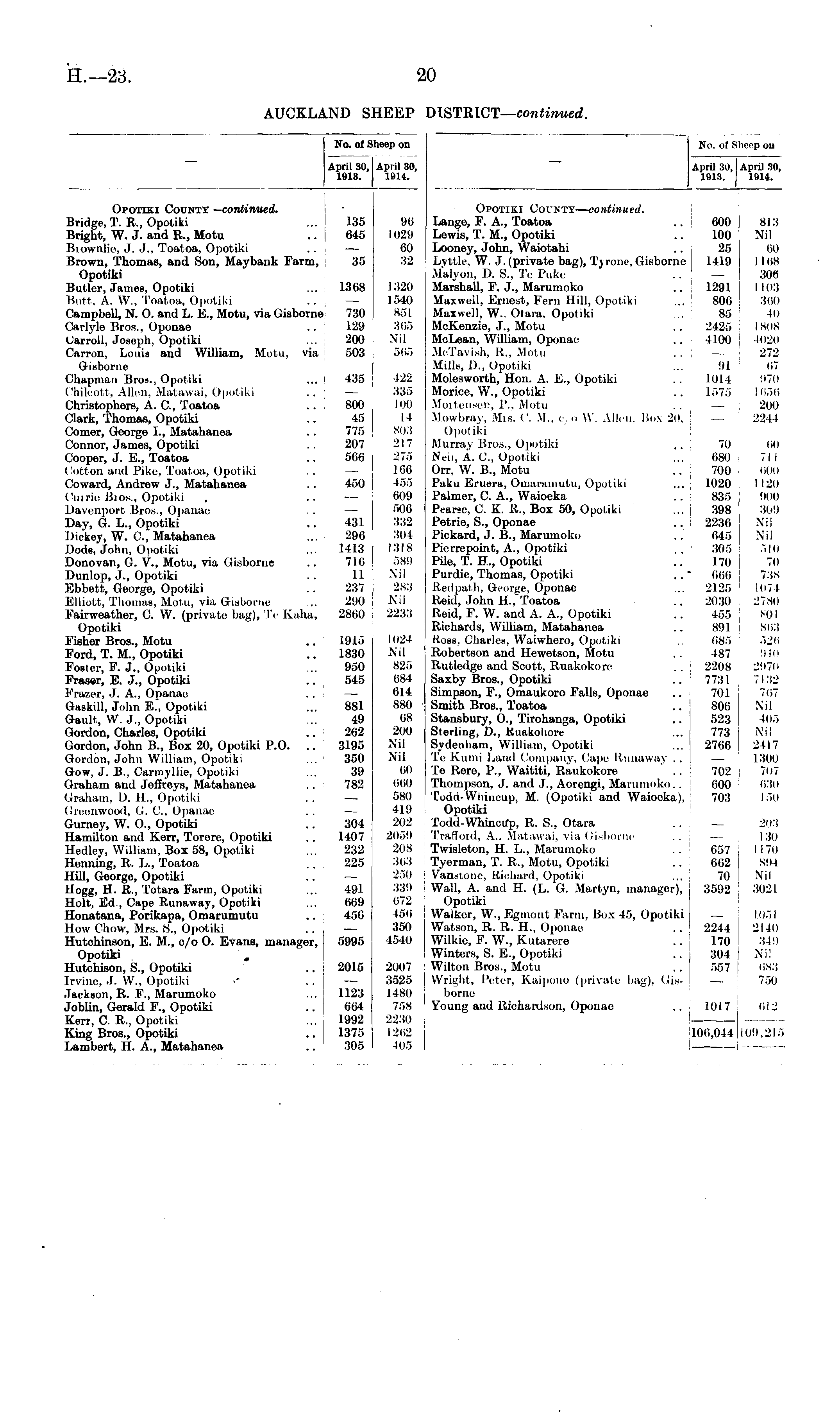 No. of Sheep on April 30, April 30, 1913. 1914. Opotiki County — continued. Bridge, T. R., Opotiki ... 135 Bright, W. J. and R., Motu .. 645 Biownlie, J. •!.. Toatoa, Opotiki . . — Brown, Thomas, and Son, Maybank Farm, 35 Opotiki Butler, James, Opotiki ... 1368 Butt. A. W.. Toatoa, Opotiki Campbell, N. 0. and L. E., Motu, via Gisborne 730 Carlyle Bros.. Oponae .. 129 Uarroll, Joseph, Opotiki ... 200 Carron, Louis and William, Motu, via 503 Gisborne Chapman Bros., Opotiki ... 435 Chilcott, Allen, Matawai, Opotiki .. — Christophers, A. ft, Toatoa .. 800 Clark, Thomas, Opotiki .. 45 Comer, George I., Matahanea .. 775 Connor, James, Opotiki .. 207 Cooper, J. E., Toatoa .. 500 Cotton ami Pike, Toatoa, Opotiki .. — Coward, Andrew J., Matahanea .. 450 ('ui fie l>io>., O|iot iki . .. — Davenport Bros., Opanae .. — Day, G. L., Opotiki .. 431 Dickey, W. ft, Matahanea ... 296 Dods, John, Opotiki ... 1413 Donovan, G. V., Motu, via Gisborne .. 7 Hi Dunlop, J., Opotiki .. 11 Ebbett, George, Opotiki .. 257 Elliott, Thomas, Motu, via Gisborne ... 290 Fan-weather, C. W. (private bag), Te Ivaha, 2860 Opotiki Fisher Bros., Motu .. 1915 Ford, T. M., Opotiki .. 1830 Foster, F. J., Opotiki ... 950 Fraser, E. J., Opotiki .. 515 Fra/.er, J. A.. (Ipanae .. — Gaskill, John E., Opotiki ... 881 Gault, W. J., Opotiki ... 49 Gordon, Charles, Opotiki .. 202 Gordon, John B., Box 20, Opotiki P.O. .. 3195 Gordon, John William, Opotiki ... 350 Gow, J. B, Carmyllie, Opotiki ... 39 Graham and Jeffreys, Matahanea .. 782 Graham, D. II.. Opotiki .. — Greenw I, G. ft, Opanae .. — Gurney, W. 0., Opotiki .. 304 Hamilton and Kerr, Torore, Opotiki .. 1407 Hcdlev, William, Box 58, Opotiki ... 232 Henning, R. L., Toatoa .. 225 Hill, George, Opotiki .. — Hogg, H. R., Totara Farm, Opotiki ... 491 Holt, Ed., Cape Runaway, Opotiki ... 669 Honatana, Porikapa, Omarumutu .. 166 How Chow, Mrs. S., Opotiki .. — Hutchinson, E. M., c/o 0. Evans, manager, 5995 Opotiki Hutchison, S., Opotiki .. 2015 Irvine. .1. W., Opotiki Jackson, R. F., Marumoki, ... 1123 Joblin, Gerald F, Opotiki .. 664 Kerr, C. R., Opotiki ... 1992 King Bros., Opotiki .. 1375 Lambert, H. A., Matahanea . . 305 90 1029 00 32 1520 1540 861 305 Nil 505 122 535 lull 14 217 275 100 455 009 506 552 304 1318 589 Nil 2S5 Nil 2255 11)24 Nil 825 (i.sl 01 1 SSI) OS 200 \ii (i() 000 580 419 2( )2 205!) 2( IS 503 250 55! I 072 150 350 15 III 2007 3525 I ISO 75S 2250 1202 105
