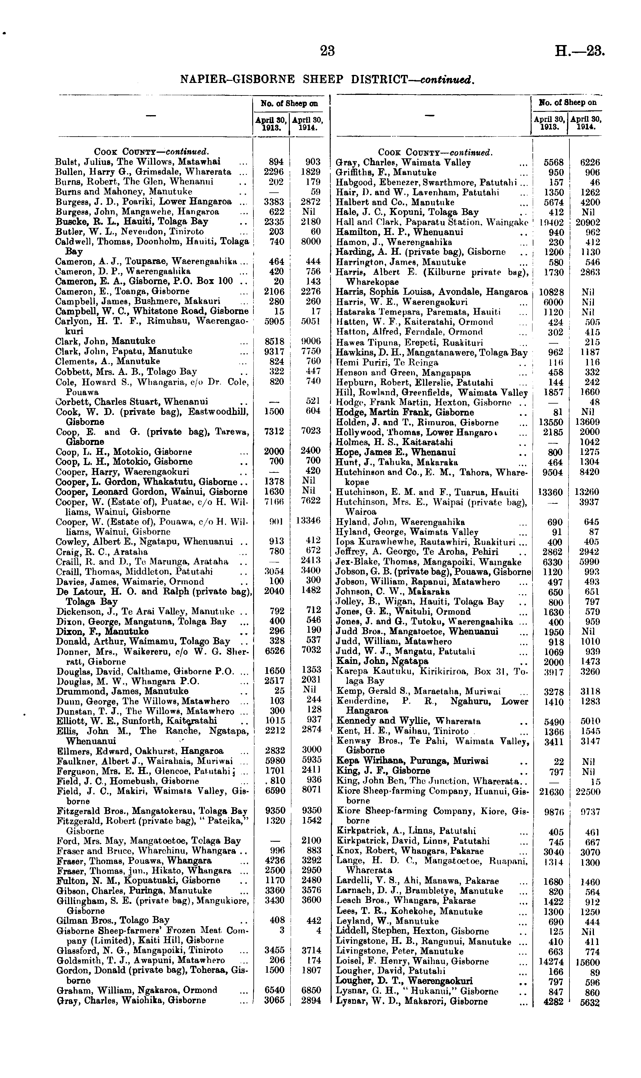 r u . teep on April 30, April 30, 1913. 1914. Cook County— continued. Gray, Charles, Waimata Valley ... J 5568 Griffiths, F., Manutuke ... 950 Habgood, Ebenezer.Swarthmore, Patutahi ... | 157 Hair, D. and W., Lavenham, Patutahi ... 1350 Halbert and Co., Manutuke ... 5674 Hale, J. ft, Kopuni, Tolaga Bay .. 412 Hall and Clark. Paparatu Station. Waingake 19402 Hamilton, H. P., Whenuanui .. 940 Hamon, J., Waerengaabika ... 230 Harding, A. H. (private bag), Gisborne .. 1200 Harrington, James, Manutuke ... 580 Harris, Albert E. (Kilburne private bag), i 1730 Wharekopae Harris, Sophia Louisa, Avondale, Hangaroa 10828 Harris, W. E., Waerengaokuri ... 6000 Hataraka Temepara, Paremata, Hauiti ... 1120 flatten, W. F, Kaiteratahi, Ormond ... 424 Hatton, Alfred, Ferndale, Ormond ... 302 Hawea Tipuna, Erepcti, Ruakituri ... — Hawkins, D. H., Mangatanawere, Tolaga Bay 902 Hemi Puriri, Te Reinga .. j 116 Hen8on and Green, Manga papa ... 458 Hepburn, Robert, Ellerslie, Patutahi ... 144 Hill, Rowland, Greenfields, Waimata Valley 1857 Hodge, Prank Martin, Helton, Gisborne — Hodge, Martin Frank, Gisborne .. 81 Holden, J. and T., Rimuroa, Gisborne ... 13550 Hollywood, Thomas, Lower Hangaroi ... 2185 Holmes, H. S., Kaitaratahi .. — Hope, James E., Whenanui .. 800 Hunt, J., Tahtika, Makaraka ... 464 Hutchinson and Co., V.. M., Tahora, Wltare- 9504 kopae Hutchinson, E. M. and F., Tuarua, Hauiti 13360 Hutchinson, Mrs. E., Waipai (private bag), — Wairoa Hyland, John, Waerengaabika ... 690 Hyland, George, Waimata Valley ... 91 Iopa Kurawbewhe, Rautawhiri, Ruakituri ... 400 Jeffrey, A. Georgo, Te Aroha, Pehiri .. 2862 Jex-Blake, Thomas, Mangapoiki, Waingake 6330 Jobson, G. B. (private bag), Pouawa, Gisborne 1120 Jobson, William, Rapanui, Matawhero ... 497 Johnson, C. \V., Makaraka ... 650 Jolley, B., Wigan, Hauiti, Tolaga Bay .. 800 Jones, G. E., Waituhi, Ormond ... 1030 Jones, J. and G., Tutoku, Waerengaabika ... 400 Judd Bros., Mangatoetoe, Whenuanui ... I 1950 Judd, William, Matawhero ... j 918 Judd, W. J., Mangatu, Patutahi ... 1069 Kain, John, Ngatapa .. 2000 Karepa Kautuku. Kirikiriroa, Box 31, To- 5917 laga Bay Kemp, Gerald S., Maraetaha, Muriwai ... 3278 Kenderdine, P. R., Ngahuru, Lower 1410 Hangaroa Kennedy and Wyllie, Wharerata .. 5490 Kent, H. E., Waihau, Tiniroto ... 1366 Kenway Bros., Te Pahi, Waimata Valley, 3411 Gisborne Kepa Wirihana, Purunga, Muriwai .. 22 King, J. F., Gisborne .. 797 King. John Ben. The Junction, Wharerata.. Kiore Sheep-farming Company, Huanui, Gis- 21630 borne Kiore Sheep-farming Company, Kiore, Gis- 9870 borne Kirkpatrick, A., Linns, Patutahi ... 405 Kirkpatrick, David, Linns, Patutahi ... 745 Knox, Robert, Whangara, Pakarae ... 3040 Lange, H. D. ft, Mangatoetoe, Ruapani, 1314 Wharerata Lardelli, V. S., Ahi, Manawa, Pakarae ... 1680 Larnach, D. J., Bratnbletye, Manutuke ... 820 Leach Bros., Whangara, Pakarae ... 1422 Lees, T. R„ Kohekohe, Manutuke ... 1300 Leyland, W., Manutuke ... 690 Liddell, Stephen, Hexton, Gisborne .. 125 Livingstone, H. B., Rangunui, Manutuke ... 410 Livingstone, Peter, Manutuke 663 Loisel, F. Henry, Waihau, Gisborne ... 14274 Lougher, David, Patutahi ... 166 Lougher, D. T., Waerengaokuri .. 797 Lysnar, G. H., " Hukantti," Gisborne .. 847 Lysnar, W. D., Makarori, Gisborne ... 4282 0226 906 40 1262 4200 Nil 20902 962 412 1130 540 2863 Nil Nil Nil 505 415 215 1187 III, 332 242 1660 48 Nil 13609 2000 1042 1275 1304 8420 13200 3937 045 87 405 2942 5990 993 493 651 797 579 959 Nil 1010 939 1473 3200 51 IS 1283 5010 1545 5147 Nil Nil 16 22500 9737 401 007 3070 1300 1400 564 912 1250 444 Nil 411 774 15000 89 590 860 5632