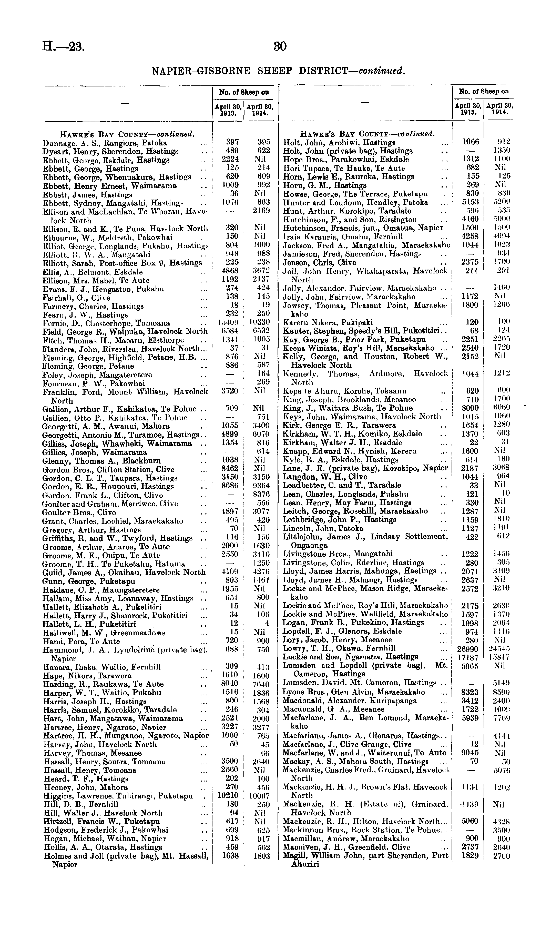 No. of Sheep on April 30, April 30, 1913. 1914. Hawke's Bay County— continued. Holt, John, Arohiwi, Hastings Holt, John (private bag), Hastings Hope Bros., Parakowhai, Eskdale Hori Tupaea, Te Hauke, Te Aute Horn, Lewis E., Raureka, Hastings Horu, G. M., Hastings Uowse, George, The Terrace, Puketapu Hunter and Loudoun, Hendley, Patoka Hunt, Arthur. Korokipo, Taradalo Hutchinson, F., and Son, Rissington Hutchinson, Francis, jun., Omatua, Napier Iraia Karauria, Omahu, F'ernliill Jackson, FVed A., Mangatahia, Maraekakaho Jamioson, Fred, Sherenden. Hastings Jensen, Chris, Clive Joll, John Henry, Whahaparata, Havelock North Jolly, Alexander. Fairview, Maraekakaho .. Jolly, John, Fairview, Varaekakaho Jowsey, Thomas, Pleasant Point, Maraekakaho Ivai-etu Nikera, Pakipaki Kauter, Stephen, Speedy's Hill, Puketitiri.. Kay, George B., Prior Park, Puketapu Keepa Winiata, Roy's Hill, Maraekakaho ... Kelly, George, and Houston, Robert W., Havelock North Kennedy, Thomas. Ardmore. Havelook North Kepa te Ahum, Korohe, Tokaanu Ixiiii.', Joseph. Brooklands, Meoancc King, J., Waitara Bush, Te Pohue Keys, John, Waimarama, Havelock North Kirk, George E. R., Tarawera Kirkham, W. T. H., Komiko, Eskdale Kirkham, Walter J. 11., Eskdale Knapp, Edward N., Hynish, Kereru Kyle. It. A., Flskdale, Hastings Lane, J. E. (private bag), Korokipo, Napier Langdon, W. H., Clive Leadbetter, C. and T., Taradale Lean, Charles, Longlands, Pukahu Lean, Henry, May Farm, Hastings Leitch, George, Rosehill, Maraekakaho Lethbridge, John P., Hastings Lincoln, John, Patoka Littlejohn, James J., Lindsay Settlement, Ongaonga Livingstone Bros., Mangatabi Livingstone, Colin, Ederline, Hastings Lloyd, James Harris, Mahunga, Hastings .. Lloyd, James H., Mahangi, Hastings Lockie and McPhee, Mason Ridge, Maraekakaho Lockie and McPhee, Roy's Hill, Maraekakaho Lockie and McPhee, Wellfield, Maraekakaho Logan, Frank B., Pukekino, Hastings Lopdell, F. J., Glenora, Eskdale Lory, Jacob, Henry, Meeanee Lowry, T. H., Okawa, Fernhill Luckie and Son, Ngamatia, Hastings Lumsden and Lopdell (private bag), Mt. Cameron, Hastings Lumsden, David, Mt. Cameron, Hastings .. Lyons Bros., Glen Alvin, Maraekakaho Macdonald, Alexander, Kuripapanga Macdonald, G A., Meeanee Macfarlane, J. A., Ben Lomond, Maraekakaho Macfarlano, James A.. Olenaros, Hastings.. Macfarlane, J., Clive Grange, Clive Macfarlane, W. and J., Waiterunui, Te Aute Mackay, A. S., Mahora South, Hastings Mackenzie, Charles Fred.. Gruinard, Havelock North Mackenzie, II. II. 5.. Brown's Flat. Havelock North Mackenzie. R. H. (Estate of), Gruinard. Havelock North Mackenzie, R. H., Hilton, Havelock North... Mackintion Bros., Hock Station, To Politic. . Macmillan, Andrew, Maraekakaho Maoniven, J. H., Greenfield, Clive Magill, William John, part Sherenden, Port Ahuriri 1066 1312 682 155 269 830 5153 590 4100 1500 4258 1044 2375 211 1172 1800 120 08 2251 2540 2152 1044 020 710 8000 1015 1654 1370 22 1600 014 2187 1044 33 121 53(1 1287 1159 1127 422 912 1350 11(10 Nil 125 Nil 839 5200 535 5000 1500 1094 1025 934 1700 291 1400 Nil 1200 inn 124 2205 I 720 Nil 1212 000 1700 0000 1000 1280 603 31 Nil ISO 3008 904 Nil 10 Nil Nil 1810 1191 612 1222 280 2071 2637 2572 1456 505 5109 Nil 3210 2175 1597 1998 974 280 26990 17187 5905 2030 1370 2064 i no Nil 24545 15817 Nil 8323 3412 1722 5939 5149 8500 21in ion:: 770!) 12 9045 70 4144 Nil Nil 50 5070 I 134 1202 1439 Nil 5060 900 2737 1829 4328 350(1 900 2040 27(0