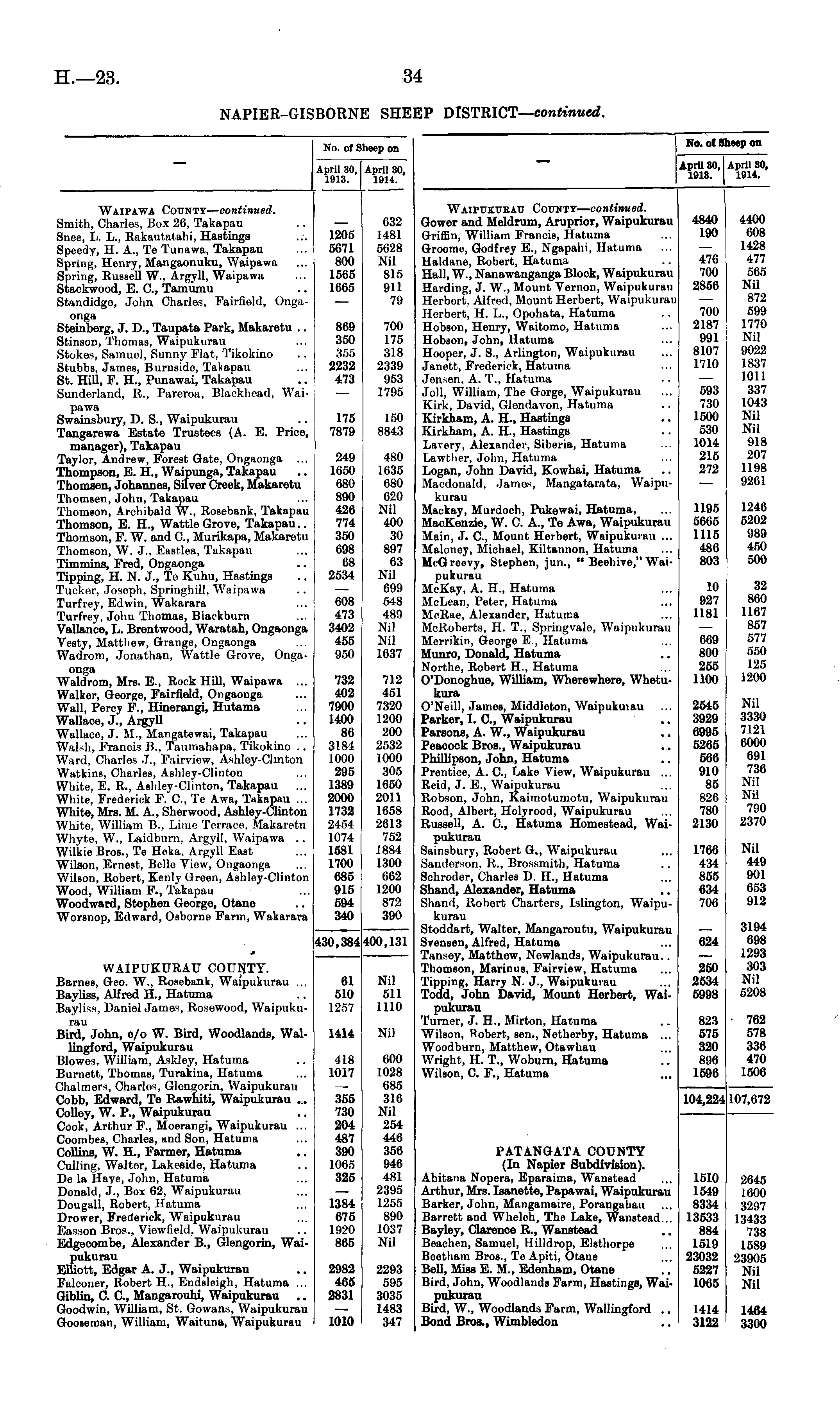 No. of Sheep on April 30, April 30, 1913. 1914. Waipukubau County— continued. Gower and Meldrum, Aruprior, Waipukurau Griffin, William Francis, Hatuma Groome, Godfrey E., Ngapabi, Hatuma Haldane, Robert, Hatuma Hall, W., Nanawanganga Block, Waipukurau Harding, J. W., Mount Vernon, Waipukurau Herbort, Alfred, Mount Herbert, Waipukurau Herbert, H. L., Opohata, Hatuma Hobson, Henry, Waitomo, Hatuma Hobson, John, Hatuma Hooper, J. S., Arlington, Waipukurau Janett, Frederick, Hatuma Jensen. A. T., Hatuma Joll, William, The Gorge, Waipukurau Kirk, David, Glendavon, Hatuma Kirkham, A. H., Hastings Kirkham, A. H., Hastings Lavery, Alexander, Siberia, Hatuma Lawtber, John, Hatuma Logan, John David, Kowhai, Hatuma Macdonald, James, Mangatarata, Waipukurau Mackay, Murdoch, Pukewai, Hatuma, MacKenzie, W. C. A., Te Awa, Waipukurau Main, J. C., Mount Herbert, Waipukurau ... Maloney, Michael, Kiltannon, Hatuma McGreevy, Stephen, jun., " Beehive," Waipukurau McKay, A. H., Hatuma McLean, Peter, Hatuma McRae, Alexander, Hatuma McRoberts, H. T., Springvale, Waipukurau Merrikin, George E., Hatuma Munro, Donald, Hatuma Northe, Robert H., Hatuma O'Donoghue, William, Wherewhere, Whetukura O'Neill, James, Middleton, Waipukuiau Parker, I. C, Waipukurau Parsons, A. W., Waipukurau Peacock Bros., Waipukurau Phillipson, John, Hatuma Prentice, A. C., Lake View, Waipukurau ... Reid, J. E., Waipukurau Robson, John, Kaimotumotu, Waipukurau Rood, Albert, Holyrood, Waipukurau Russell, A. ft, Hatuma Homestead, Waipukurau Sainsbury, Robert G., Waipukurau Sanderson, R., Brossmith, Hatuma Schroder, Charles D. H., Hatuma Shand, Alexander, Hatuma Shand, Robert Charters, Islington, Waipukurau Stoddart, Walter, Mangaroutu, Waipukurau Svensen, Alfred, Hatuma Tansey, Matthew, Newlands, Waipukurau.. Thomson, Marinus, Fairview, Hatuma Tipping, Harry N. J., Waipukurau Todd, John David, Mount Herbert, Waipukurau Turner, J. H., Mirton, Hatuma Wilson, Robert, sen., Netherby, Hatuma ... Woodburn, Matthew, Otawhau Wright, H. T., Woburn, Hatuma Wilson, C. F., Hatuma 4840 190 476 700 2856 700 2187 991 8107 1710 593 730 1500 530 1014 215 272 1195 5665 1115 486 803 10 927 1181 669 800 255 1100 4400 608 1428 477 565 Nil 872 599 1770 Nil 9022 1837 1011 337 1043 Nil Nil 918 207 1198 9261 1246 5202 989 450 500 32 860 1107 857 577 550 125 1200 2545 3929 6995 5265 566 910 85 826 780 2130 Nil 3330 7121 6000 691 736 Nil Nil 790 2370 1766 434 855 634 706 Nil 449 901 053 912 624 250 2534 5998 3194 698 1293 303 Nil 5208 823 675 320 896 1596 762 578 336 470 1506 104,224 107,672 PATANGATA COUNTY (In Napier Subdivision). Ahitana Nopera, Eparaima, Wanstead Arthur, Mrs. Isanette, Papawai, Waipukurau Barker, John, Mangamaire, Porangahau Barrett and Whelch, The Lake, Wanstead... Bayley, Clarence R., Wanstead Beachen, Samuel, Hilldrop, Elsthorpe Beethain Bros., Te Apiti, Otane Bell, Miss E. M., Edenham, Otane Bird, John, Woodlands Farm, Hastings, Waipukurau Bird, W., Woodlands Farm, Wallingford .. Bond Bros., Wimbledon 1510 1549 8334 13533 884 1519 23032 5227 1065 2645 1600 3297 13433 738 1589 23905 Nil Nil 1414 3122 1464 3300
