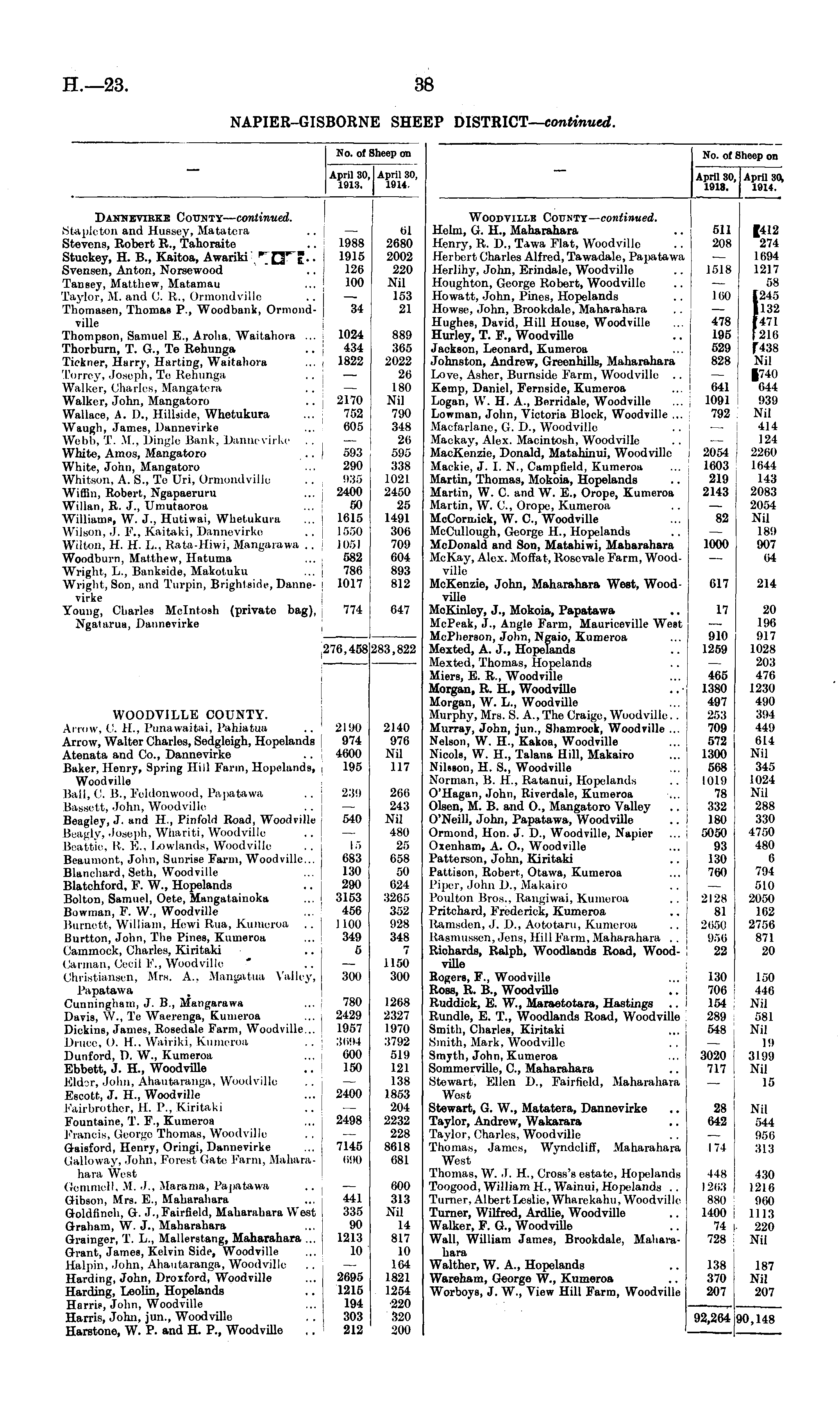 No. of Sheep on April 30, 1913. April 30, 1914. Dannevirke County— continued. Stapleton and Hussey, Matatera Stevens, Robert R., Tahoraitc Stuckey, H. B., Kaitoa, Awariki □""J.. Svensen, Anton, Norsewood Tansey, Matthew, Matamau Taylor, M. and C. R., Ormondville Thomasen, Thomas P., Woodbank, Ormondville Thompson, Samuel E., Aroha, Waitahora ... Thorburn, T. G., Te Rehunga Tickner, Harry, Harting, Waitahora Torrey, Joseph, Te Rehunga Walker, Charles, Mangaleia Walker, John, Mangatoro Wallace, A. D., Hillside, Whetukura Waugh, James, Dannevirke Webb, T. M.. Dingle Bank, Dannevirke . . White, Amos, Mangatoro White, John, Mangatoro Wliilson, A. S., Te Uri. Ormondville Wiffin, Robert, Ngapaeruru Willan, R. J., Umutaoroa Williams, W. J., Hutiwai, Whetukura Wilson, .1. V., Kaitaki, Dannevirke Wilton, H. H. L., Rata-Hiwi, Mangarawa .. Woodburn, Matthew, Hatuma Wright, L., Bankside, Makotuku Wright, Son, and Turpin, Brightsidc, Dannevirke Young, Charles Mcintosh (private bag), Ngatarua, Dannevirke 1988 1915 126 100 34 1024 434 1822 2170 752 005 593 290 936 2400 50 1615 1550 1061 582 780 1017 01 2680 2002 220 Nil 153 21 889 365 2022 20 180 Nil 790 348 20 595 338 1021 2450 25 1491 300 709 004 893 812 774 647 276,4581 1283,822 WOODVILLE COUNTY. Arrow, C. H., Punawaitai, Pahiatua Arrow, Walter Charles, Sedgleigh, Hopelands Atenata and Co., Dannevirke Baker, Henry, Spring Hill Farm, Hopelands, Woodville Ball, ft B., F'eldonwood, Papatawa Bassett, John, Woodville Beagley, J. and H., Pinfold Road, Woodville Beagly, Joseph, Whariti, Woodville Beattie, II. E., Lowlands, Woodville Beaumont, John, Sunrise Farm, Woodville... Blanchard, Seth, Woodville Blatchford, F. W., Hopelands Bolton, Samuel, Oete, Mangatainoka Bowman, F. W., Woodville Burnett, William, Hewi Rita. Kumeroa Burtton, John, The Pines, Kumeroa Cammock, Charles, Kiritaki ('at-man. (leoil F., Woodville Christiansen, Mrs. A., Mangatua Valley, Papatawa Cunningham, J. B., Mangarawa Davis, W., Te Waerenga, Kumeroa Dickins, James, Rosedale Farm, Woodville... Diiiee. (). II.. Wairiki, Kumeroa Dun ford, D. W., Kumeroa Ebbett, J. H., Woodvffle Elder, John, Ahautaranga, Woodville Escott, J. H., Woodville Fail-brother. II. P.. Kiritaki Fountaine, T. F., Kumeroa Francis, George Thomas, Woodville Gaisford, Henry, Oringi, Dannevirke Galloway, John, Forest (late Farm, Mahaiahara West Gemmell, M. •'.. Marama, Papatawa Gibson, Mrs. E., Maharahara Goldfinch, G. J., Fairfield, Maharahara West Graham, W. J., Maharahara Grainger, T. L., Mallerstang, Maharahara ... Grant, James, Kelvin Side, Woodville Halpin, John, Ahautaranga, Woodville Harding, John, Droxford, Woodville Harding, Leolin, Hopelands Harris, John, Woodville Harris, John, jun., Woodville Harstone, W. P. and H. P., Woodville 2190 974 4600 195 25!) 540 15 083 130 290 3153 456 I 100 349 5 500 780 2429 1957 3694 000 150 2140 976 Nil 117 266 243 Nil 480 25 058 50 024 3265 352 928 348 1150 300 1268 2327 1970 3792 519 121 138 1853 204 2232 228 8618 681 2400 2498 7145 690 441 335 90 1213 10 000 313 Nil 14 817 10 104 1821 1254 220 320 200 2695 1215 194 303 212