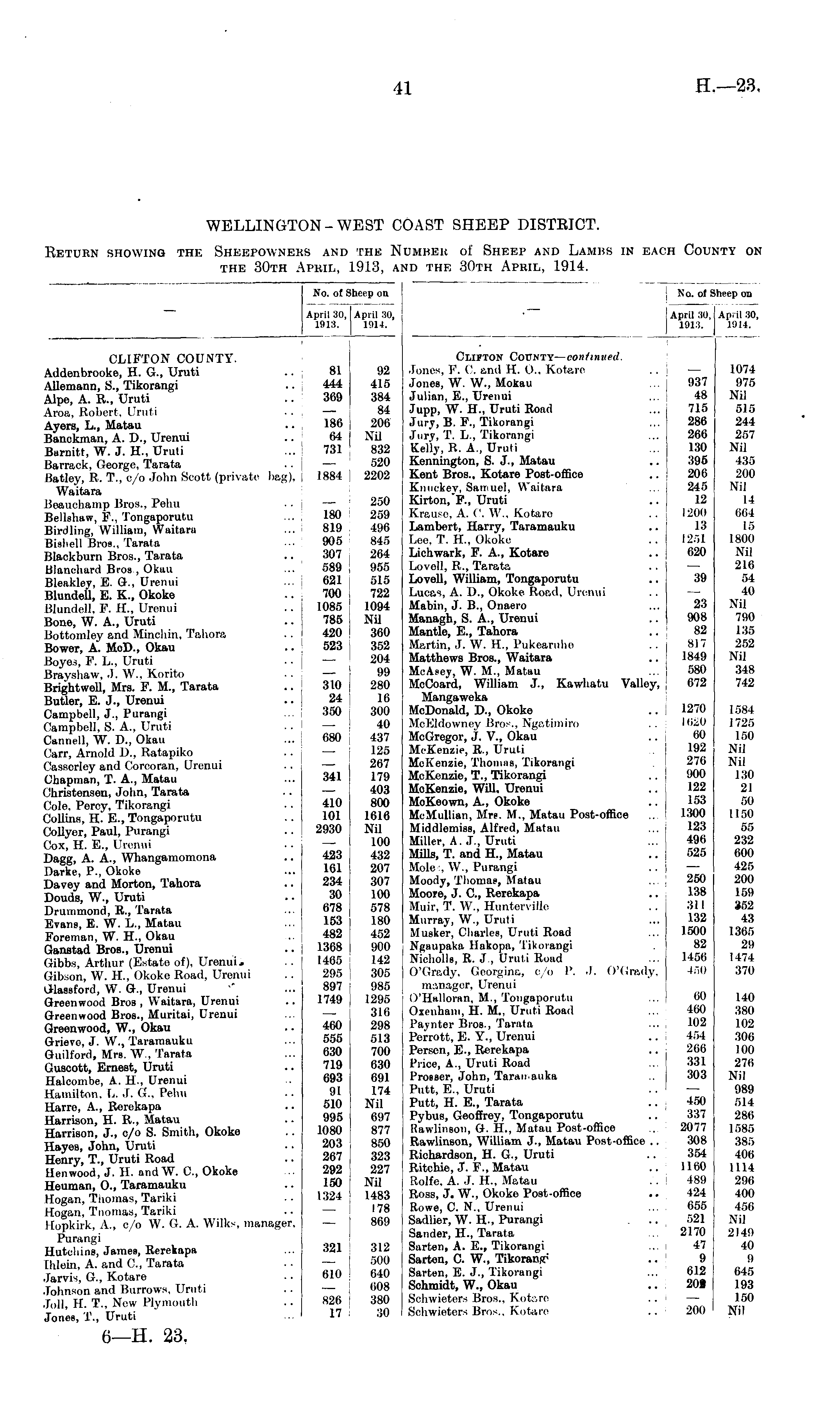 WELLINGTON - WEST COAST SHEEP DISTRICT. Return showing the Sheepowners and the Number of Sheep and Lambs in each County on the 30th April, 1913, and the 30th April, 1914.
