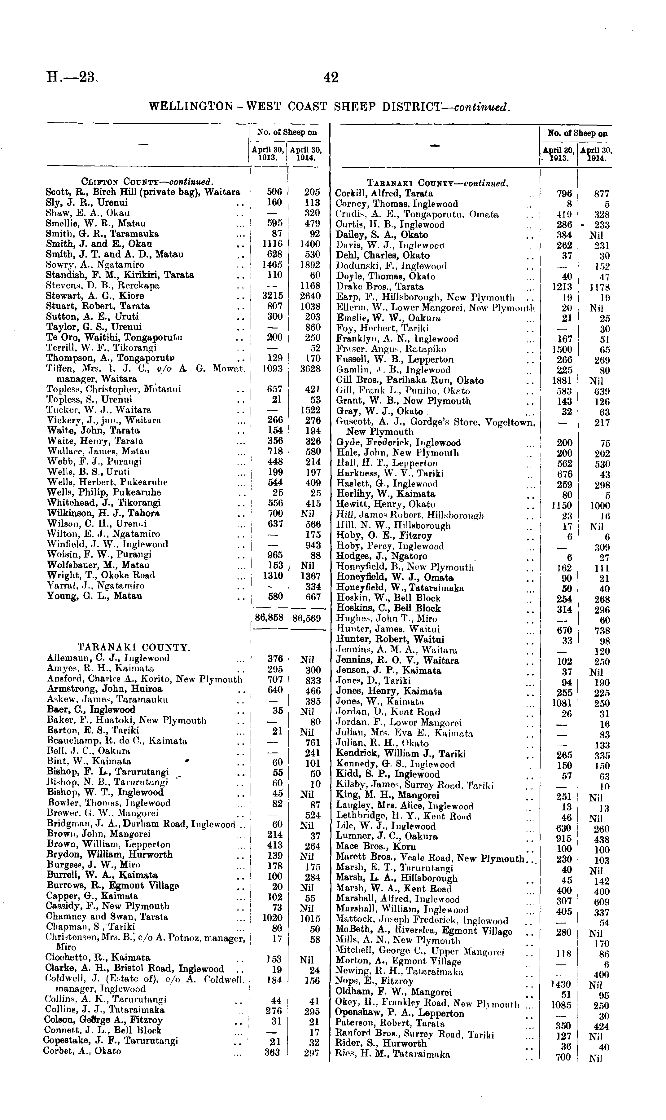 No. of Sheep on April 30,1 April 3C 1913. I 1914. April 30, 1914. Clifton County— continued. Scott, R., Birch Hill (private bag), Waitara Sly, J. R., Urenui Shaw, E. A., Okau Smellie, W. R., Matau Smith, G. R., Taramauka Smith, J. and E., Okau Smith, J. T. and A. D., Matau .. j Sowry, A., Ngatamiro Standish, F. M., Kirikiri, Tarata Stevens, l>. B., Rerekapa Stewart, A. G., Kiore Stuart, Robert, Tarata Sutton, A. E., Uruti Taylor, G. S., Urenui Te Oro, Waitihi, Tongaporutu Teirill, W. F., Tikorangi Thompson, A., Tongaporutu .. j Tiffen, Mrs. I. J. ft, c/o A G. Mowat. manager, Waitara Topless. Christopher, Motanui Topless, S., Urenui Tucker, W. .1.. Waitara Viekery, J., jun., Waitara Waite, John, Tarata Waite, Henry, Tarata Wallace, James, Matau Webb, F. J., Purangi Wells, B. S., Uruti Wells, Herbert, Pukearuhc Wells, Philip, Pukearuhe Whitehead, J., Tikorangi Wilkinson, H. J., Tahora Wilson, C. H., Urenui Wilton. K. J., Ngatamiro Winfield, J. W.. inglewood Woisin, F. W., Purangi Wolfsbauer, M., Matau Wright, T., Okoke Road Yarral, J., Ngatamiro Young, G. L., Matau 506 160 595 87 1116 628 1465 110 3215 807 300 200 129 1093 657 21 266 154 356 718 448 199 544 25 556 700 637 965 153 1310 580 205 113 320 479 92 1400 530 1892 60 1168 2640 1038 203 860 250 52 170 3028 421 53 1522 276 194 326 580 214 197 409 25 415 Nil 566 175 943 88 Nil 1367 334 667 86,858 86,569 TARANAKI COUNTY. Allemaun, C. J., Inglewood Amyes, R. H., Kaimata Ansford, Charles A., Korito, New Plymouth Armstrong, John, Huiroa Askew, James, Taramauku Baer, ft, Inglewood Baker, I-'.. Huatoki, Now Plymouth Barton, E. S., Tariki Beauohamp, R. de ft, Kaimata Bell, J. ('., Oakura Bint, W., Kaimata * Bishop, F. L., Tarurutangi Bishop, N. B.. Tarurutangi Bishop, W. T., Inglewood Bowler, Thonitis, Inglewood Brewer, G. W.. Mangorei Bridgman, J. A., Durham Road, Inglewood .. Brown, John, Mangorei Brown, William, Lepperton Brydon, William, Hurworth Burgess, J. W., Miro Burrell, W. A., Kaimata Burrows, R., Egmont Village Capper, G., Kaimata Cassidy, F., New Plymouth Chamney and Swan, Tarata Chapman, S,'Tariki Christensen, Mrs. B.) c/o A. Potnoz, manager, Miro Ciochetto, R., Kaimata Clarke, A. H., Bristol Road, Inglewood .. Coldwell, J. (Estate of), c/o A. Caldwell, manager, Inglewood Collins. A. K., Tarurutangi Collins, J. J., Tataraimaka Colson, George A., Fitzroy Oomiett, J. L., Bell Block Copestako, J. F., Tarurutangi Corbet, A., Okato 376 295 707 640 35 21 00 55 60 45 82 60 214 413 139 178 100 20 102 73 1020 80 17 153 19 184 44 276 31 21 363 Nil 300 833 466 385 Nil 80 Nil 761 241 101 50 10 Nil 87 524 Nil 37 264 Nil 175 284 Nil 55 Nil 1015 50 58 Nil 24 156 41 295 21 17 32 297