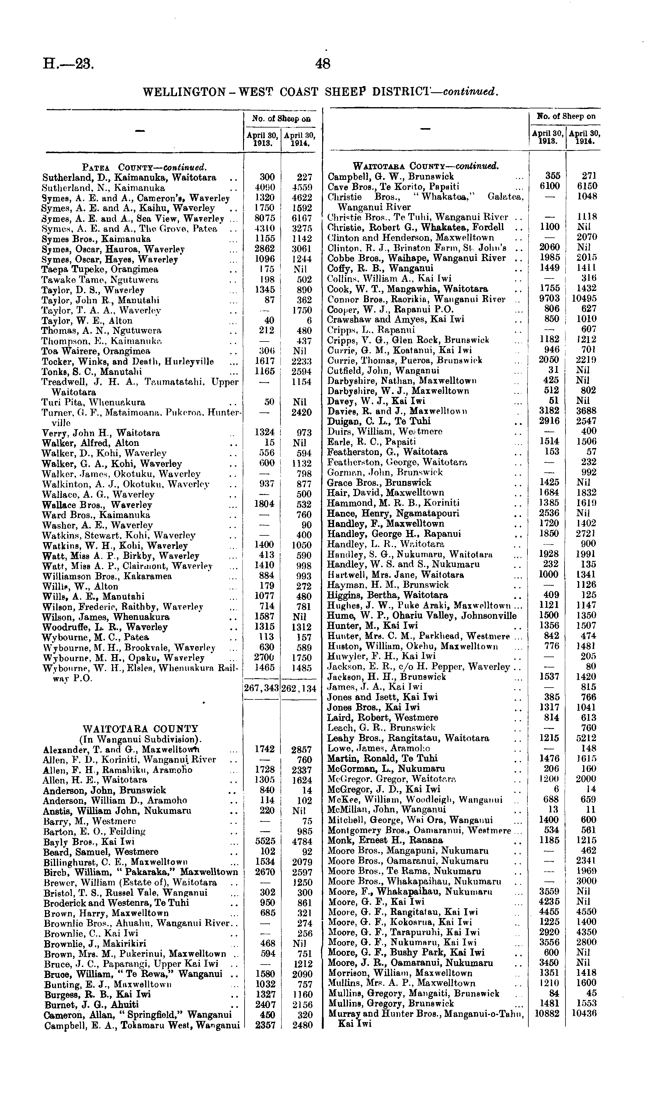 No. of Sheep on April 30, April 30, 1913. 1914. Patea Coitnty— continued. Sutherland, D., Kaimanuka, Waitotara Sutherland, X.. Kaimanuka Symes, A. E. and A., Cameron's, Waverley Symes, A. E. and A., Kaihu, Waverley Symes, A. E. and A., Sea View, Waverley ... Symes, A. E. and A., The Grove, Patea Symes Bros., Kaimanuka Symes, Oscar, Hauroa, Waverley Symes, Oscar, Hayes, Waverley Taepa Tupeke, Orangimea TawakeTame, Ngutuwera Taylor, D. S., Waverley Taylor, John R, Manutahi Taylor, T. A. A„ Waverlcv Taylor, W. E., Alton Thomas, A. N., Ngutuwera Thompson, E., Kaimanuka Toa Wairere, Orangimea Tocker, Winks, and Death, Hurleyville Tonka, S. ft, Manutahi Treadwell, J. If. A.. Taumatatahi, Upper Waitotara Turi Pita. Whenuakura Turner. G. F., Mataimoana, Pukeroa, villi300 H)!:(l 1320 I 750 8075 1310 1155 2862 1096 175 198 1345 87 227 4559 4022 1592 0107 5275 1142 5001 1244 Nil 502 890 362 1750 (i 480 437 Nil 2233 2594 I 154 40 212 500 1017 1165 50 Nil 2420 Verry, John H., Waitotara Walker, Alfred, Alton Walker, D., Kohi, Waverley Walker, G. A., Kohi, Waverley Walker. James, Okotuku, Waverley Walkinton, A. J., okotuku. Waverley Wallace, A. G., Waverley Wallace Bros., Waverley Ward Bros., Kaimanuka Washer, A. E., Waverley Wat kins, Stewart. Kohi, Waverley Watkina, W. H., Kohi, Waverley Watt, Miss A. P., Birkby, Waverley Watl, Miss A. P., Clairmont, Waverley Williamson Bros., Kakaramea Willis, W., Alton Wills, A. E., Manutahi Wilson, Frederic, Raitbby, Waverley Wilson, James, Whenuakura Woodruffe, L. R., Waverley Wybourne, M. ft, Patea Wyboume, M. H., Brookvale, Waverley Wybourne, M. H., Opaku, Waverley Wybourne, W. H.,Elslen, Whenuakura Railway P.O. 1324 15 556 000 973 Nil 594 1132 798 877 500 532 760 90 400 1050 590 998 993 272 480 781 Nil 1312 157 589 I 750 1485 937 1804 1400 413 1410 884 179 1077 714 1587 1315 113 630 2700 1465 267,343j 262,134 WAITOTARA COUNTY (In Wanganui Subdivision). Alexander, T. and G., Maxwelltowli Allen, F. D., Koriniti, Wanganui, River Allen, F. H, Ramahiku, Aramoho Allen, H. E., Waitotara Anderson, John, Brunswick Anderson, William D., Aramoho Anstis, William John, Nukumaru Barry, M., West mere Barton, E. O., Feilding Bayly Bros., Kai Iwi Beard, Samuel, Westmere Billinghurst, C. E., Maxwelltown Bircb, William, " Pakaraka," Maxwelltown Brewer, William (Estate of), Waitotara Bristol, T. S., Russel Vale, Wanganui Broderick and Westenra, Te Tuhi Brown, Harry, Maxwelltown Brownlic Bros., Ahuahu. Wanganui River. . Brownlic. ('.. Kai Iwi Brownlie, J., Makirikiri Brown, Mrs. M., Pukerinui, Maxwelltown . Bruce, .1. ft, Paparangi, Upper Kai Iwi Bruce, William, " Te Rewa," Wanganui .. Bunting, E. J., Maxwelltown Burgess, R. B., Kai Iwi Burnet, J. G., Ahuiti Cameron, Allan, " Springfiold," Wanganui Campbell, E. A., Tokainaru West, Wanganui 1742 1728 1305 840 114 220 5525 102 1534 2670 2857 760 2337 1624 14 102 Nil 75 985 4784 92 2079 2597 1250 300 861 321 274 256 Nil 751 1212 2090 757 1100 21 50 320 2480 302 950 685 468 594 1580 1032 1327 2407 450 2357