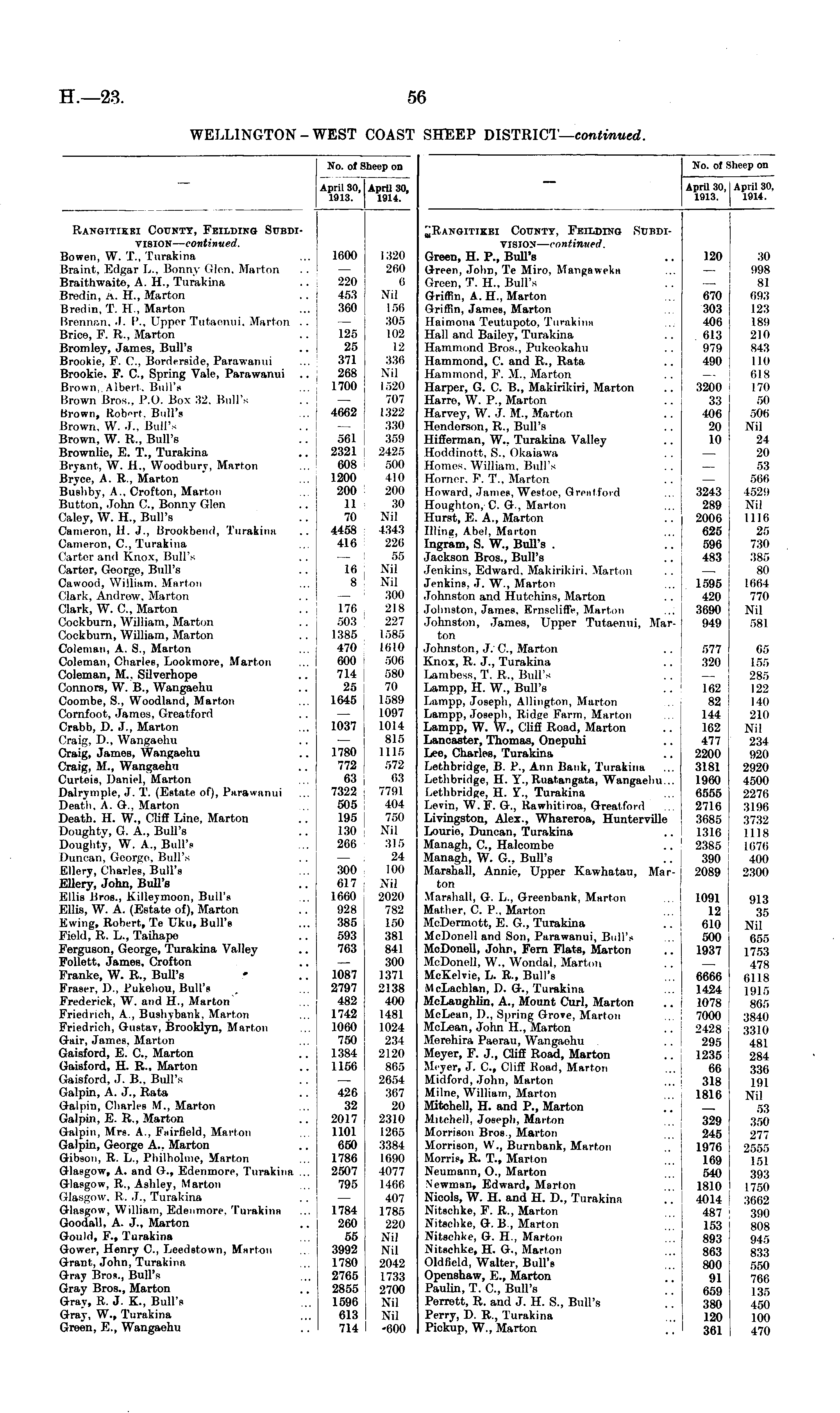 No. of Sheep on April 30,; April 30, 1913. 1914. County, Feilding Subdivision— continued. Green, H. P., Bull's Green. John, Te Miro, Mangaweka Green, T. H„ Bull's Griffin, A. H., Marton Griffin, James, Marton Haimona Teutupoto, Turakina Hall and Bailey, Turakina Hammond Bros.. Pukeokahu Hammond, C. and R., Rata Hammond, I''. M.. Marton Harper, G. C. B., Makirikiri, Marton Harro, W. P., Marton Harvey, W. J. M., Marton Henderson, R., Bull's Hifferman, W., Turakina Valley Hoddinott. S.. Okaiawa Homes. William. Bull's Horner, P. T., Marton Howard, James, Westoe, Greatfoid Houghton, C. G, Marton Hurst, E. A., Marton Illine, Abel, Marton Ingram, S. W., Bull's . Jackson Bros., Bull's Jenkins. F.dward. Makirikiri. Marton Jenkins, J. W., Marton Johnston and Hutehins, Marton Johnston, James. Ernscliffe, Marton Johnston, James, Upper Tutaenui, Marton Johnston, J. ft, Marton Knox, R. J., Turakina Lambess, T. R„ Bull's Lampp, H. W., Bull's Lampp, Joseph, Allington, Marton Lampp, Joseph, Ridee Farm, Marton Lampp, W. W., Cliff Road, Marton Lancaster, Thomas, Onepuhi Lee, Charles, Turakina Lethbridge, B. P., Ann Bank, Turakina Lethbridge, H. V., Ruatangata, Wangaehu... Lethbridge, H. V., Turakina Levin, W. F. G., Rawhitiroa, Greatfoid Livingston, Alex., Whareroa, Hunterville Lourie, Duncan, Turakina Managh, ft, Halcombe Managh, W. G., Bull's Marshall, Annie, Upper Kawhatau, Marton Marshall, G. L., Greenbank, Marton Mather, C. P., Marton McDermott, E. G., Turakina McDonell and Son, Parawanui, Bull's McDonell, John, Fern Flats, Marton McDonell, W.. Wondal, Marton McKelvie, L. R., Bull's McLachlan, D. G., Turakina McLaughlin, A., Mount Curl, Marton McLean, I)., Spring Grove, Marlon McLean, John H., Marton Merehira Paerau, Wangaohu Meyer, F. J., Cliff Road, Marton Meyer, J. ft, Cliff Road, Marton Midford, John, Marton Milne, William, Marton Mitchell, H. and P., Marton Mitchell, Joseph, Marton Morrison BroB., Marton Morrison, W., Burnbank, Marton Morris, R. T., Marton Neumann, O., Marton Newman, Edward, Marton Nicols, W. H. and H. D., Turakina Nitschke, F. R., Marton Nitscbke, G. B., Marton Nitschke, G. H., Marton Nitschke, H. G., Marton Oldfield, Walter, Bull's Openshaw, E., Marton Paulin, T. ft, Bull's Perrett, R. and J. H. S., Bull's Perry, D. R., Turakina Pickup, W., Marton 120 670 303 406 613 979 490 3200 33 406 20 10 3243 289 2000 625 596 483 1595 420 3690 949 577 320 102 82 144 162 477 2200 3181 1960 6555 2716 3685 1316 2385 390 2089 30 998 81 093 123 189 210 843 110 618 170 50 500 Nil 24 20 53 506 452!) Nil 1116 25 730 385 80 1664 770 Nil 581 05 155 285 122 140 210 Nil 234 920 2920 4500 2276 3196 3732 1118 1076 400 2300 1091 12 010 500 1937 913 35 Nil 055 1753 478 6118 1915 865 3840 3310 481 284 330 191 Nil 53 350 277 2555 151 393 1750 3662 390 808 945 833 550 766 135 450 100 470 6666 1424 1078 7000 2428 295 1235 66 318 1816 329 245 1976 169 540 1810 4014 487 153 893 863 800 91 659 380 120 361