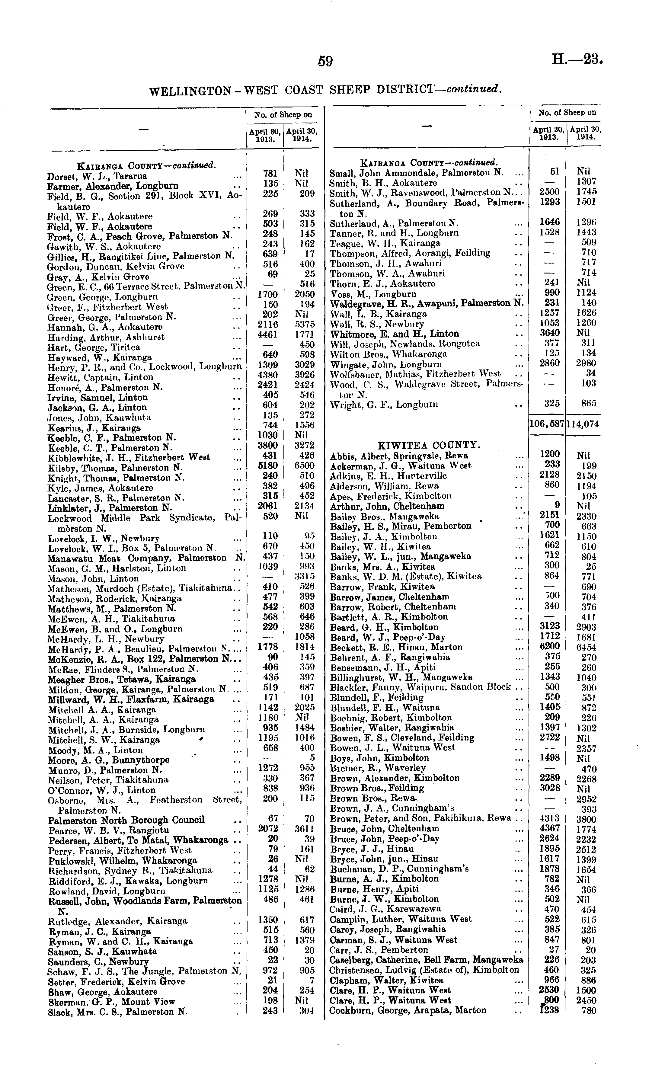 No. of Sheep on April 30, April 30, 1913. 1914. Kaibanga County— continued. Dorset, W. L., Tararua Farmer, Alexander, Longburn Field, B. G., Soction 291, Block XVI, Aokautere Field, W. F., AokaulenField, W. F., Aokautere Frost, C. A., Peach Grove, Palmerston N. Gawith, W. 8., Aokautere Gillies, II., Rangitikei Line, Palmerston N. Gordon, Duncan. Kelvin Grove Gray, A., Kelvin Grove Green, E. ft, 06 Terrace Street, Palmerston N. Green, George, Longburn Greer, F., Fitzherbert West Greor, George, Palmerston N. Hannah, G. A., Aokautere Harding, Arthur, Ashhurst Hart. George, Tiritea Hayward, W., Kairanga Henry, P. R., and Co., Lockwood, Longburn Hewitt, Captain. Linton Honore, A., Palmerston N. Irvine, Samuel, Linton Jackson, G. A., Linton Jones, John, Kauwhata Kearins, J., Kairanga Keeble, C. F., Palmerston N. Keeble, 0. T., Palmerston N. Kibblewhite, J. H., Fitzherbert West Kilaby, Thomas, Palmerston N. Knight, Thomas, Palmerston N. Kyle, .lames. Aokautere Lancaster, S. R., Palmerston N. Linklater, J., Palmerston N. Lockwood Middle Park Syndicate, Palmerston N. Lovelock, I. W., Newbury Lovelock, W. I., Box 5, Palmerston N. Manawatu Meat Company, Palmerston N. Mason, G. M., Harlston, Linton Mason, John, Linton Matheson, .Murdoch (Estate), Tiakitahuna.. Matheson, Roderick. Kairanga Matthews, M., Palmerston N. McEweti, A. H., Tiakitahuna McKwen, B. and O., Longburn Mellardv. L. II., Newbury McHardy, P. A, Beaulieu, Palmerston N. ... McKenzie, R. A., Box 122, Palmerston N... McRae, Flinders 8., Palmerston N. Meagher Bros., Tetawa, Kairanga Mildon, George, Kairanga, Palmerston N. ... Mill ward, W. H., Flaxfarm, Kairanga Mitchell A. A., Kairanga Mitchell, A. A., Kairanga Mitchell, J. A., Burnside, Longburn .Mitchell, S. W., Kairanga Moody, M. A., Linton Moore, A. G., Bunnythorpe Munro, D., Palmerston N. Ncilseti, Peter, Tiakitahuna O'Connor, W. J., Linton Osborne, Mis. A., Featherston Street. Palmerston N. Palmerston North Borough Council Pearce, W. B. V., Rangiotu Pedersen, Albert, Te Matai, Whakaronga .. Perry, Francis, Fitzherbert W( st Pukiowski, WUhelm, Whakaronga Richardson, Sydney R., Tiakitahuna Riddiford, E. J., Kawaka, Longburn Rowland, David, Longburn Russell, John, Woodlands Farm, Palmerston N. Hut lodge. Alexander, Kairanga Ryman, J. ft, Kairanga Ryiniin, W. and C. H„ Kairanga Sanson, S. J., Kauwhata Saunders, ft, Newbury Schaw, F. J. S., The Jungle, Publicist on N, Setter, Frederick, Kelvin Grove Shaw, George, Aokautere Skerman. G. P., Mount View Slack, Mrs. C. S., Palmerston N. ... I 781 Nil 136 Nil 225 209 269 353 503 315 248 145 243 162 639 17 516 400 69 I 25 — j 510 1700 : 2050 150 194 202 Nil 2116 5376 4461 1771 — 450 640 598 1309 3029 4380 3920 2421 2424 405 546 604 202 136 272 744 1556 1030 Nil 3800 3272 431 : 426 5180 0500 240 510 382 496 315 452 2061 2134 520 Nil 1 K) 96 670 450 437 150 1039 993 — 3315 410 626 477 399 542 603 568 646 220 286 — 1058 1778 1814 90 146 406 359 435 397 519 687 171 101 1142 2025 1180 Nil 935 1484 1195 1010 658 400 — 6 1272 955 330 307 838 950 200 115 67 70 2072 381 I 20 39 79 101 26 Nil 44 62 1278 Nil 1125 1286 486 461 1350 017 515 560 713 1379 450 20 22 30 972 905 21 7 204 254 198 Nil 243 30 1